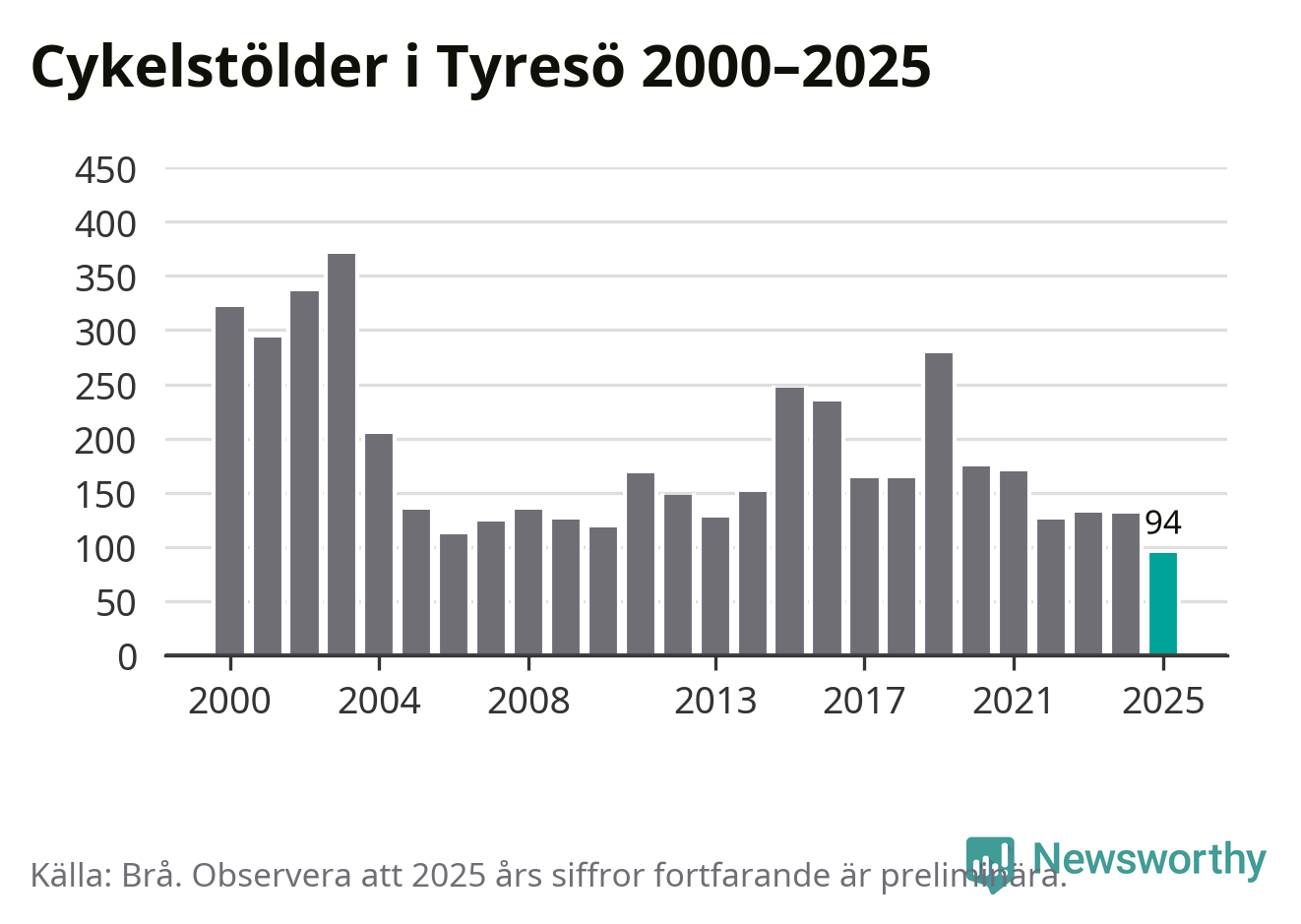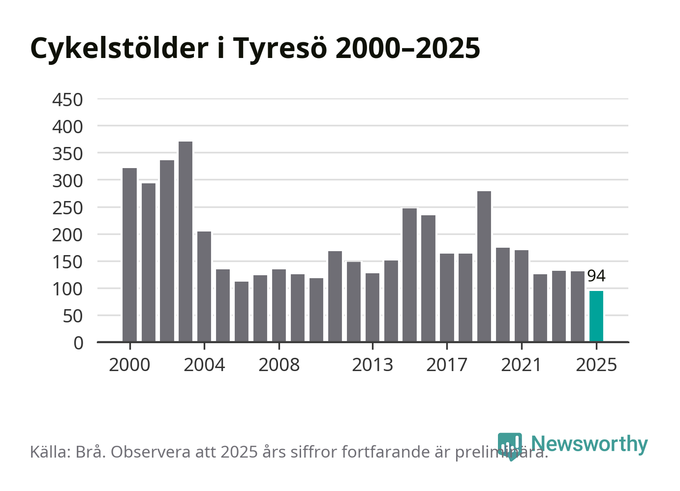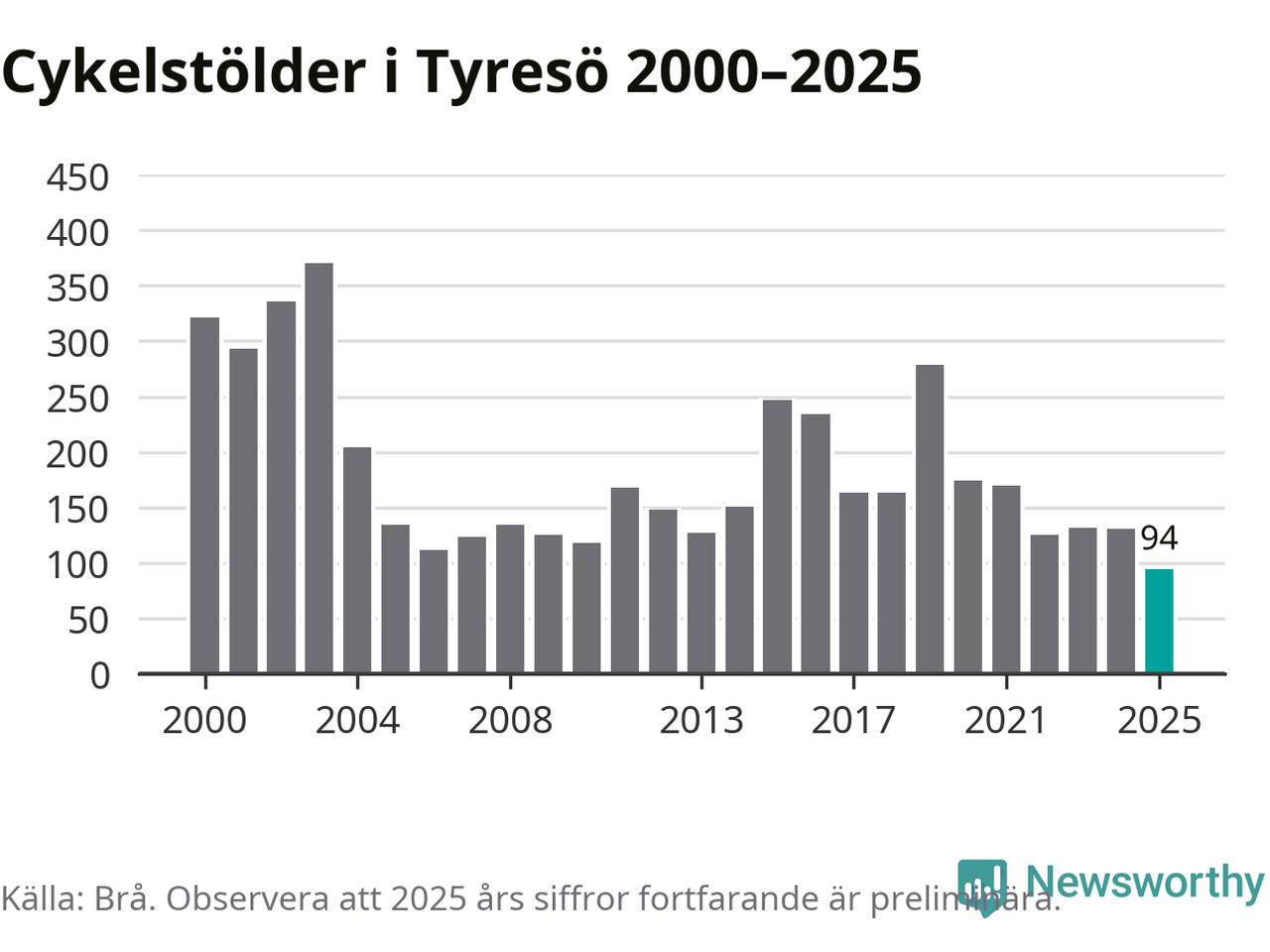 I Tyresö kommun noterades det lägsta antalet cykelstölder under hela 2000-talet år 2025, även om det fortfarande är preliminära siffror. Under de senaste 25 åren har det som mest anmälts 370 cykelstölder på ett år (2003).
