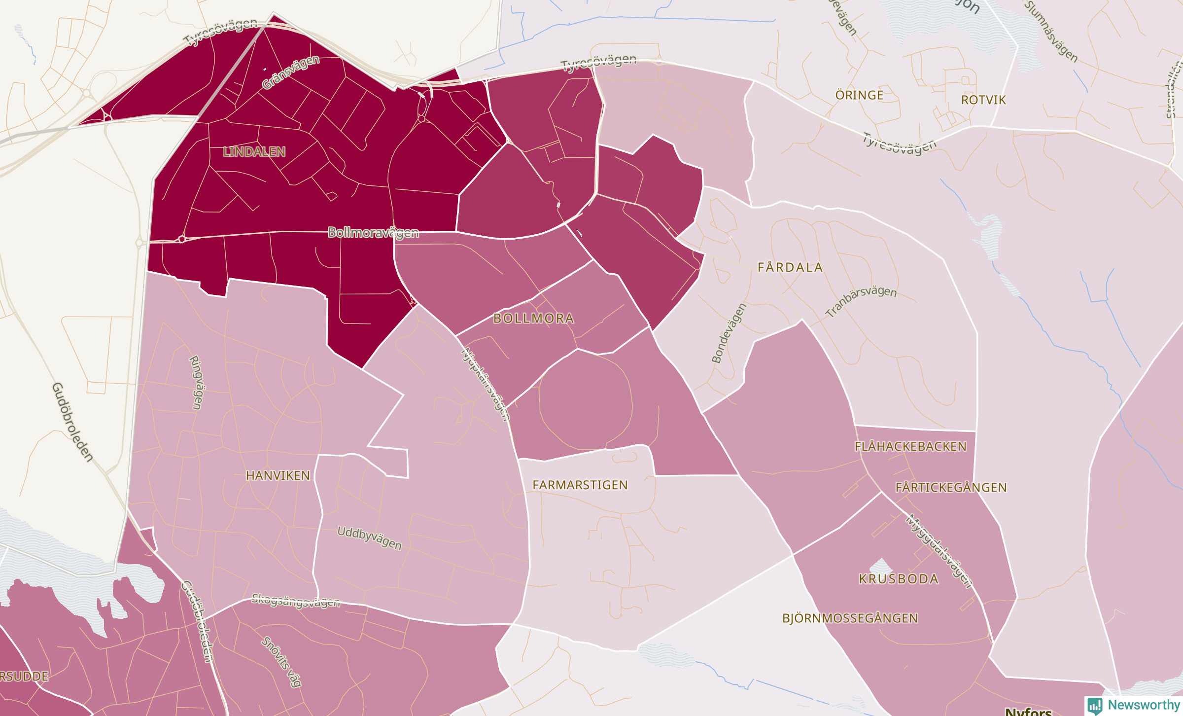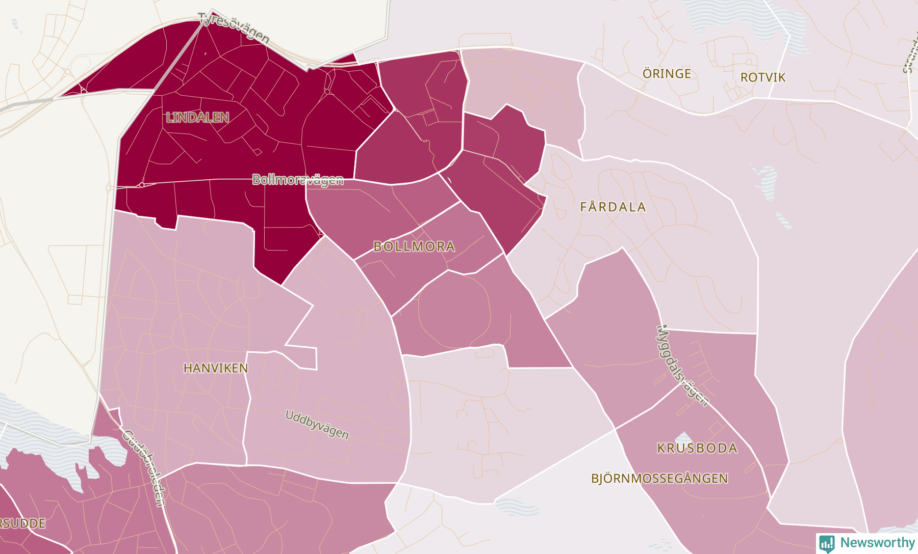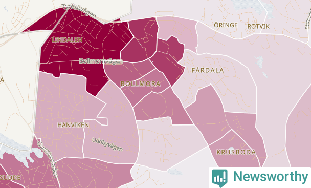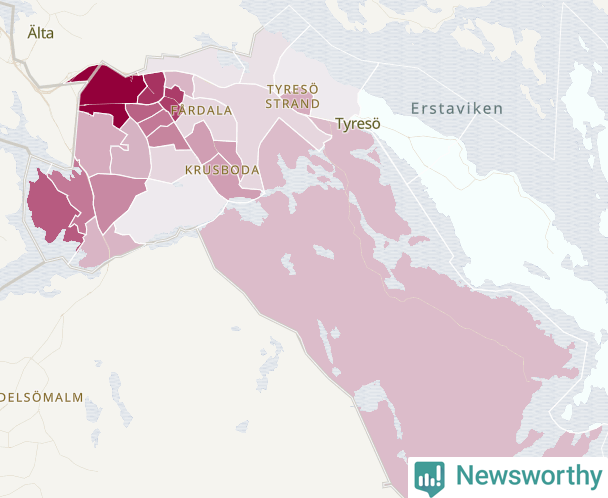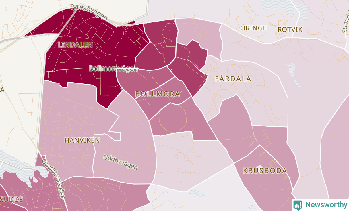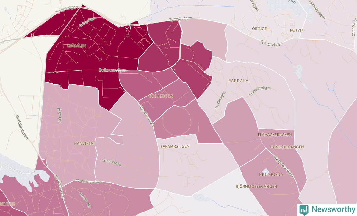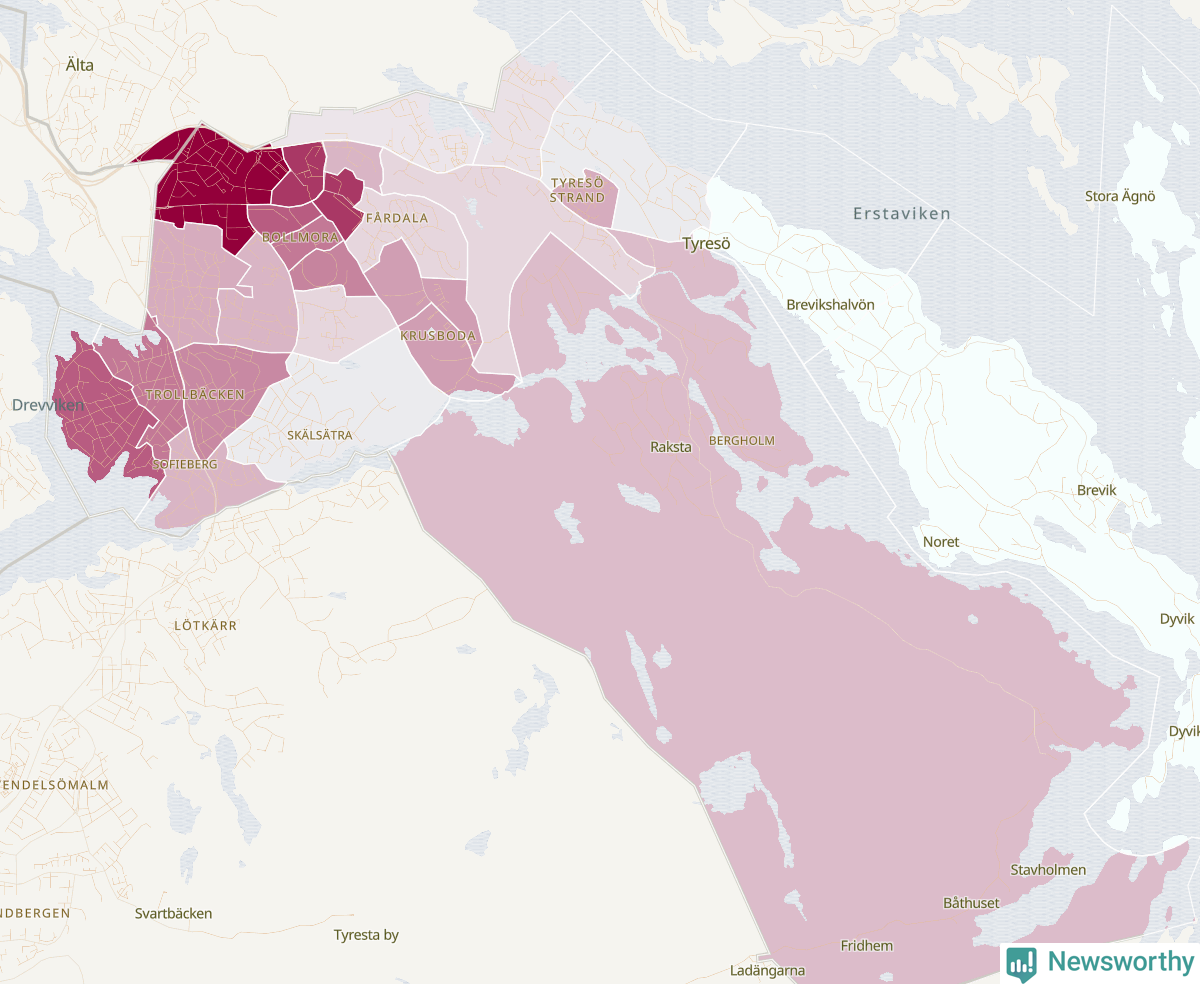 Men alla delar av Tyresö är inte lika hårt drabbade. Det visar data för de senaste fem åren, som Newsworthy har begärt ut från polisen. De anmälda stölderna har kopplats till SCB:s 26 statistiska områden i kommunen. Det rör sig om mellan en handfull och ett femtiotal anmälda stölder per område.