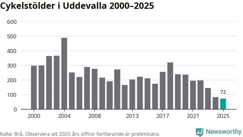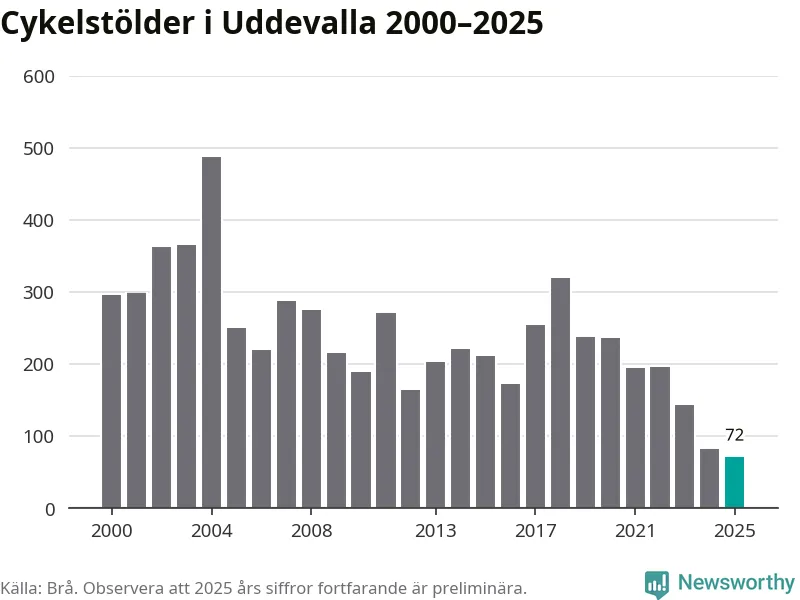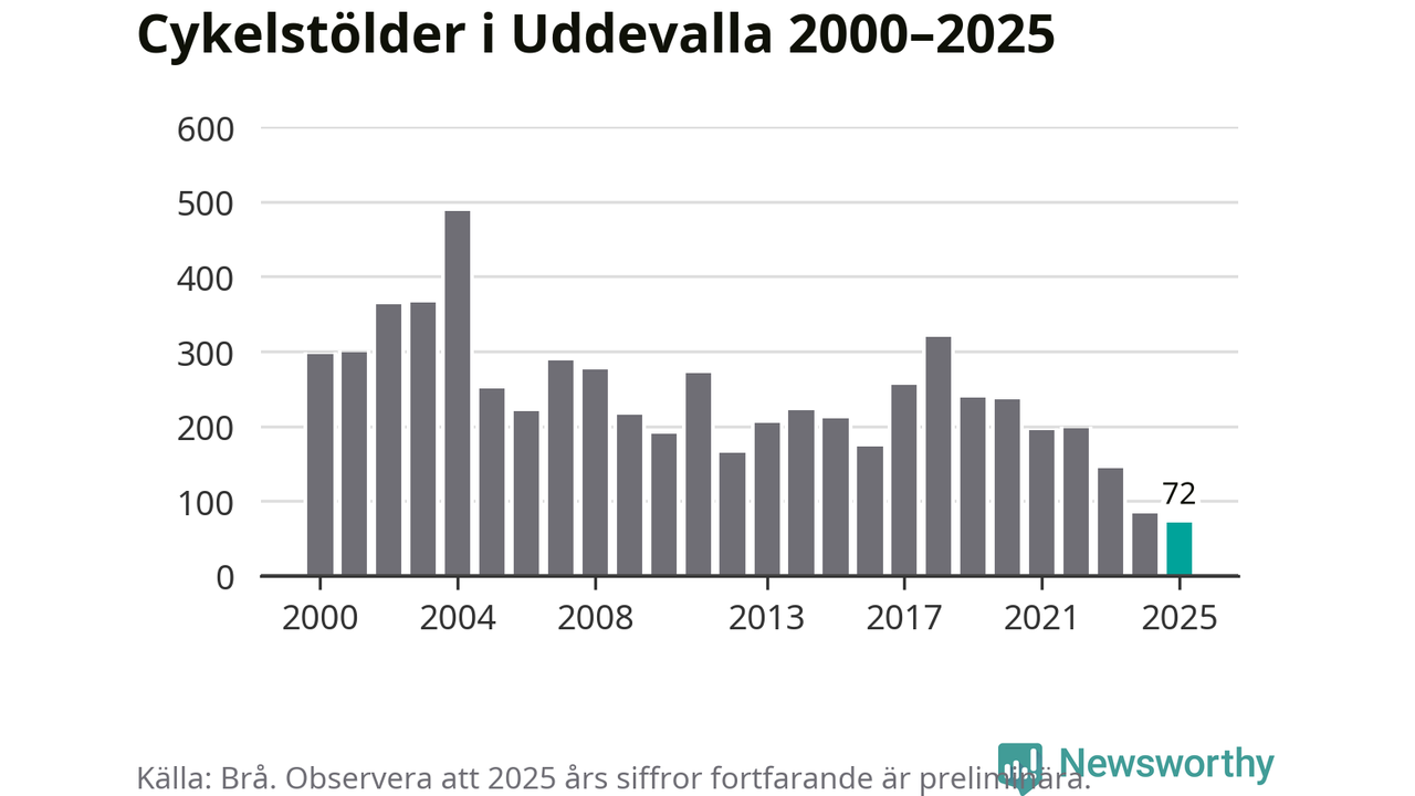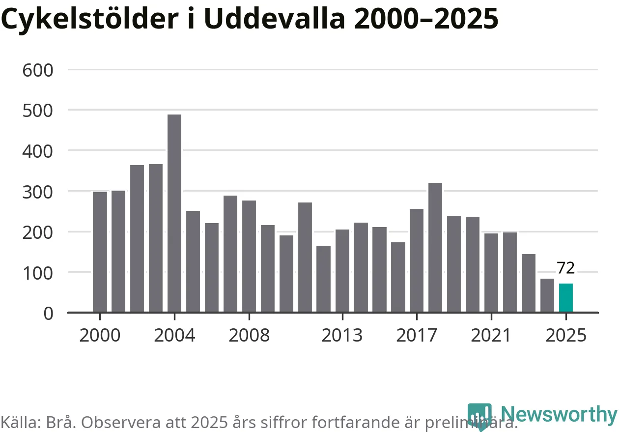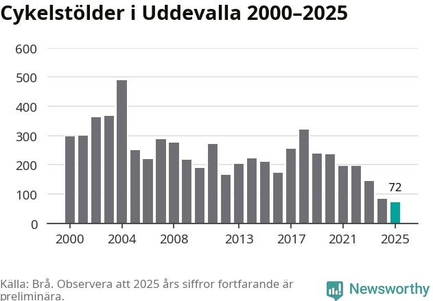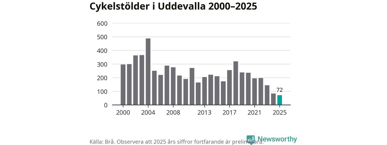 I Uddevalla kommun noterades det lägsta antalet cykelstölder under hela 2000-talet år 2025, även om det fortfarande är preliminära siffror. Under de senaste 25 åren har det som mest anmälts 488 cykelstölder på ett år (2004).