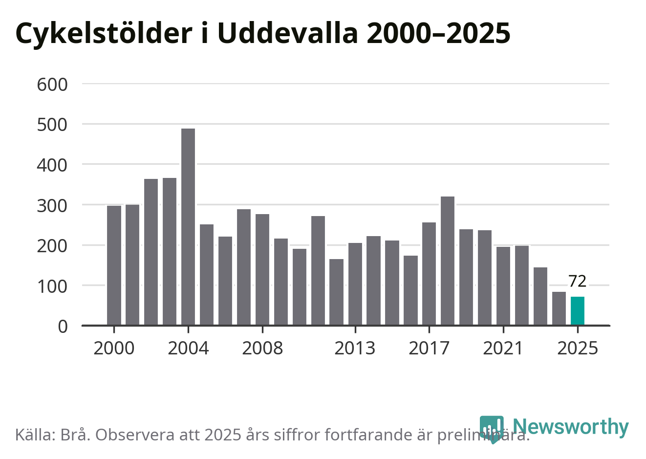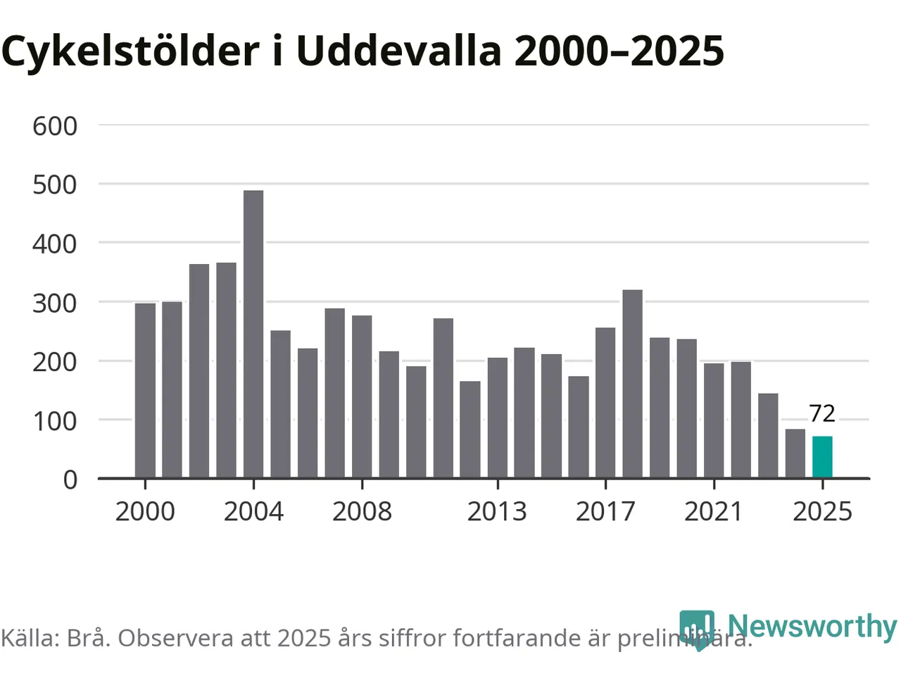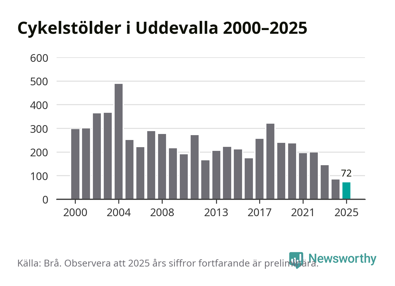 I Uddevalla kommun noterades det lägsta antalet cykelstölder under hela 2000-talet år 2025, även om det fortfarande är preliminära siffror. Under de senaste 25 åren har det som mest anmälts 488 cykelstölder på ett år (2004).