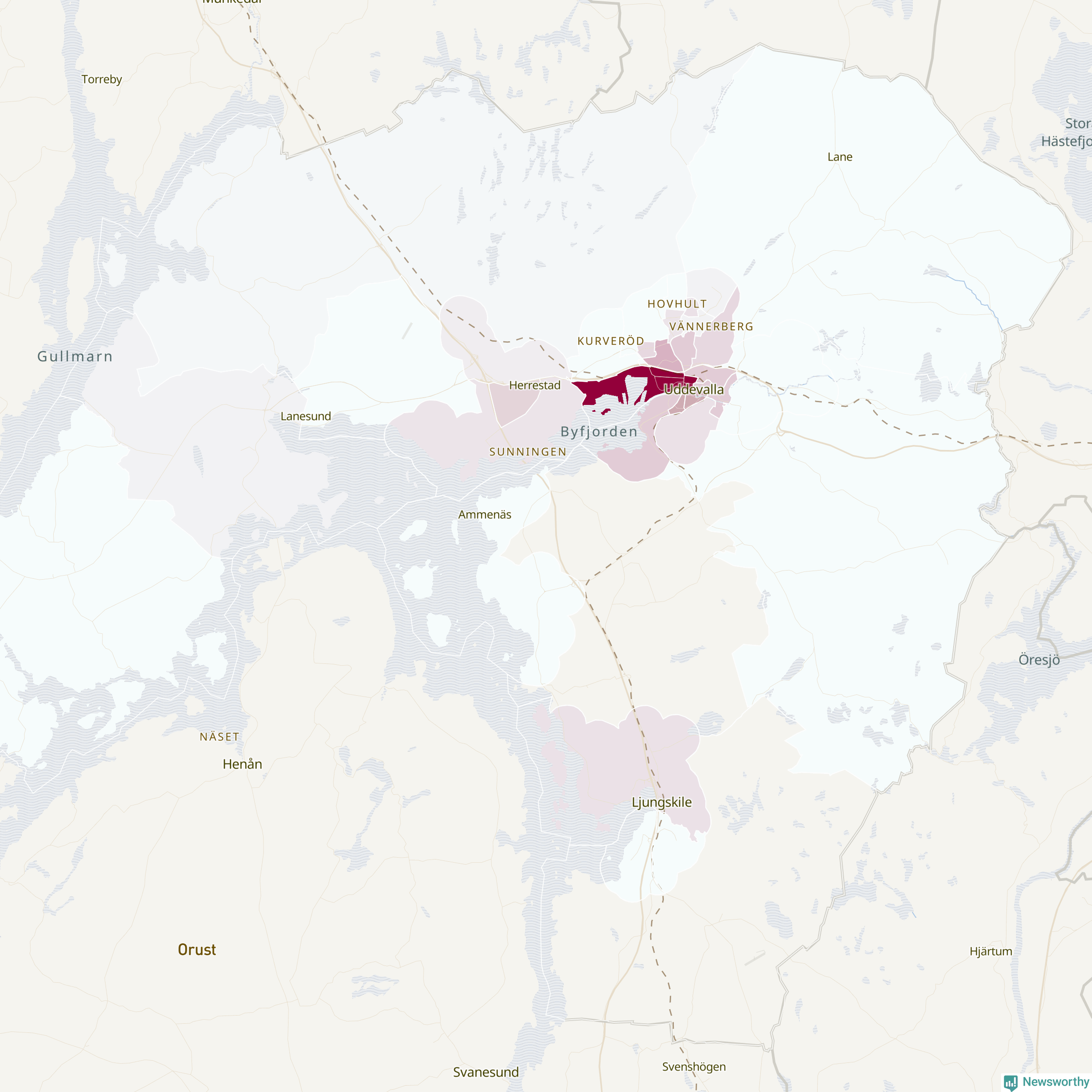 Men alla delar av Uddevalla är inte lika hårt drabbade. Det visar data för de senaste fem åren, som Newsworthy har begärt ut från polisen. De anmälda stölderna har kopplats till SCB:s 35 statistiska områden i kommunen. I två områden finns inga cykelstölder registrerade, men i de övriga rör det sig om mellan en handfull och drygt 100 anmälda stölder per område.