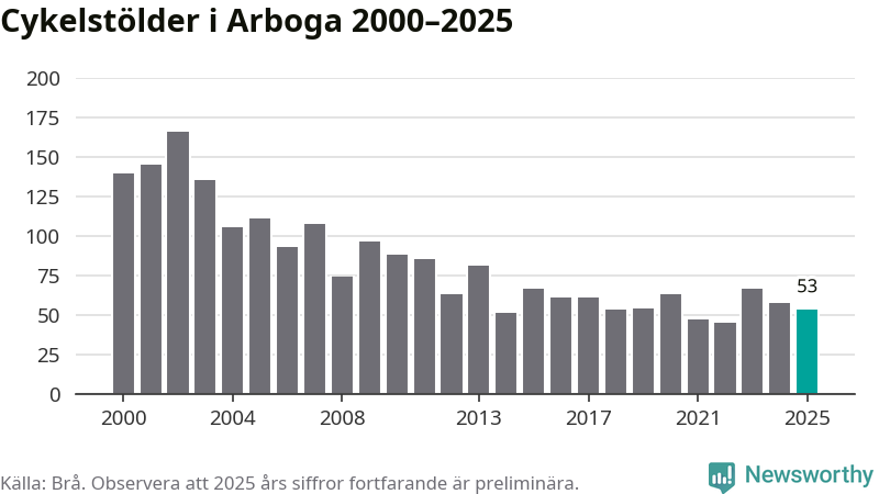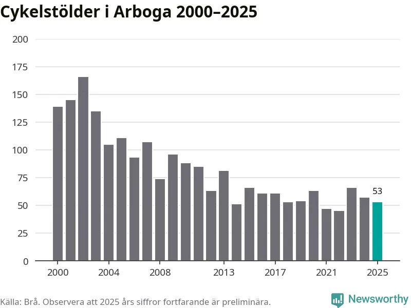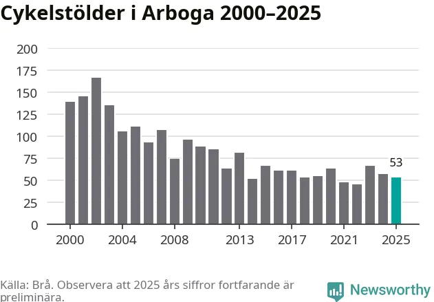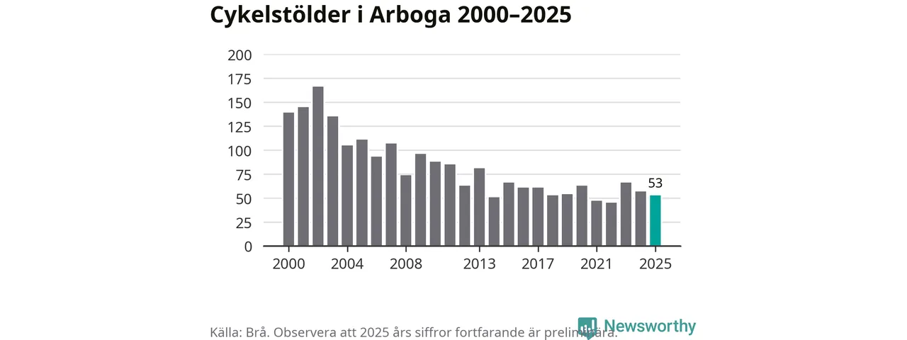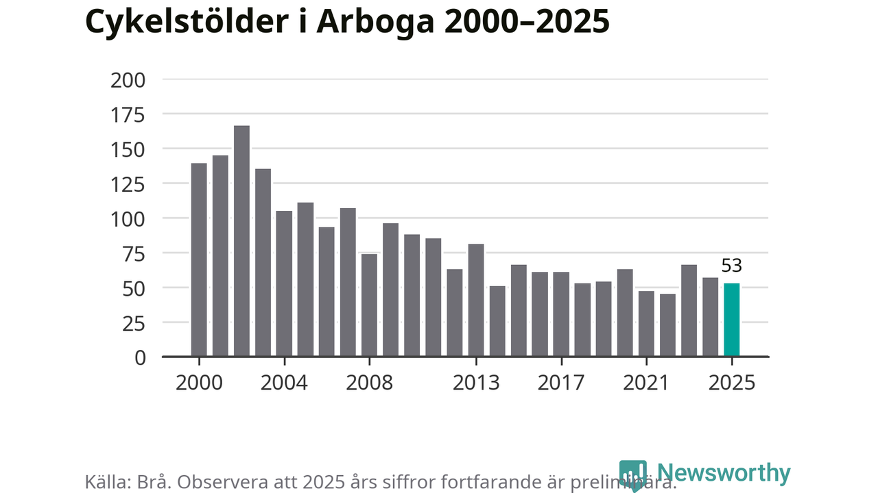 Av de 53 stöldanmälningar i Arboga 2025 gällde nio elcyklar, det motsvarar 17 procent. Brå särredovisar elcyklar sedan 2020 och i riket som helhet ökade anmälningarna om stulna elcyklar kraftigt de första åren, för att de senaste tre åren ha legat relativt stilla. Eftersom antalet cykelstölder totalt har minskat under samma tid har andelen elcyklar ökat. I fjol stod elcyklar för 28 procent av alla anmälda cykelstölder i landet.