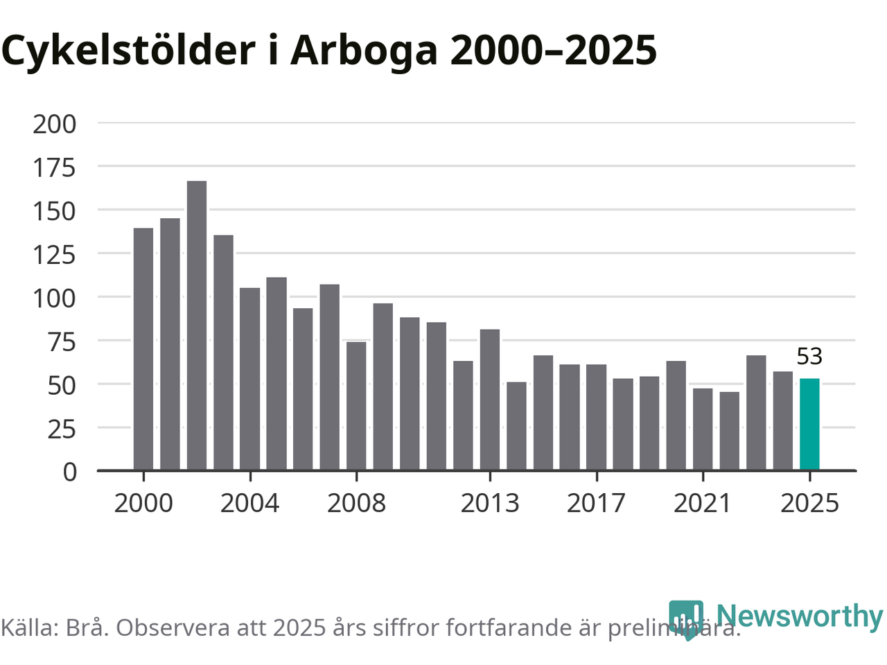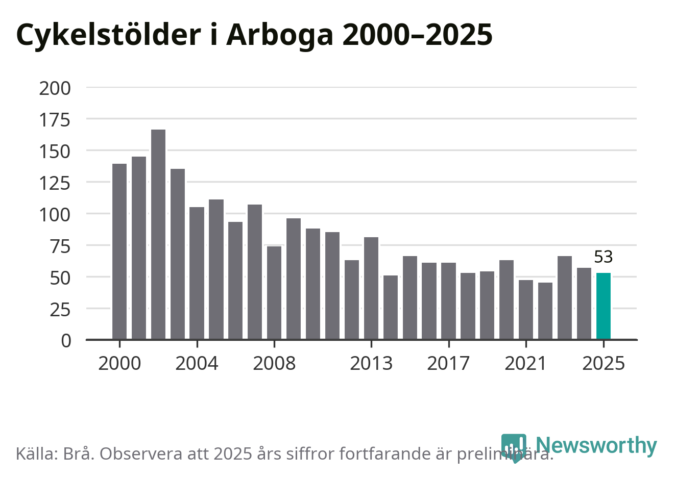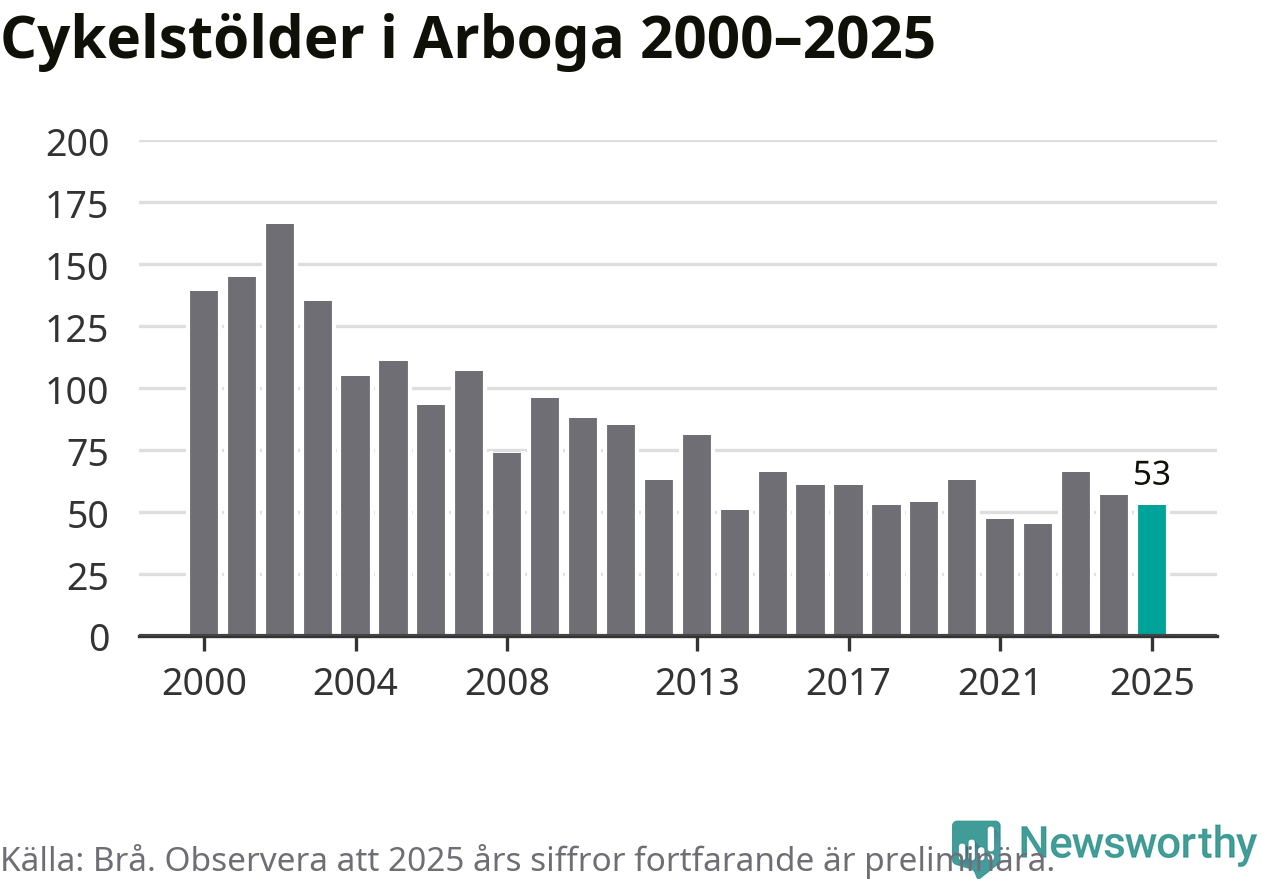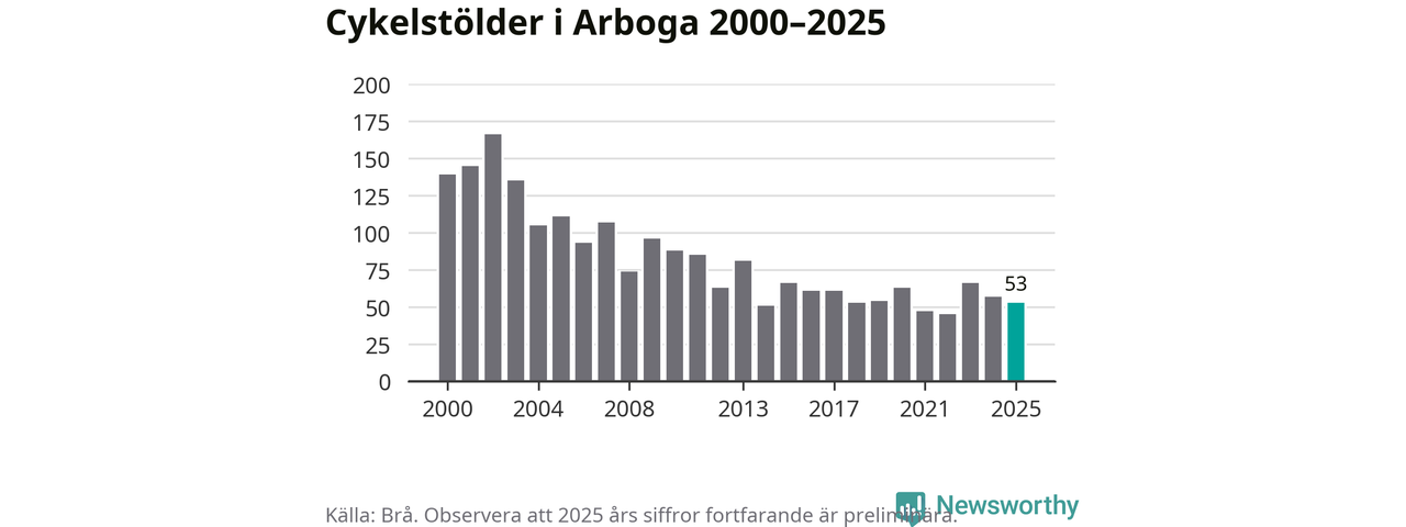 I Arboga kommun var antalet cykelstölder relativt få i en historisk kontext år 2025, även om det fortfarande är preliminära siffror. Under de senaste 25 åren har det som mest anmälts 166 cykelstölder på ett år (2002), som minst 45 stycken (2022).