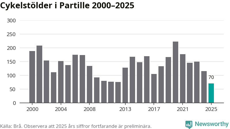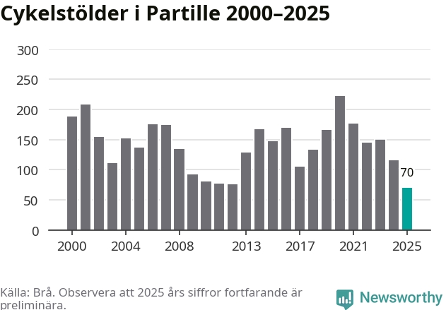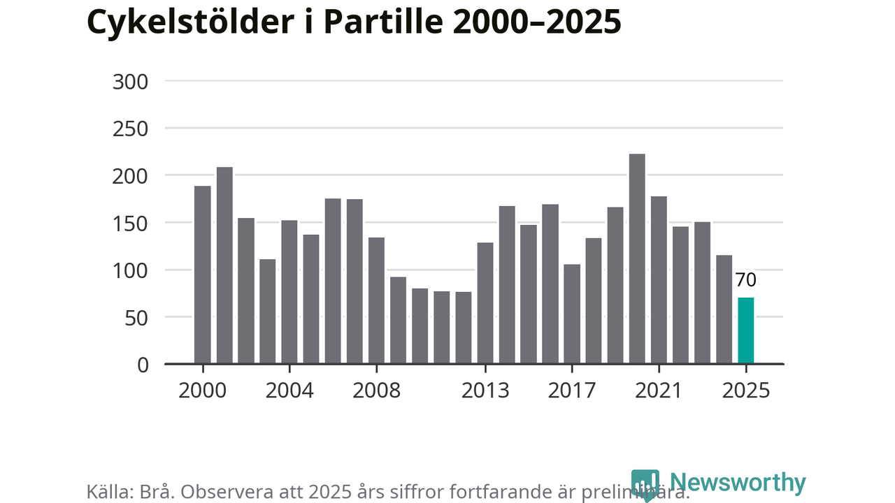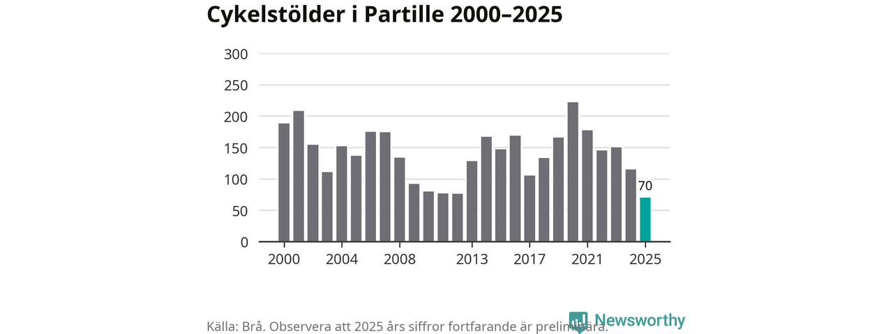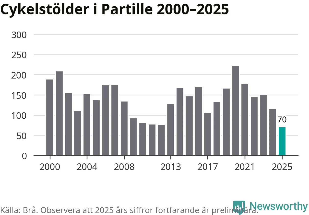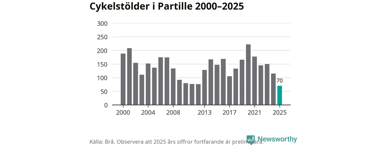 I Partille kommun noterades det lägsta antalet cykelstölder under hela 2000-talet år 2025, även om det fortfarande är preliminära siffror. Under de senaste 25 åren har det som mest anmälts 222 cykelstölder på ett år (2020).