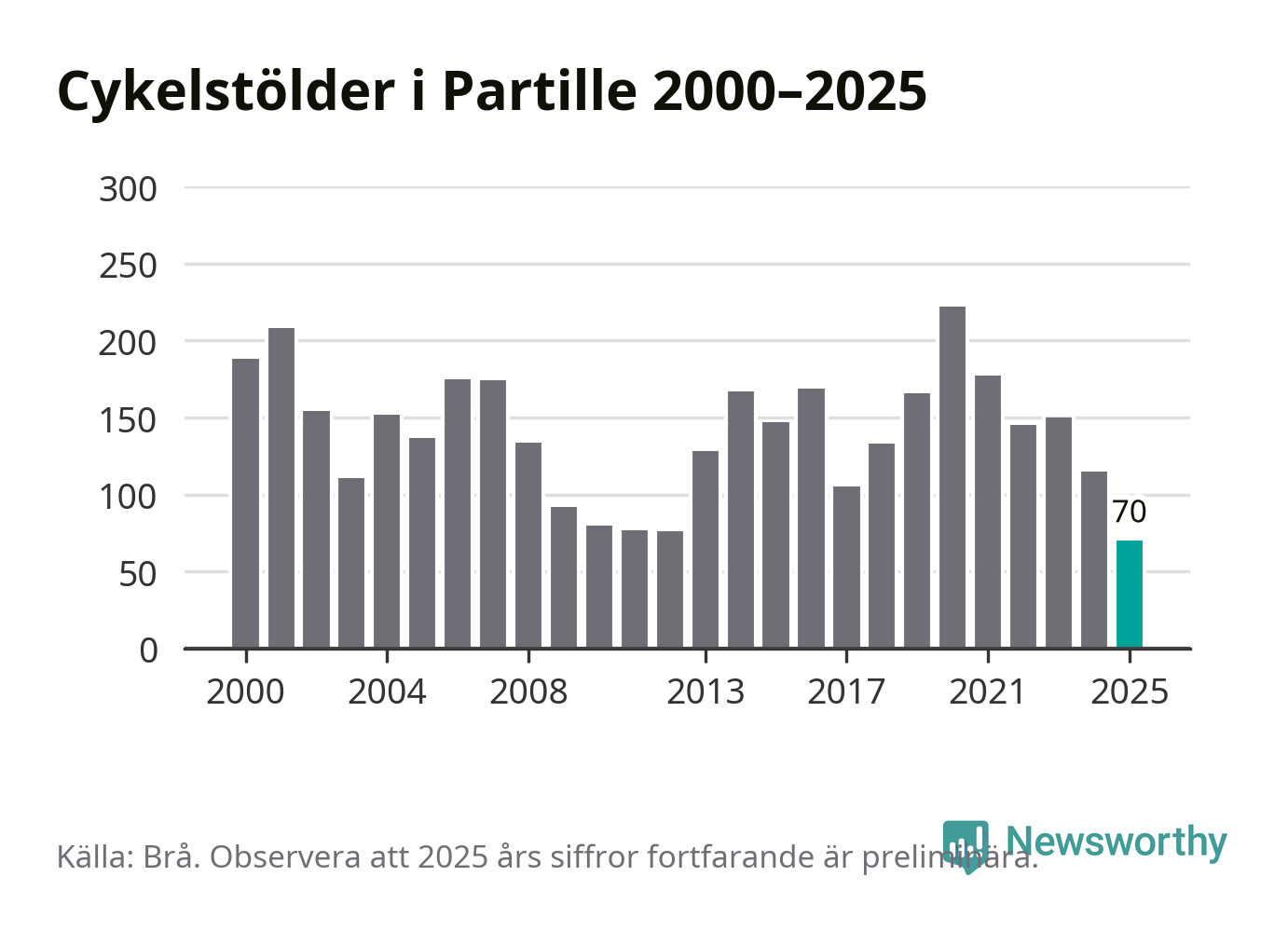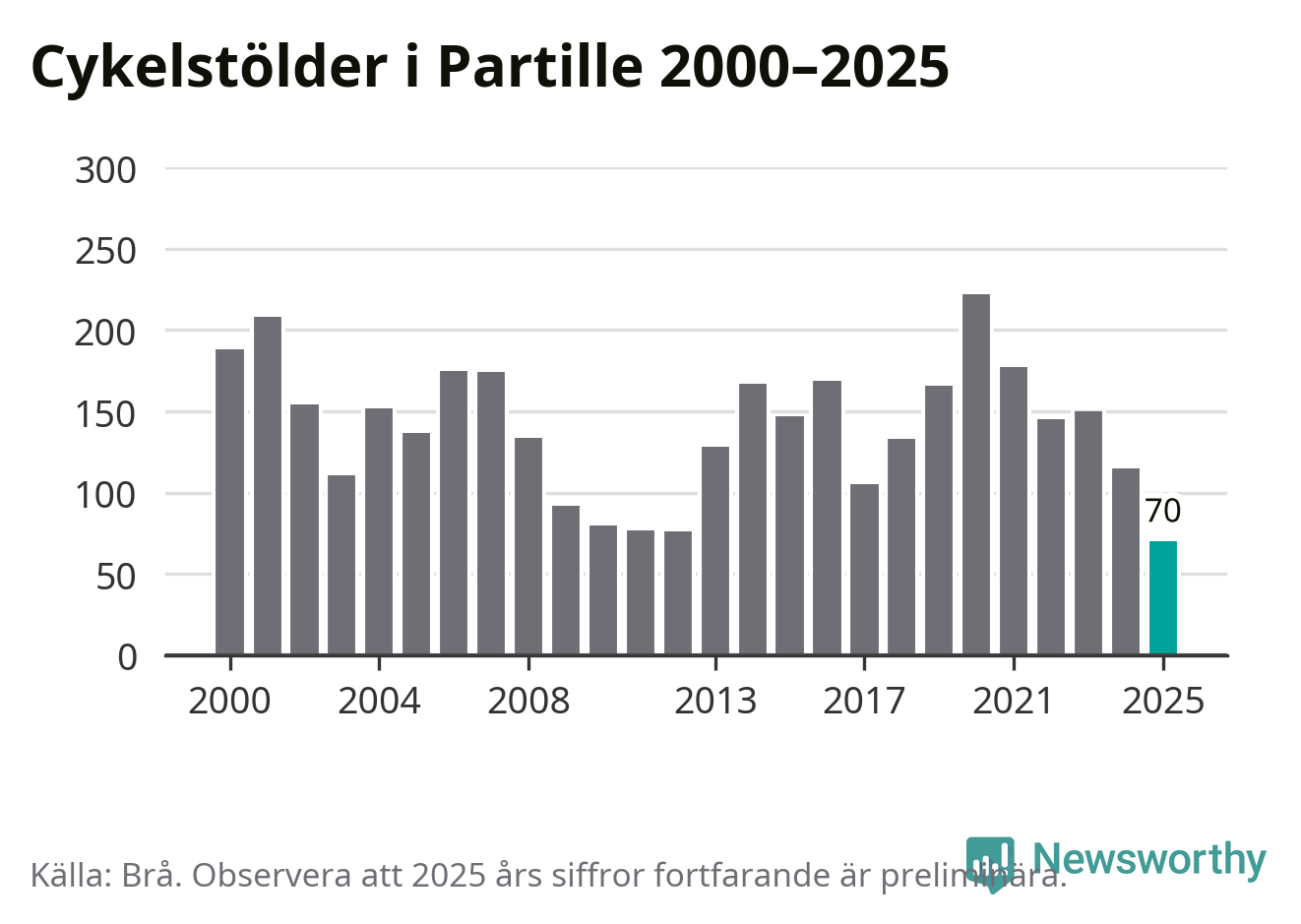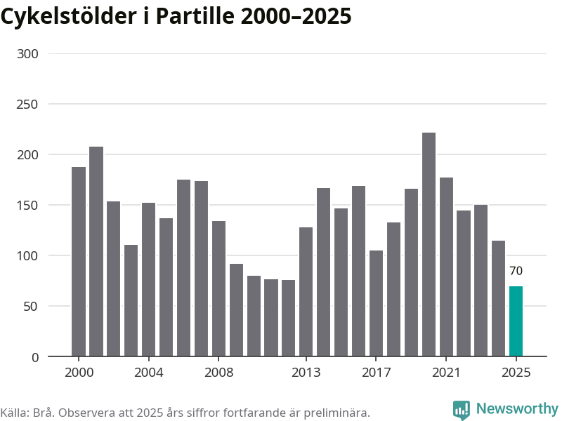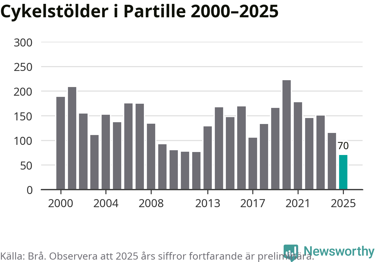I Partille kommun noterades det lägsta antalet cykelstölder under hela 2000-talet år 2025, även om det fortfarande är preliminära siffror. Under de senaste 25 åren har det som mest anmälts 222 cykelstölder på ett år (2020).