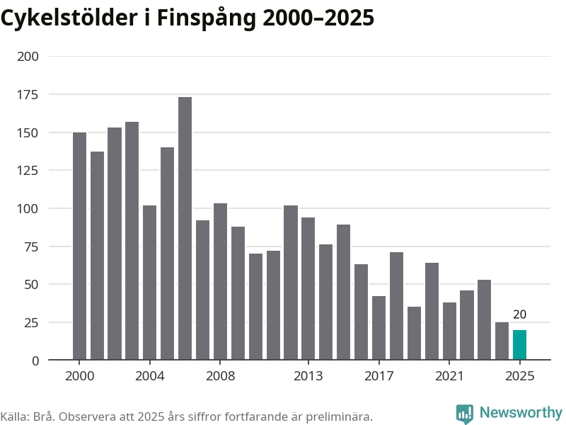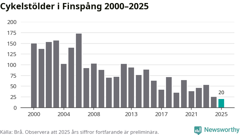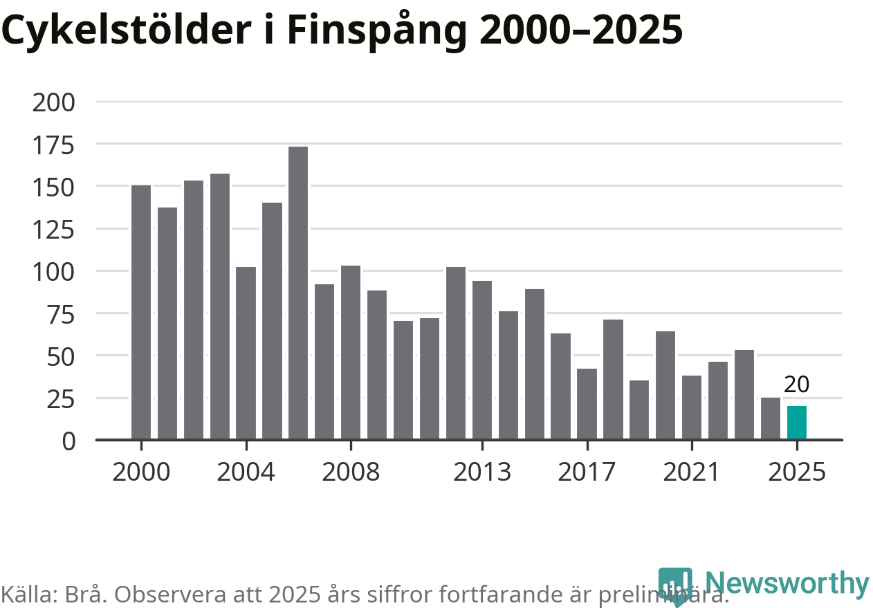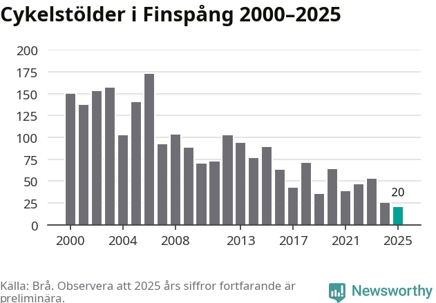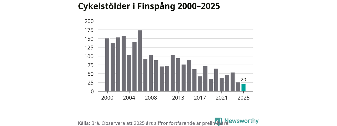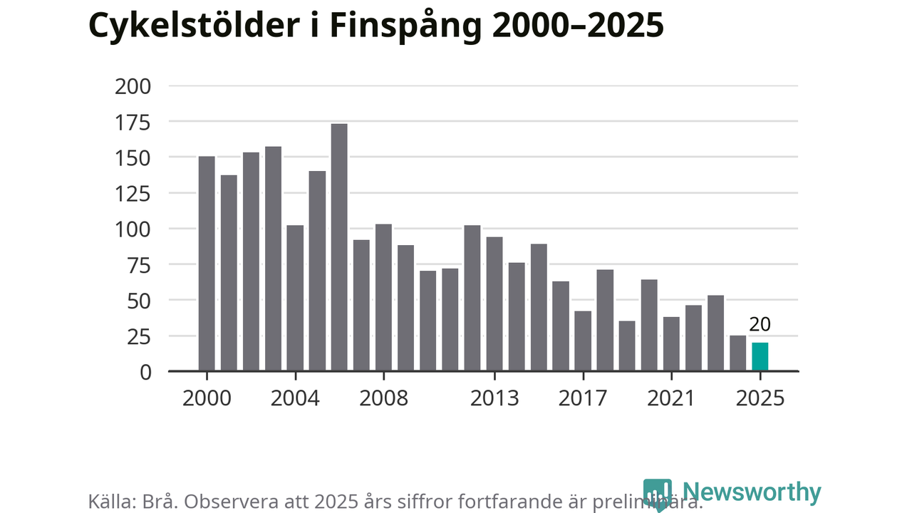 I Finspångs kommun noterades det lägsta antalet cykelstölder under hela 2000-talet år 2025, även om det fortfarande är preliminära siffror. Under de senaste 25 åren har det som mest anmälts 173 cykelstölder på ett år (2006).