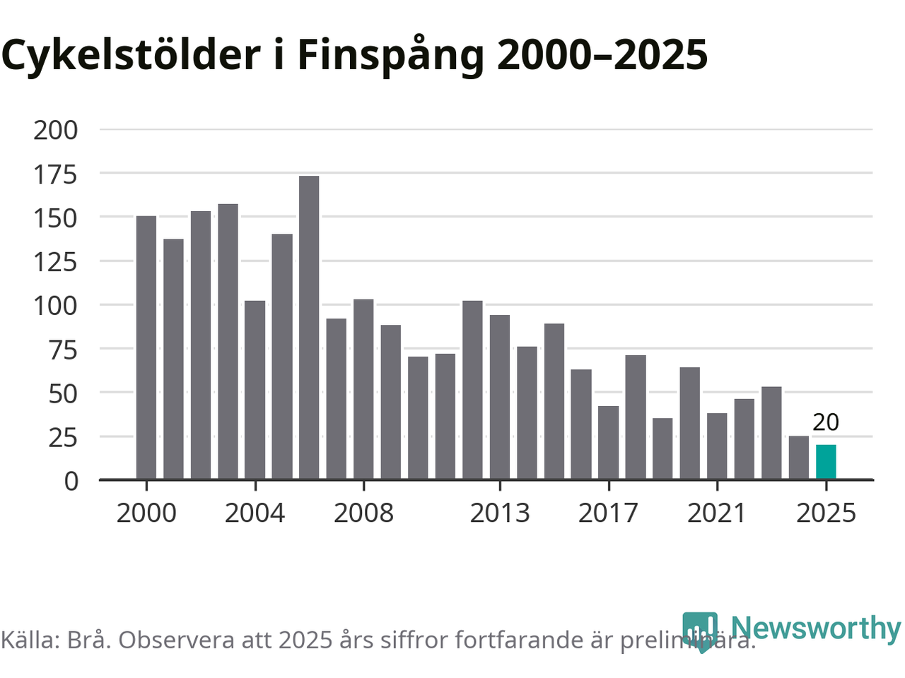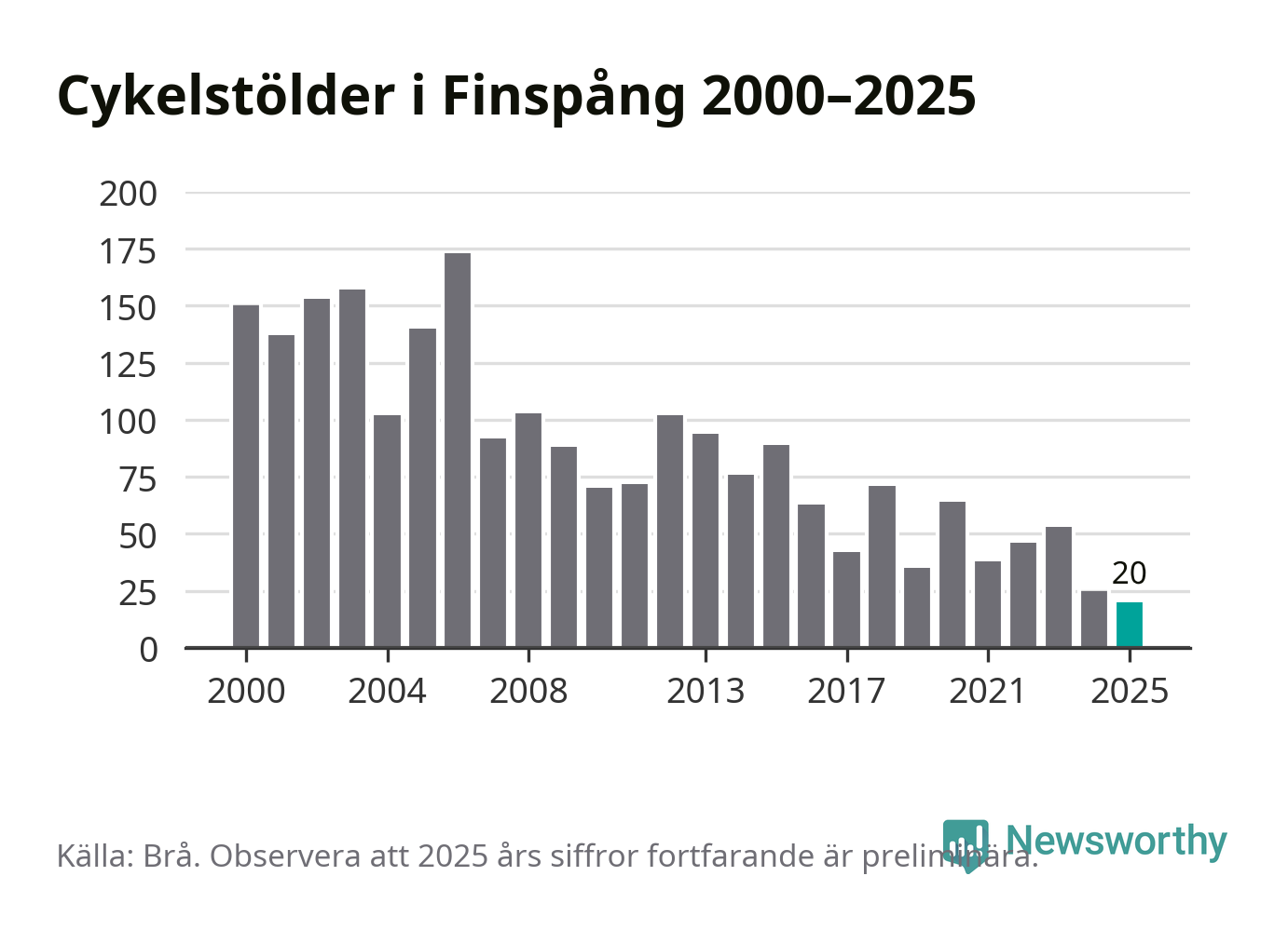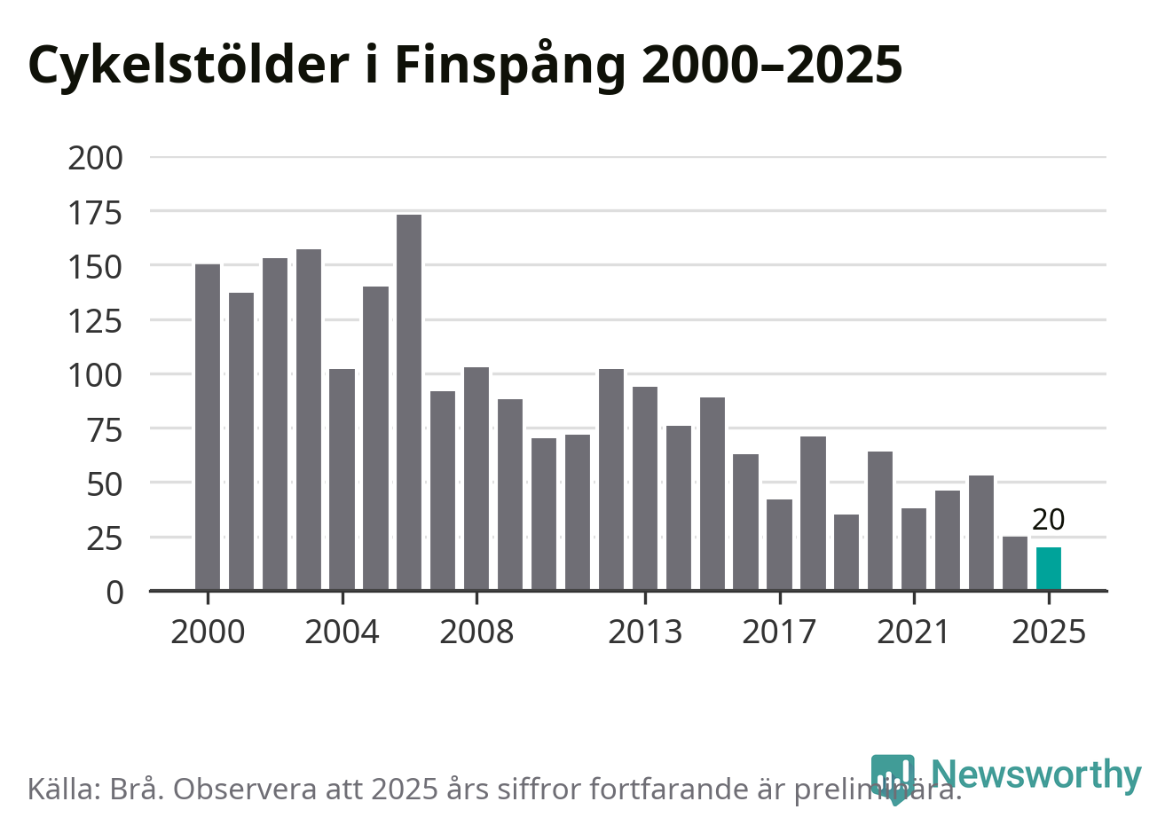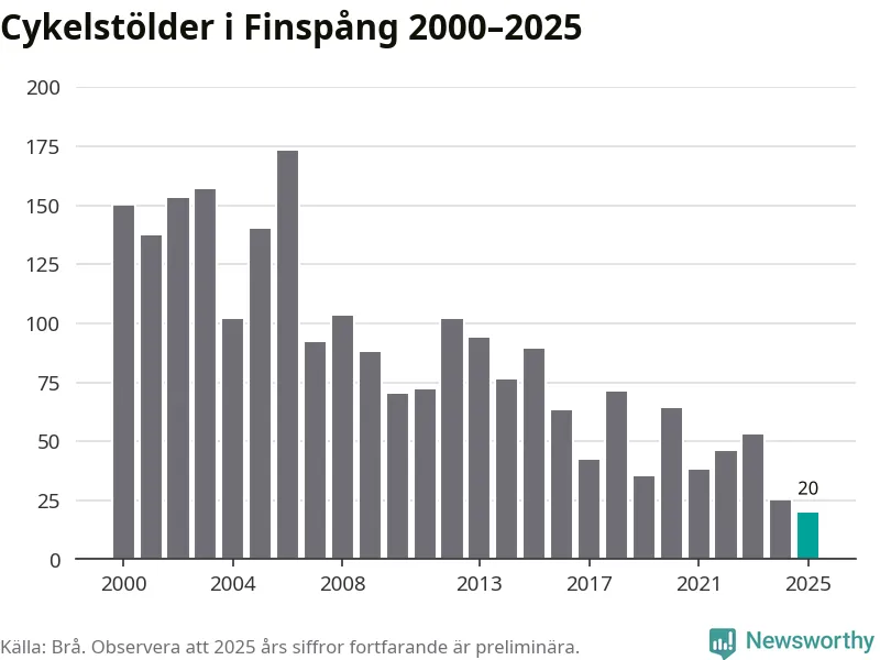 I Finspångs kommun noterades det lägsta antalet cykelstölder under hela 2000-talet år 2025, även om det fortfarande är preliminära siffror. Under de senaste 25 åren har det som mest anmälts 173 cykelstölder på ett år (2006).