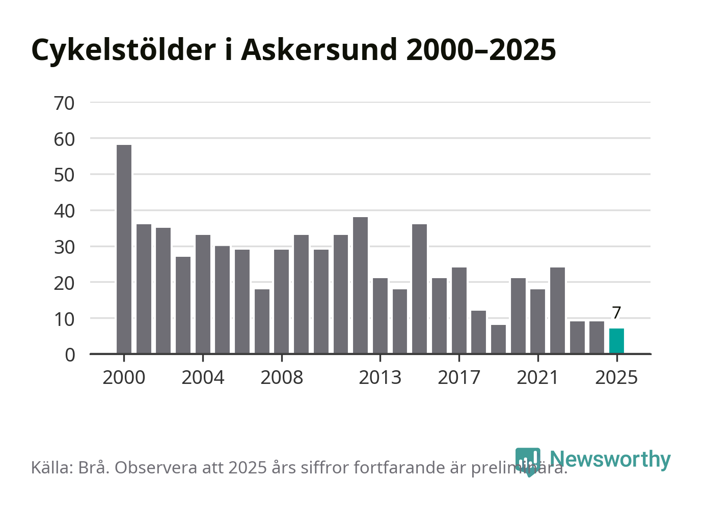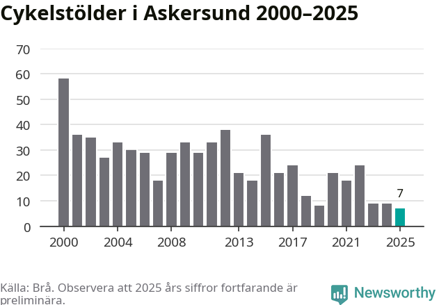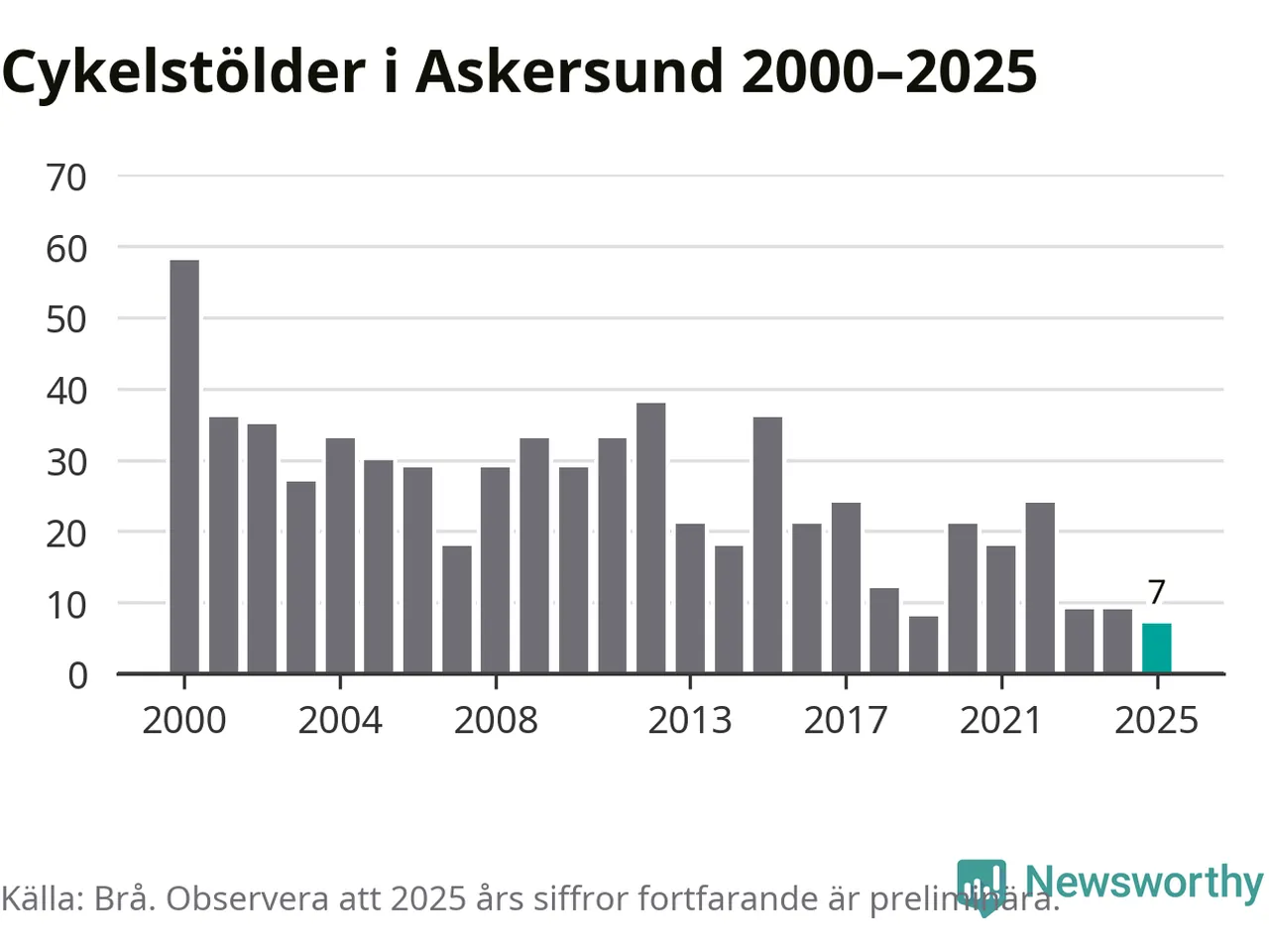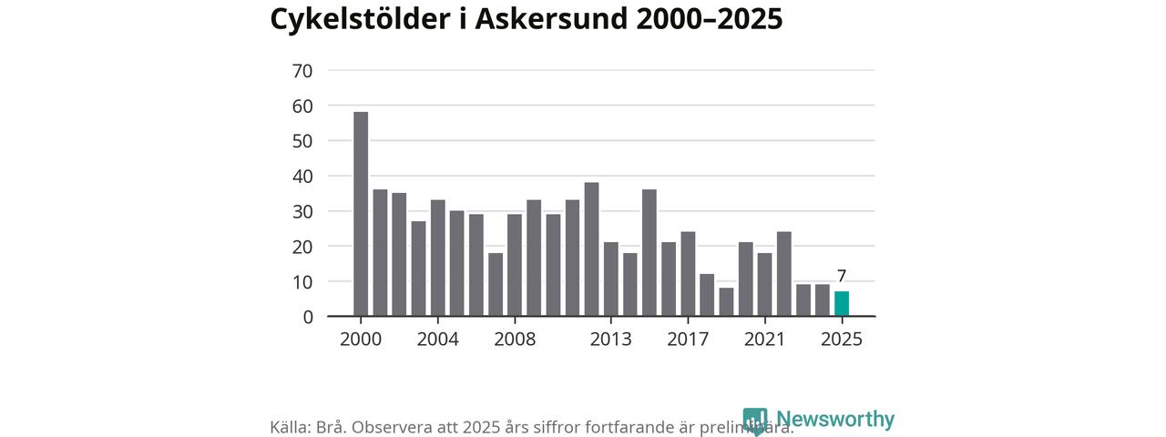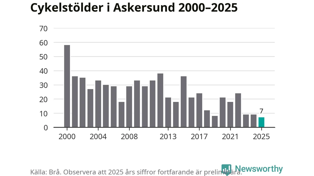 I Askersunds kommun noterades det lägsta antalet cykelstölder under hela 2000-talet år 2025, även om det fortfarande är preliminära siffror. Under de senaste 25 åren har det som mest anmälts 58 cykelstölder på ett år (2000).
