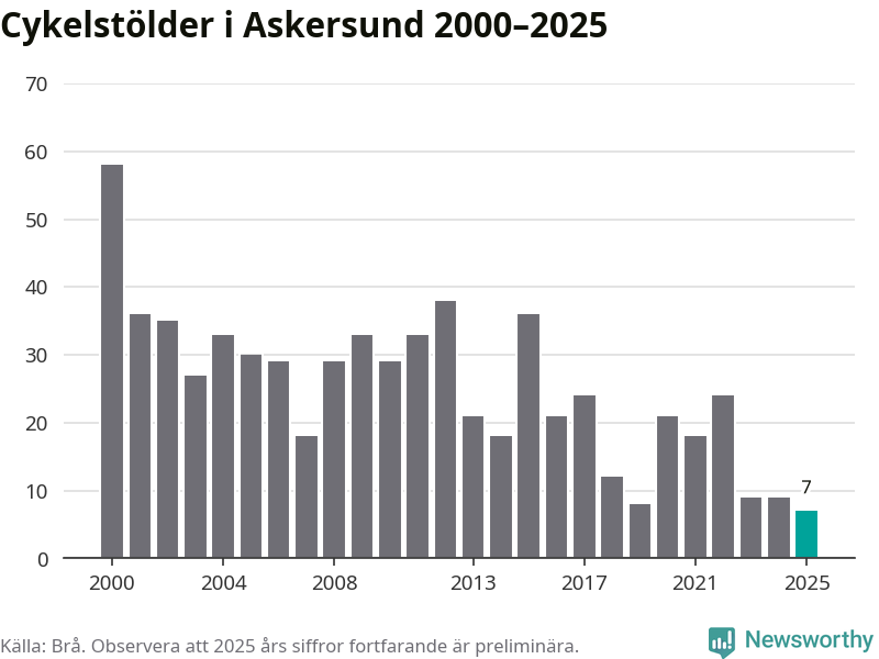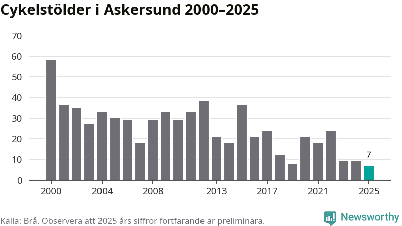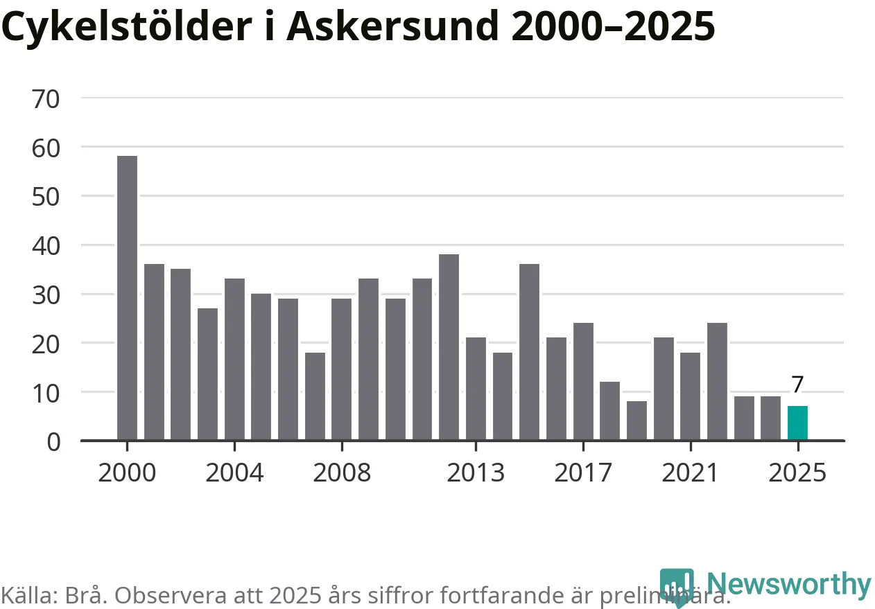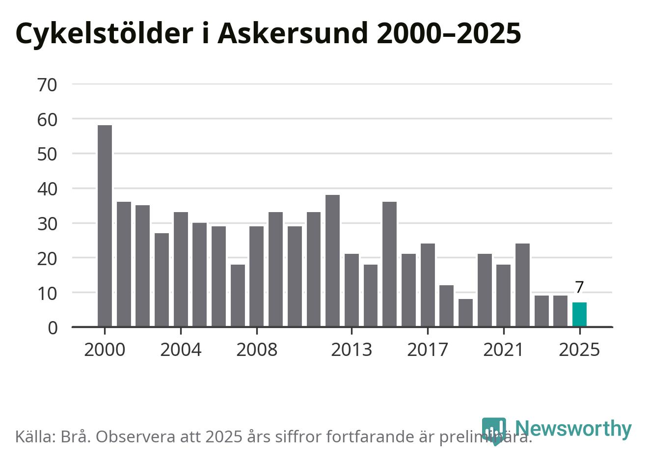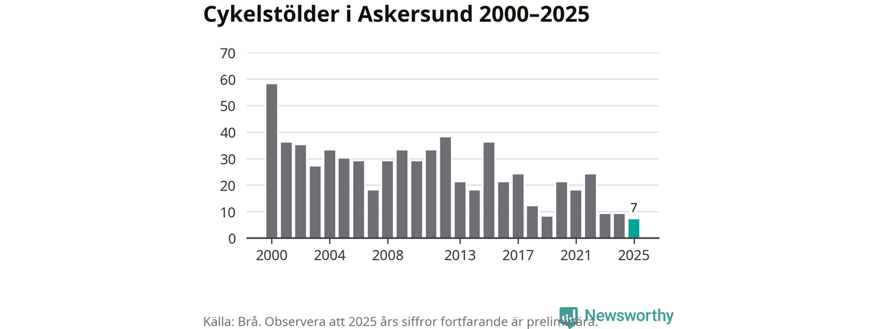 I Askersunds kommun noterades det lägsta antalet cykelstölder under hela 2000-talet år 2025, även om det fortfarande är preliminära siffror. Under de senaste 25 åren har det som mest anmälts 58 cykelstölder på ett år (2000).