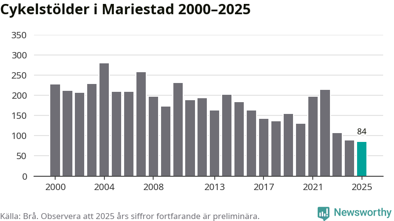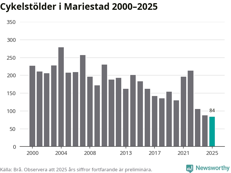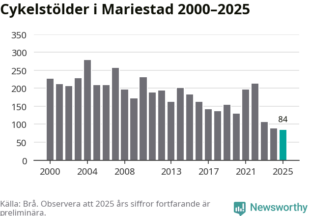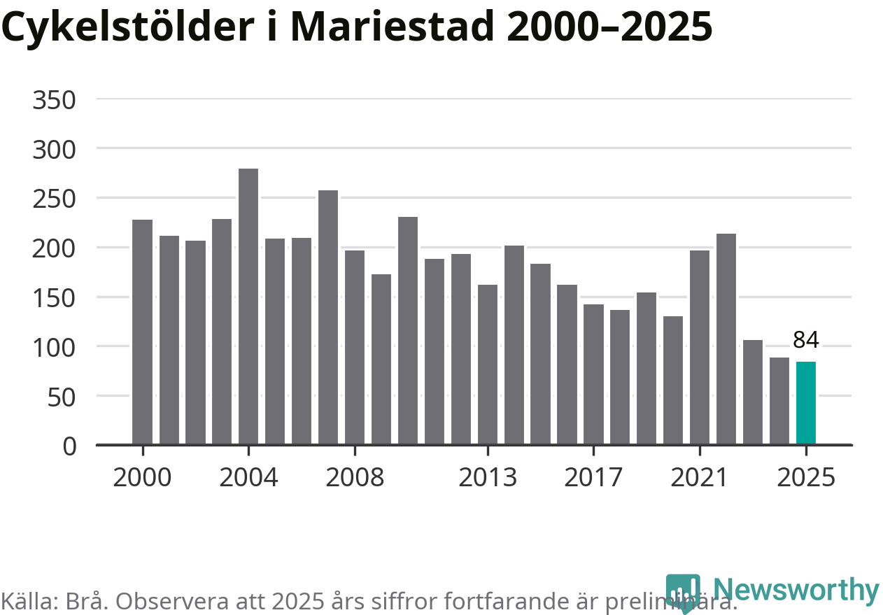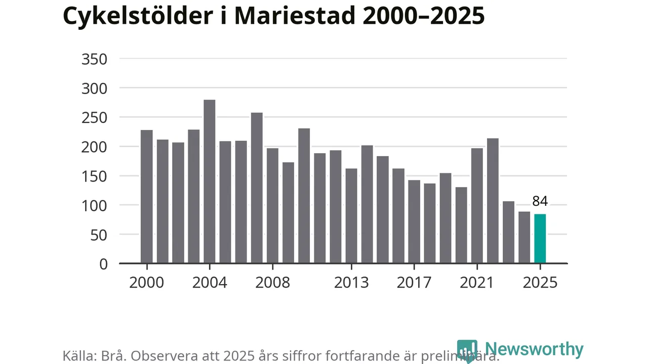 I Mariestads kommun noterades det lägsta antalet cykelstölder under hela 2000-talet år 2025, även om det fortfarande är preliminära siffror. Under de senaste 25 åren har det som mest anmälts 279 cykelstölder på ett år (2004).