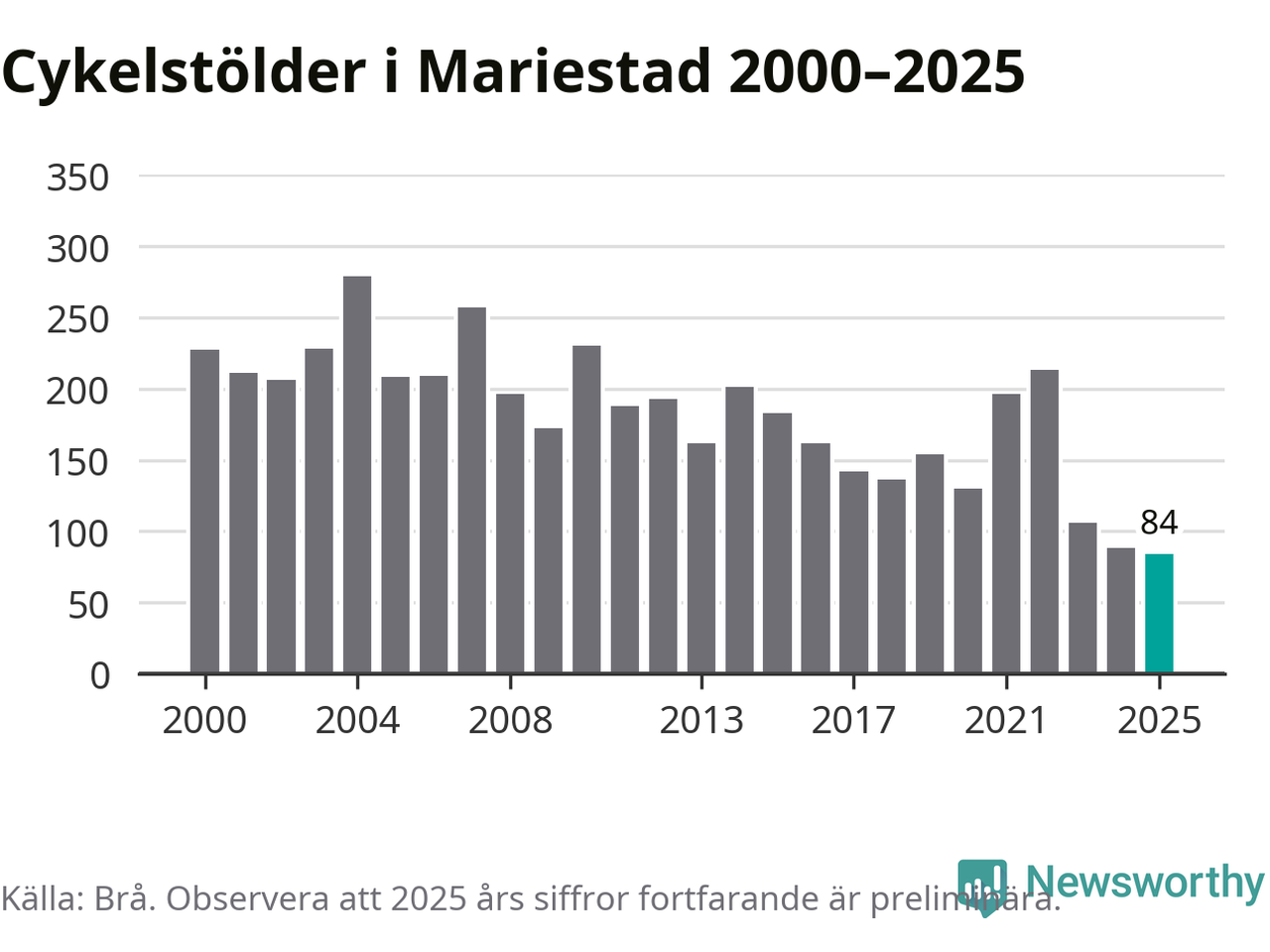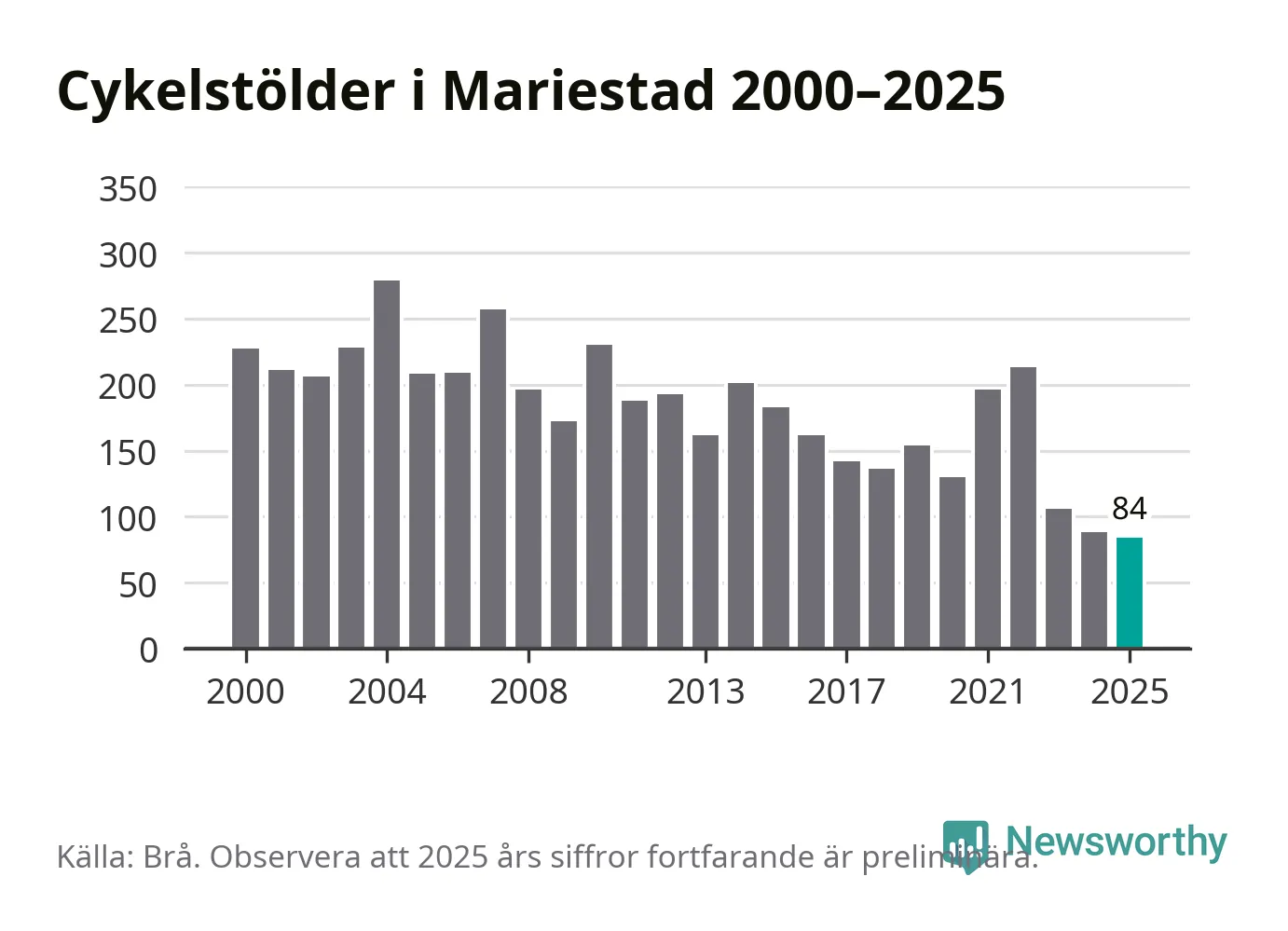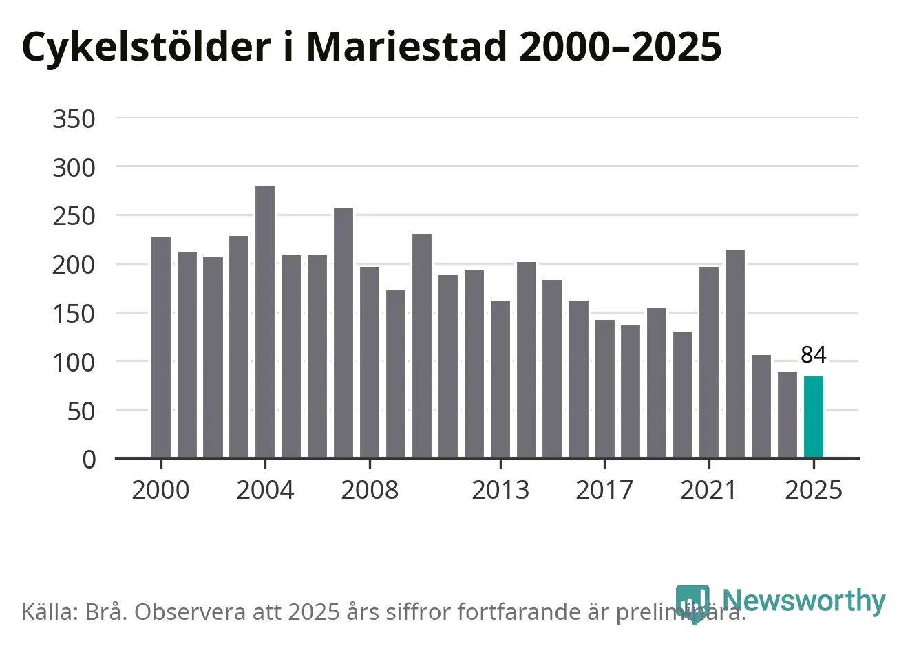 I Mariestads kommun noterades det lägsta antalet cykelstölder under hela 2000-talet år 2025, även om det fortfarande är preliminära siffror. Under de senaste 25 åren har det som mest anmälts 279 cykelstölder på ett år (2004).