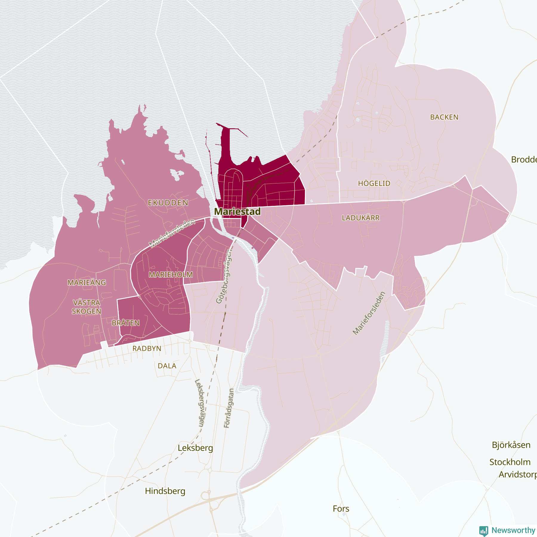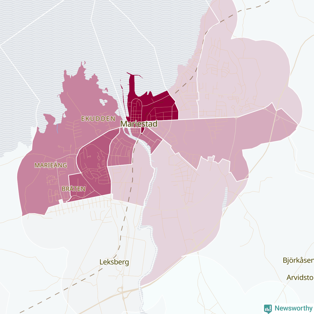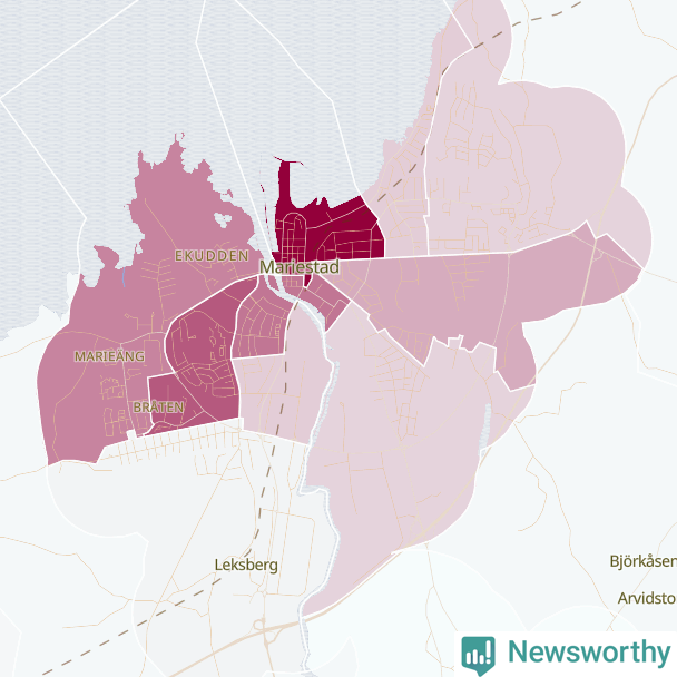 Men alla delar av Mariestad är inte lika hårt drabbade. Det visar data för de senaste fem åren, som Newsworthy har begärt ut från polisen. De anmälda stölderna har kopplats till SCB:s 15 statistiska områden i kommunen. Det rör sig om mellan en handfull och drygt 100 anmälda stölder per område.