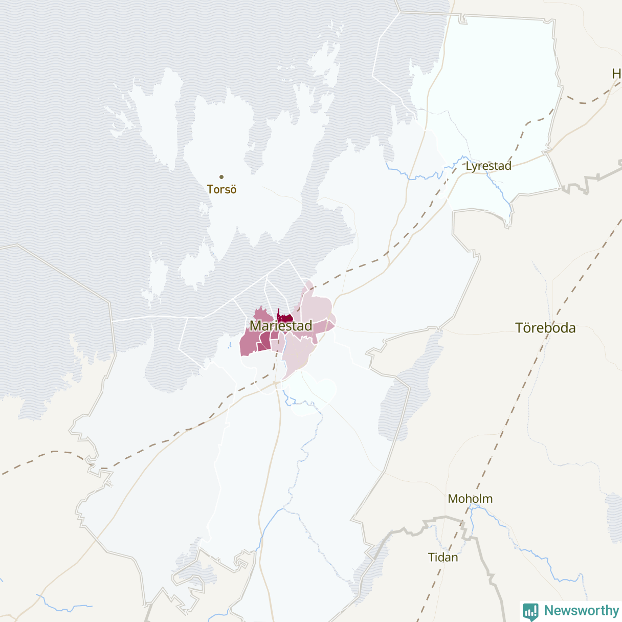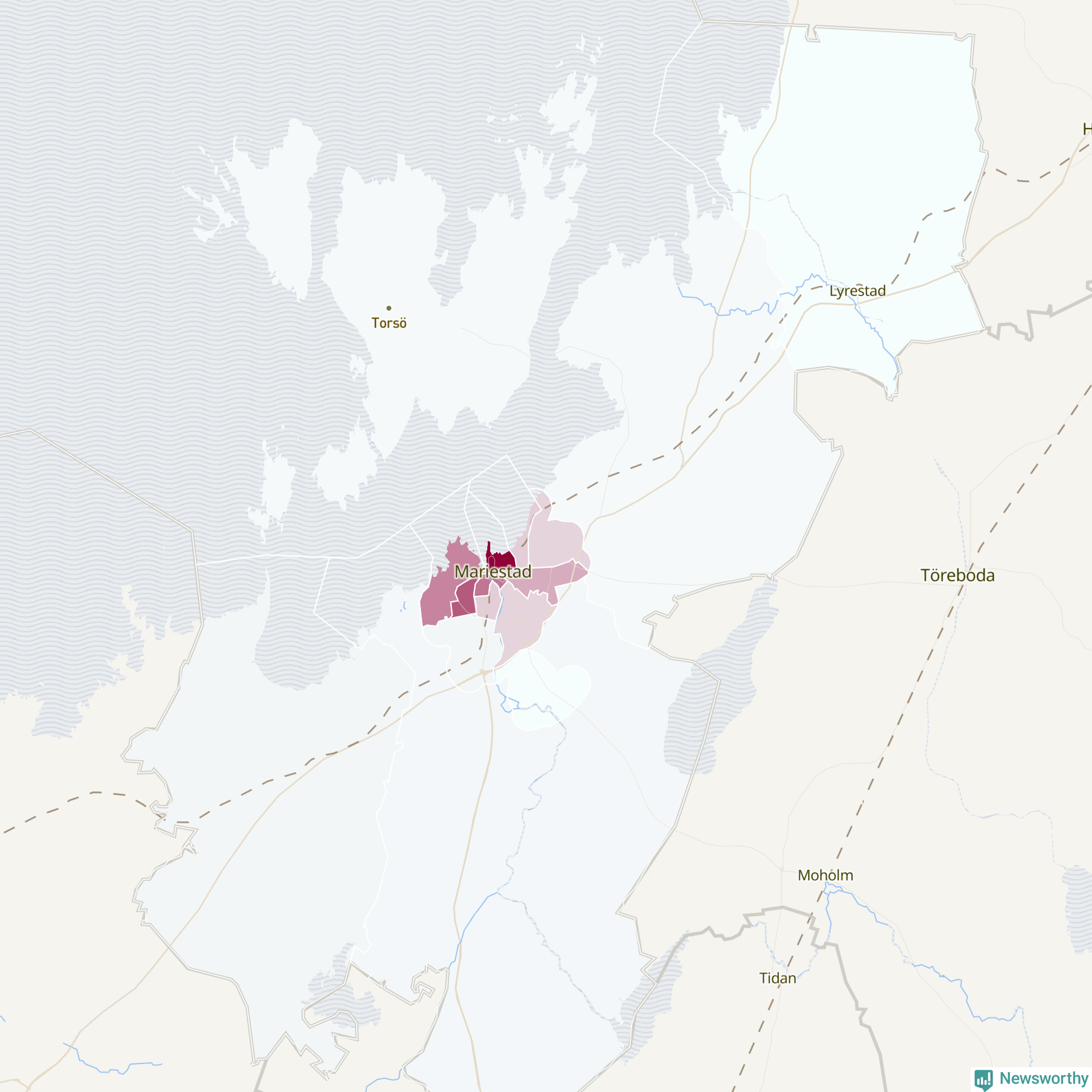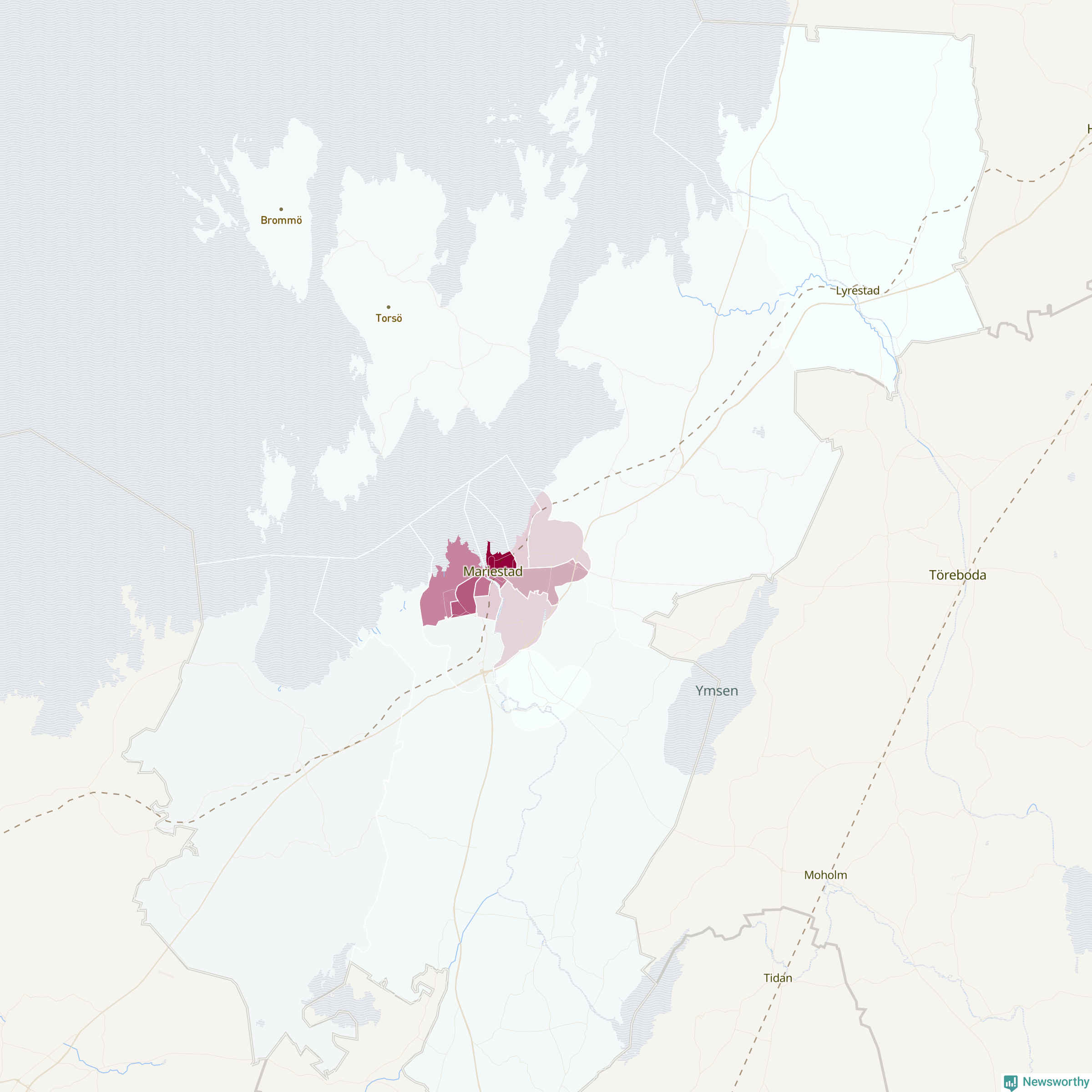 Men alla delar av Mariestad är inte lika hårt drabbade. Det visar data för de senaste fem åren, som Newsworthy har begärt ut från polisen. De anmälda stölderna har kopplats till SCB:s 15 statistiska områden i kommunen. Det rör sig om mellan en handfull och drygt 100 anmälda stölder per område.