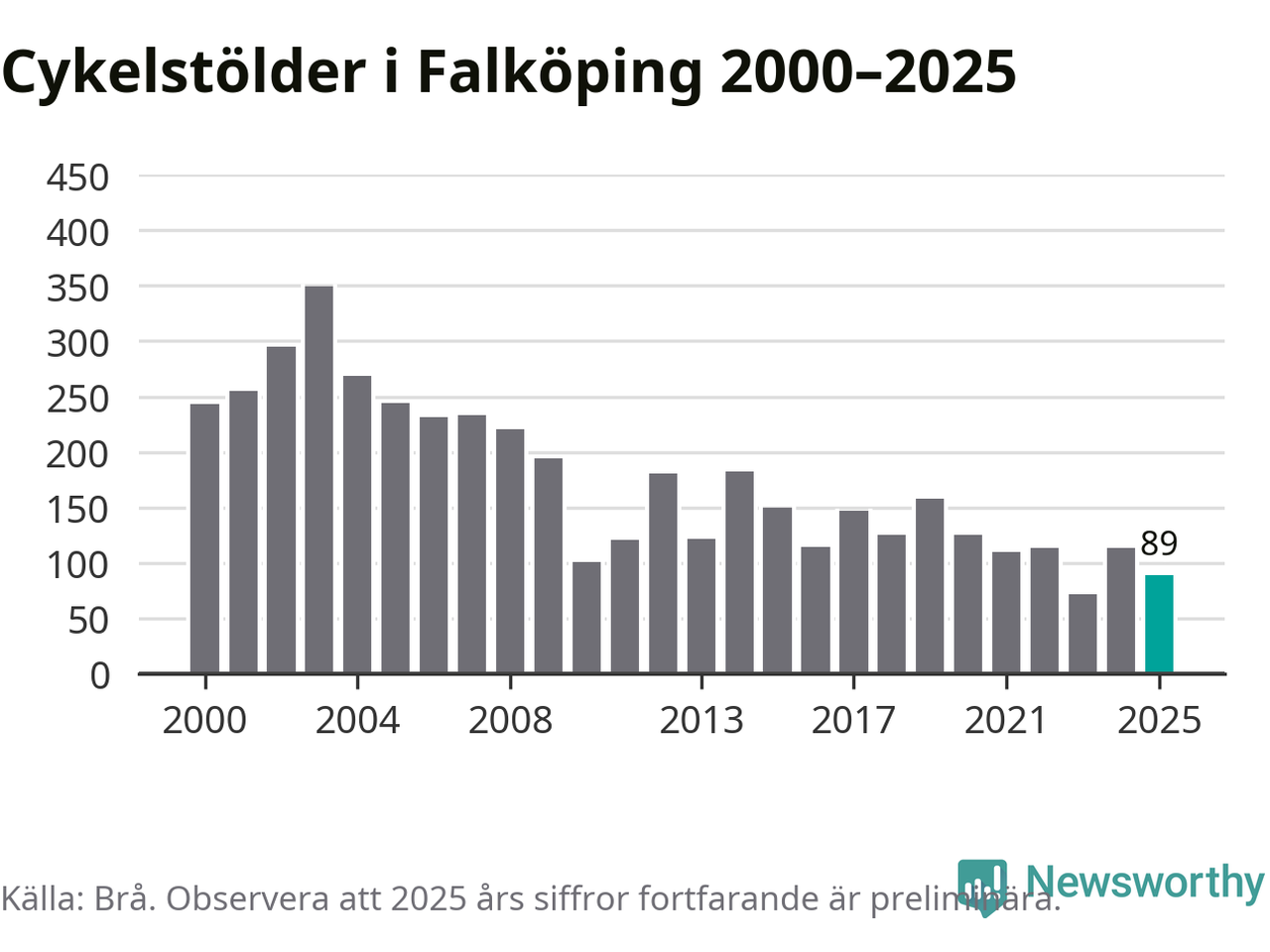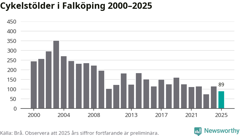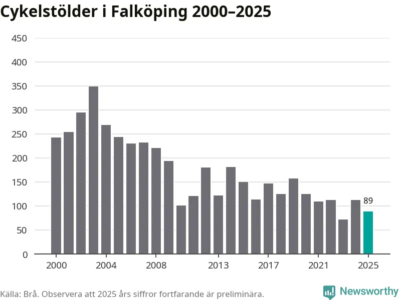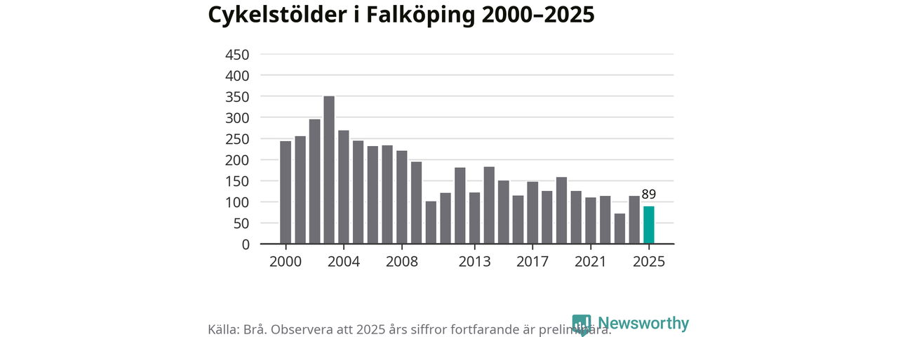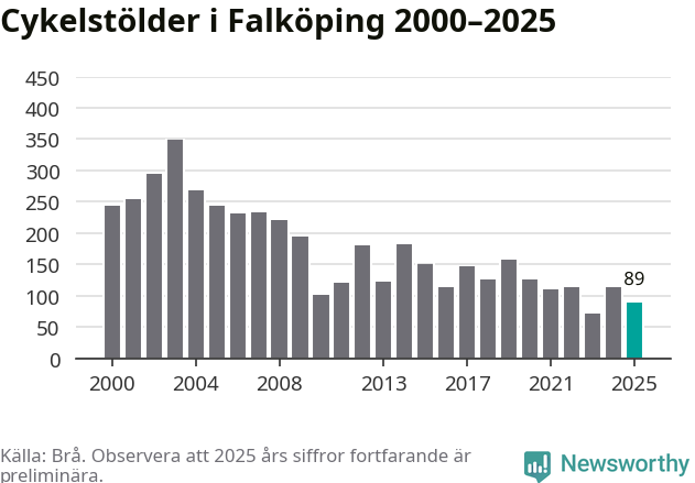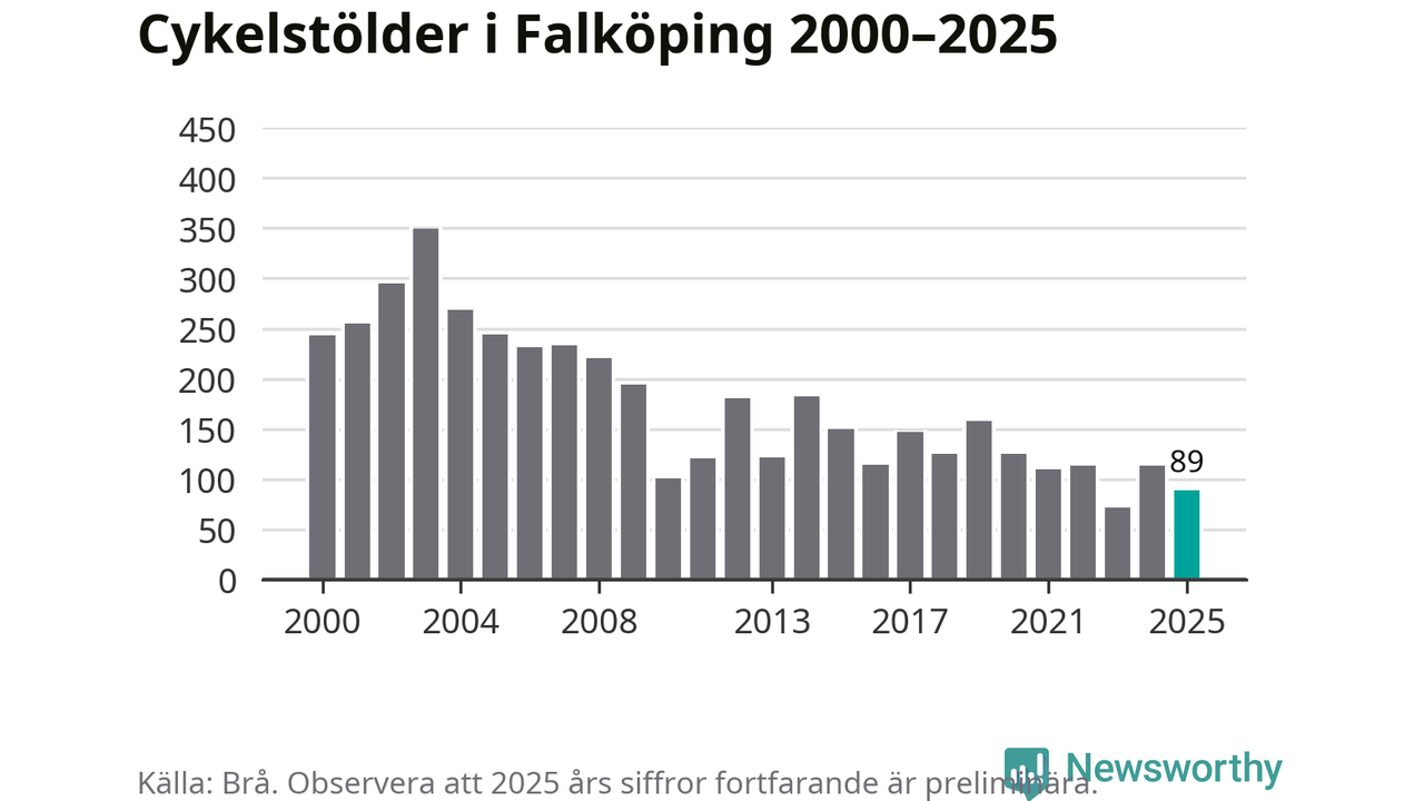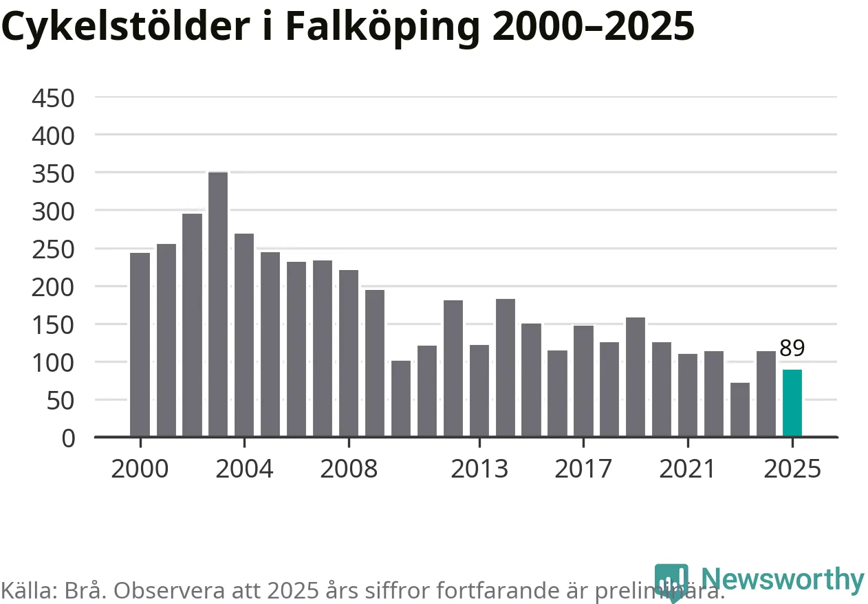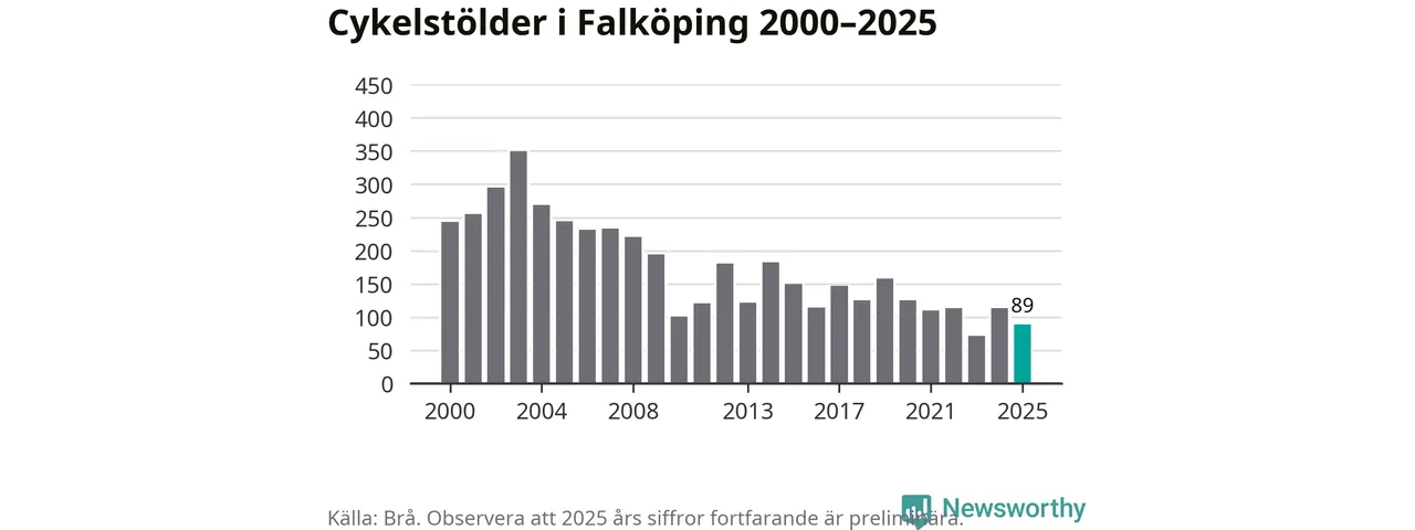 I Falköpings kommun var antalet cykelstölder relativt få i en historisk kontext år 2025, även om det fortfarande är preliminära siffror. Under de senaste 25 åren har det som mest anmälts 349 cykelstölder på ett år (2003), som minst 72 stycken (2023).