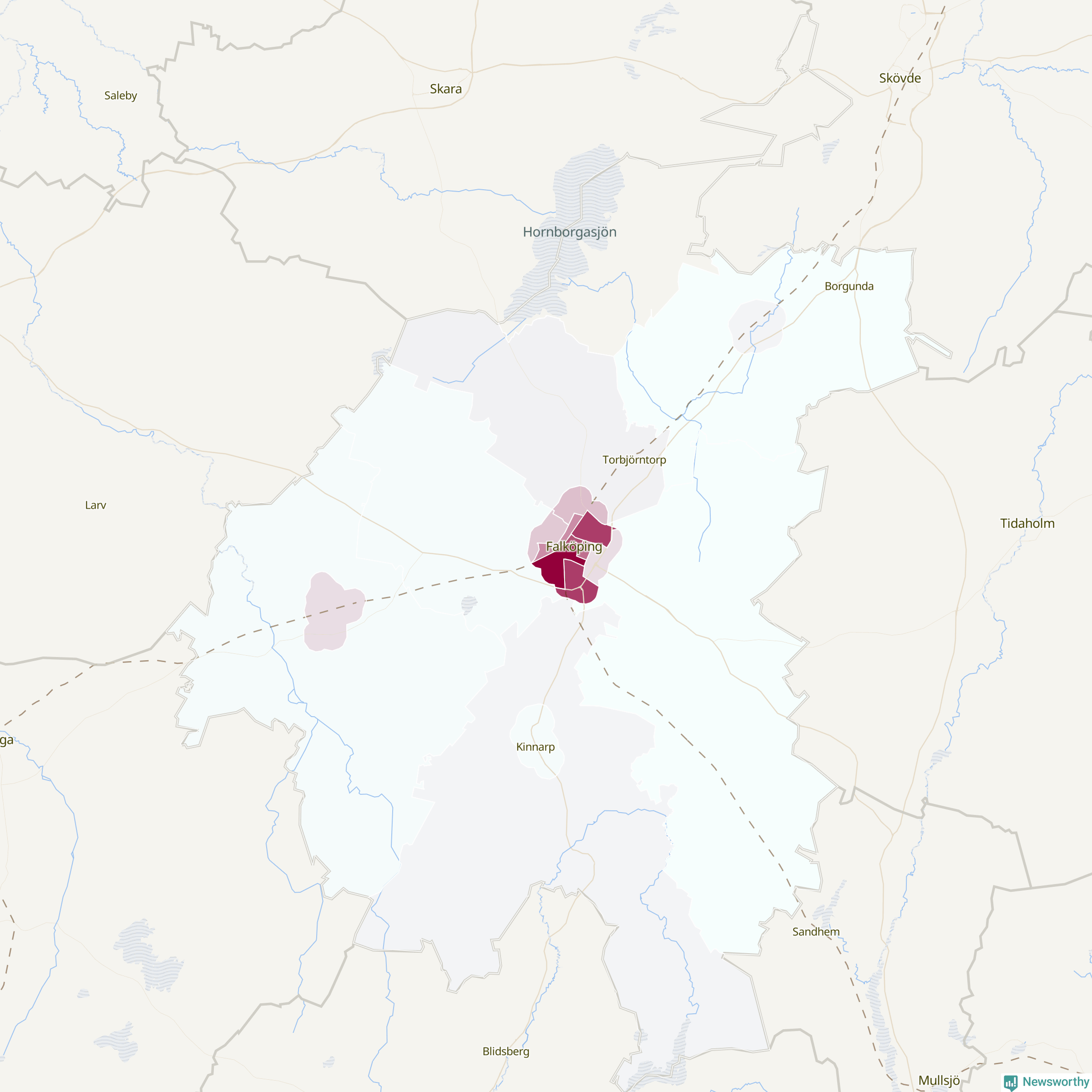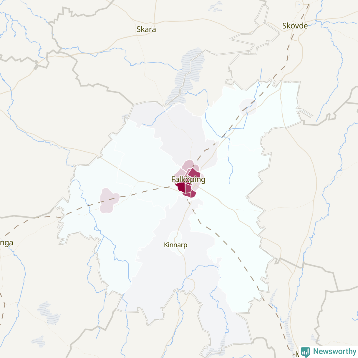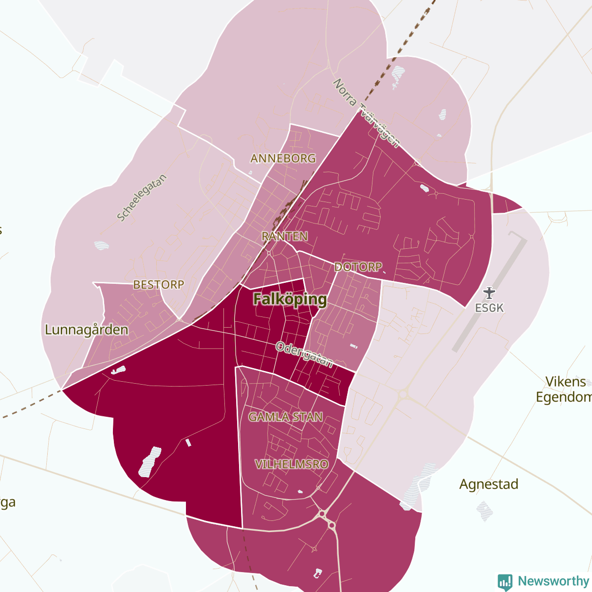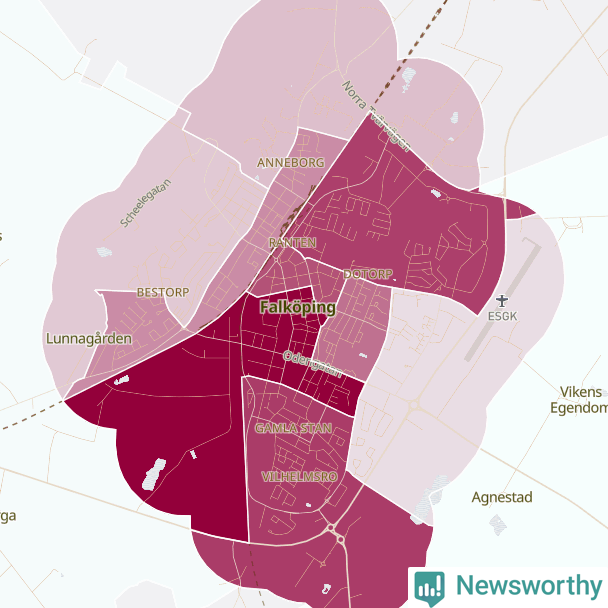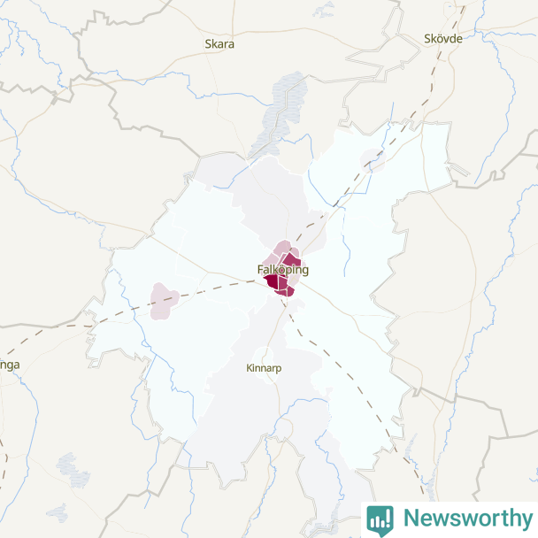 Men alla delar av Falköping är inte lika hårt drabbade. Det visar data för de senaste fem åren, som Newsworthy har begärt ut från polisen. De anmälda stölderna har kopplats till SCB:s 19 statistiska områden i kommunen. I ett område finns inga cykelstölder registrerade, men i de övriga rör det sig om mellan en handfull och ett åttiotal anmälda stölder per område.