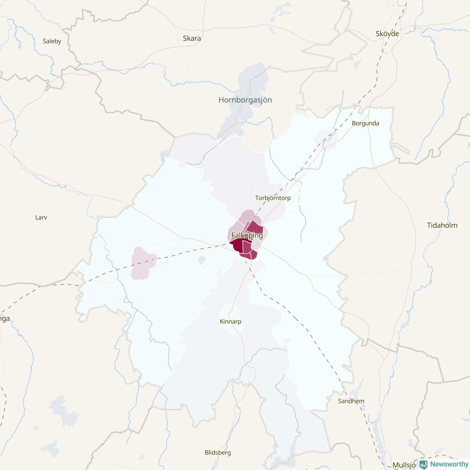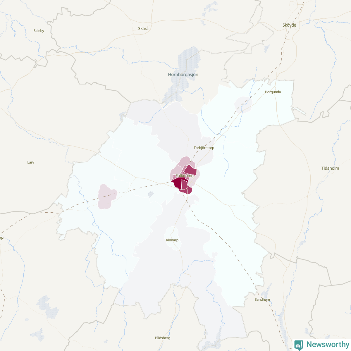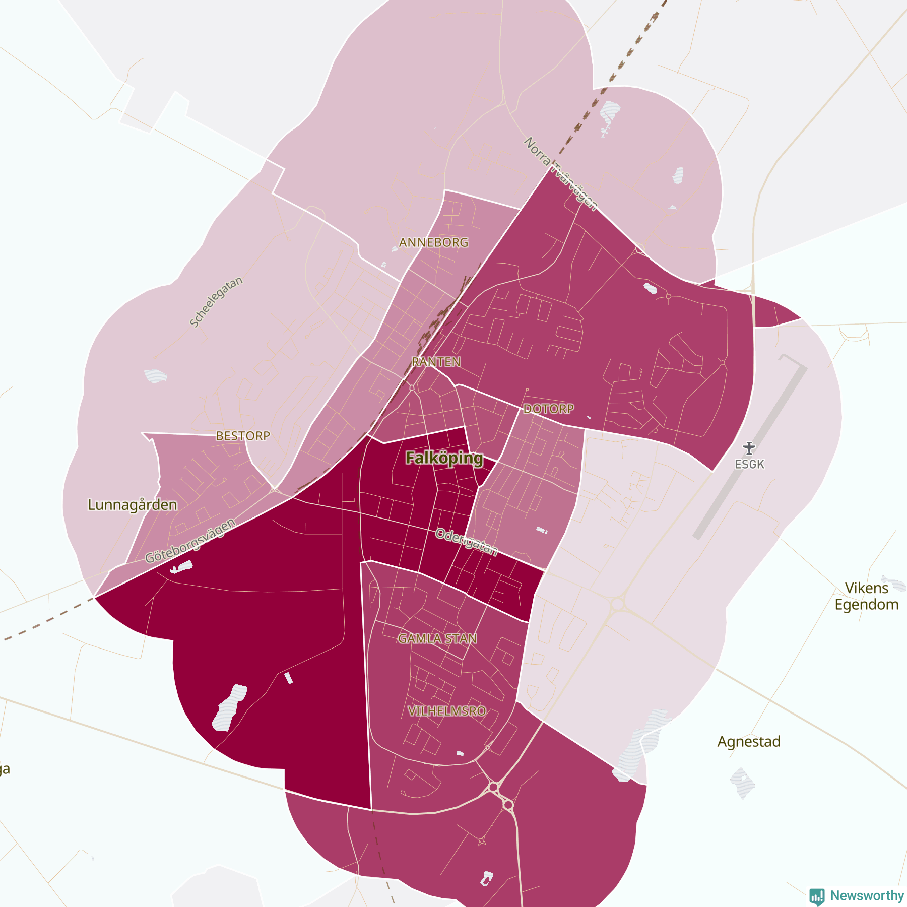Men alla delar av Falköping är inte lika hårt drabbade. Det visar data för de senaste fem åren, som Newsworthy har begärt ut från polisen. De anmälda stölderna har kopplats till SCB:s 19 statistiska områden i kommunen. I ett område finns inga cykelstölder registrerade, men i de övriga rör det sig om mellan en handfull och ett åttiotal anmälda stölder per område.