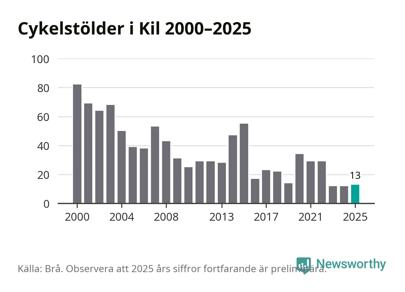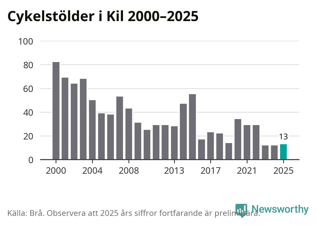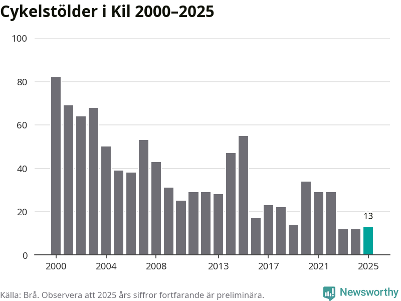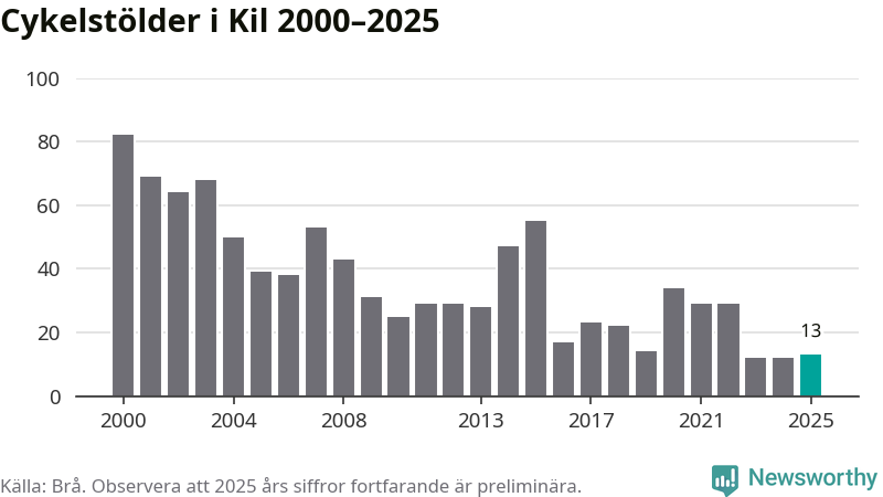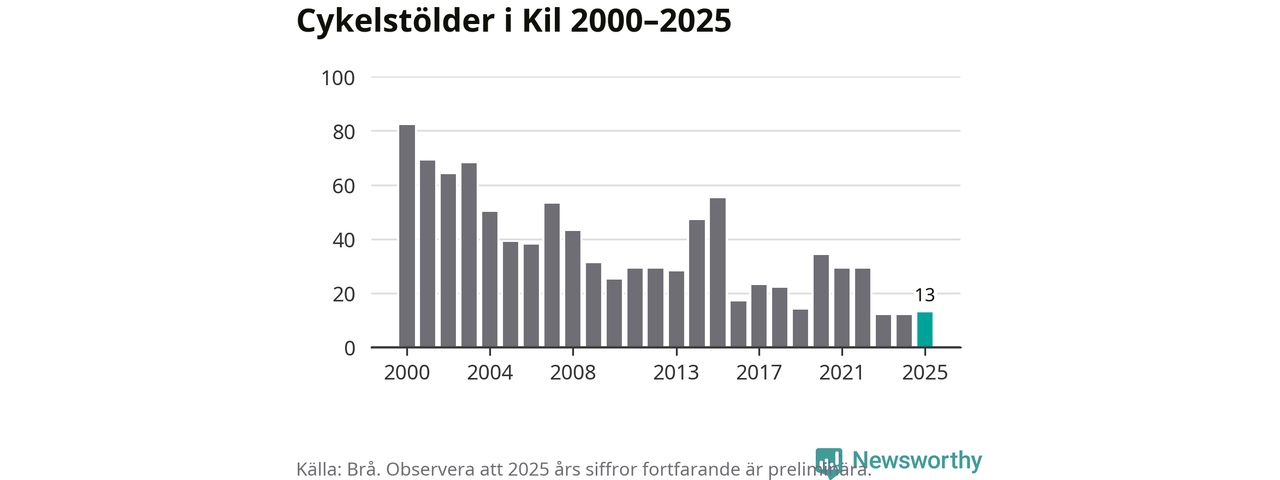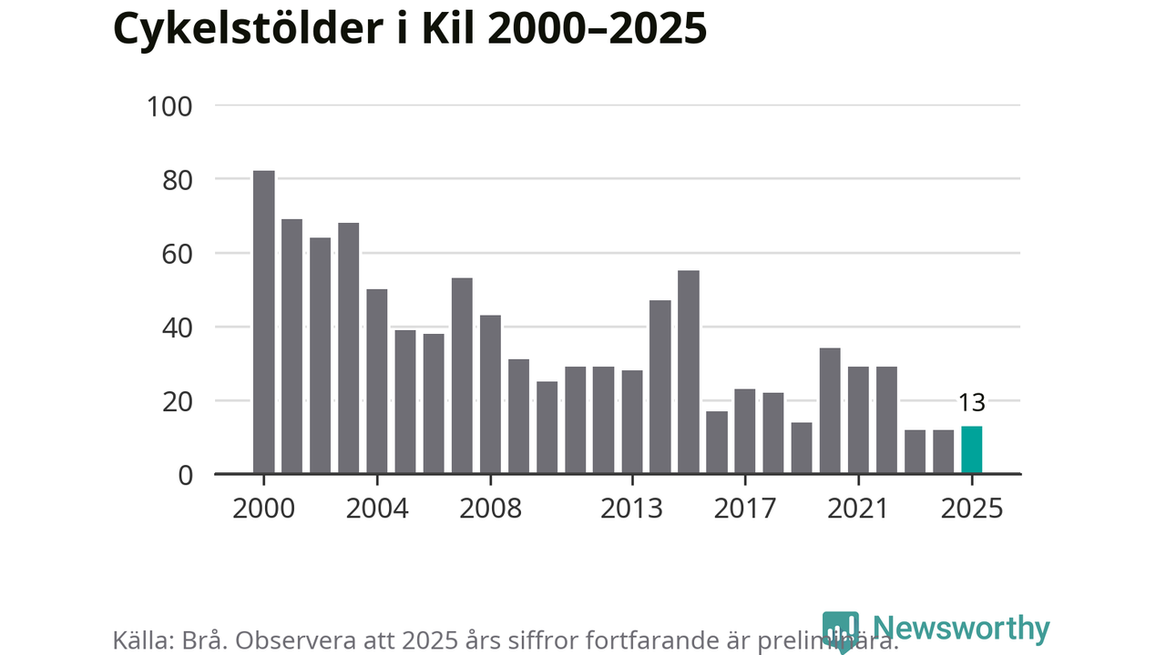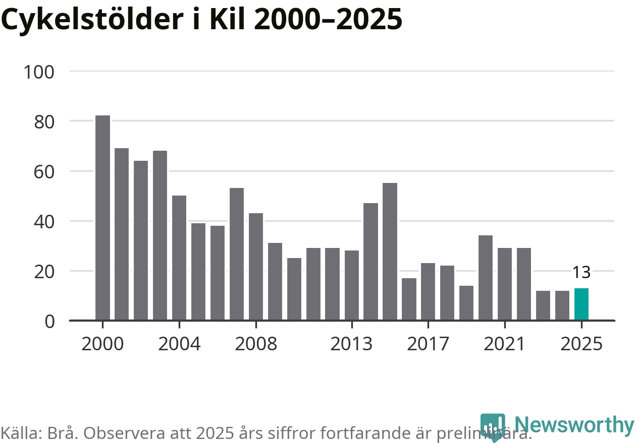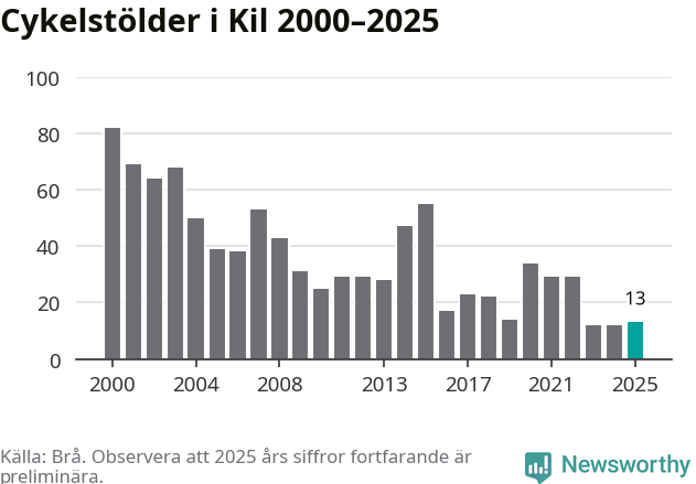 I Kils kommun var antalet cykelstölder relativt få i en historisk kontext år 2025, även om det fortfarande är preliminära siffror. Under de senaste 25 åren har det som mest anmälts 82 cykelstölder på ett år (2000), som minst 12 stycken (2023 och 2024).