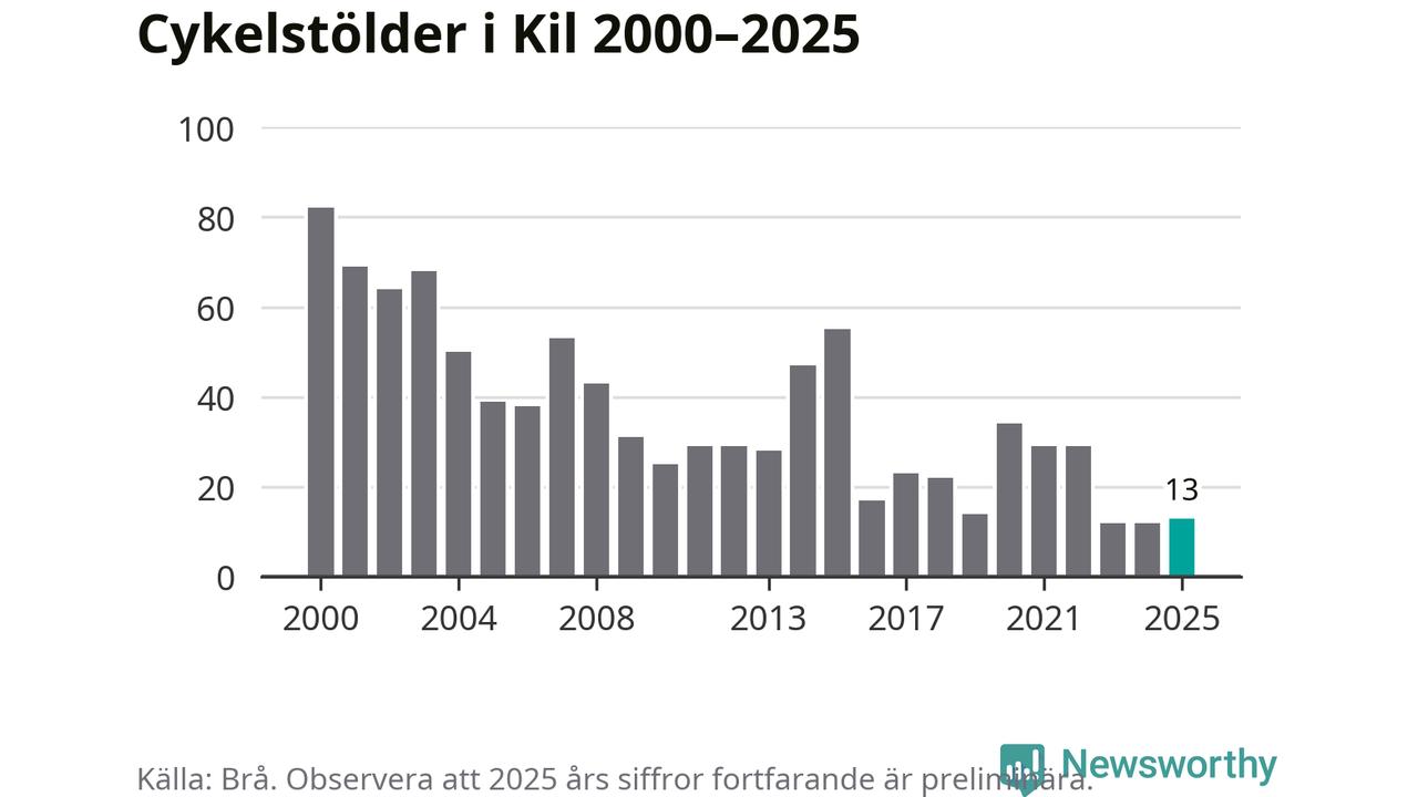 Av de 13 stöldanmälningar i Kil 2025 gällde tre elcyklar, det motsvarar 23 procent. Brå särredovisar elcyklar sedan 2020 och i riket som helhet ökade anmälningarna om stulna elcyklar kraftigt de första åren, för att de senaste tre åren ha legat relativt stilla. Eftersom antalet cykelstölder totalt har minskat under samma tid har andelen elcyklar ökat. I fjol stod elcyklar för 28 procent av alla anmälda cykelstölder i landet.