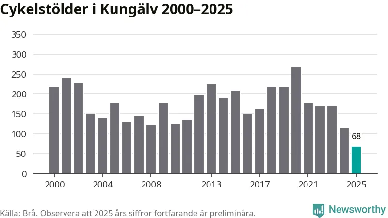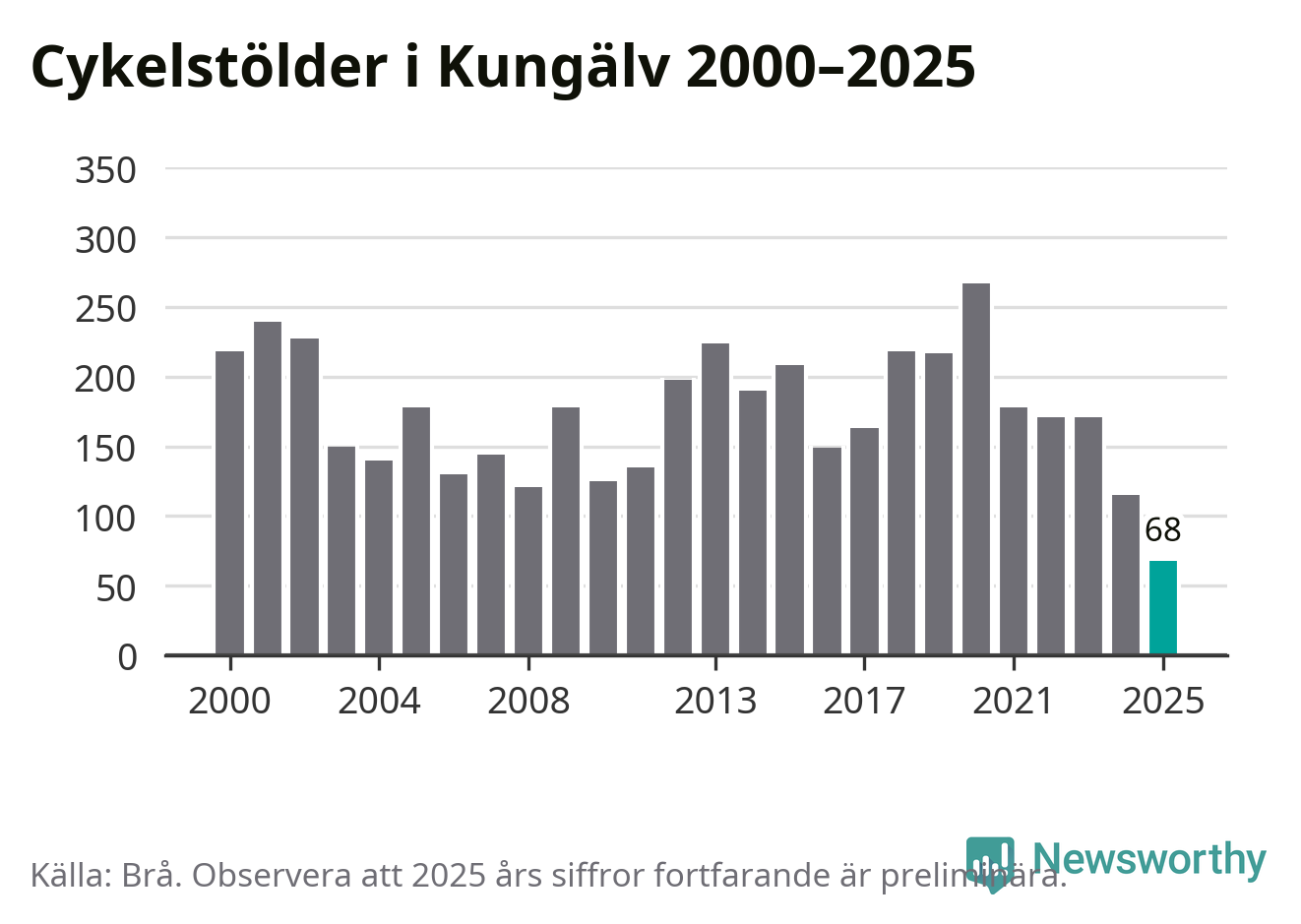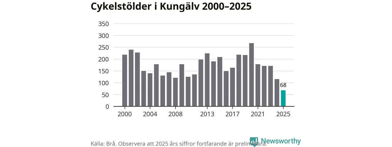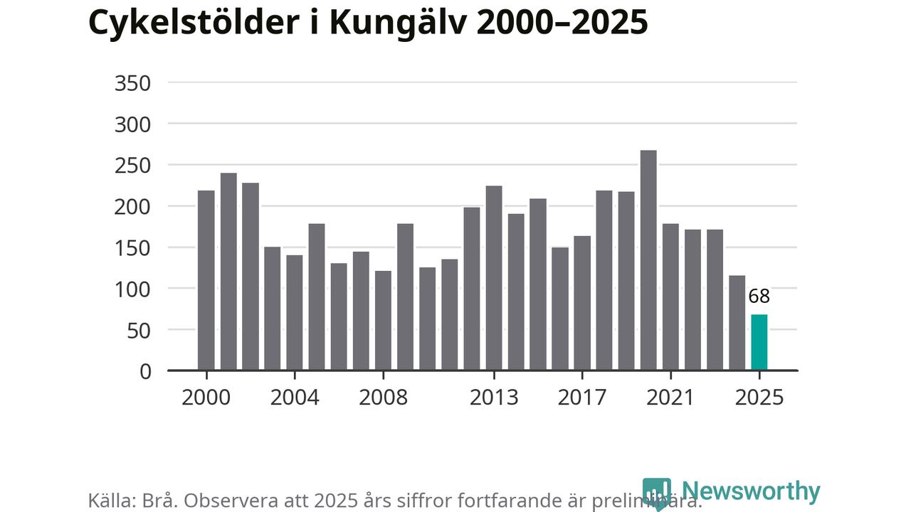 I Kungälvs kommun noterades det lägsta antalet cykelstölder under hela 2000-talet år 2025, även om det fortfarande är preliminära siffror. Under de senaste 25 åren har det som mest anmälts 267 cykelstölder på ett år (2020).