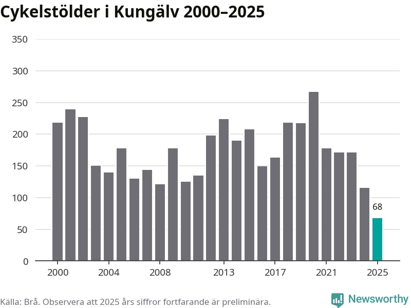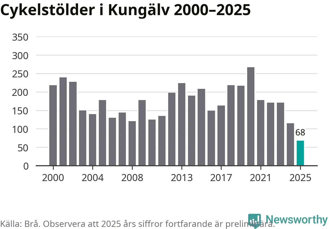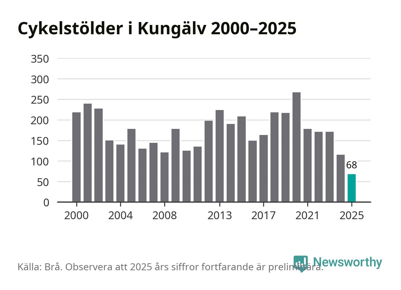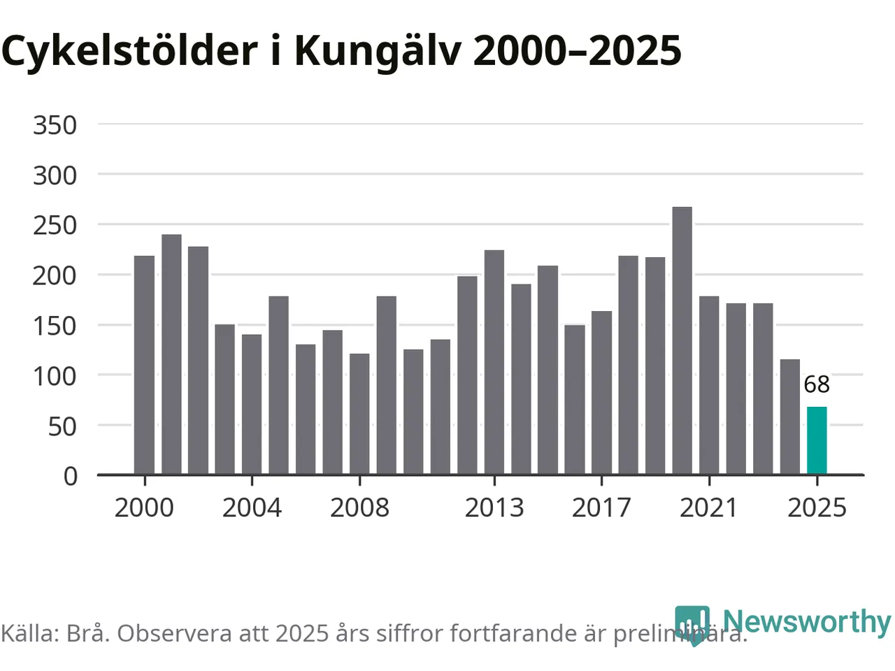 I Kungälvs kommun noterades det lägsta antalet cykelstölder under hela 2000-talet år 2025, även om det fortfarande är preliminära siffror. Under de senaste 25 åren har det som mest anmälts 267 cykelstölder på ett år (2020).