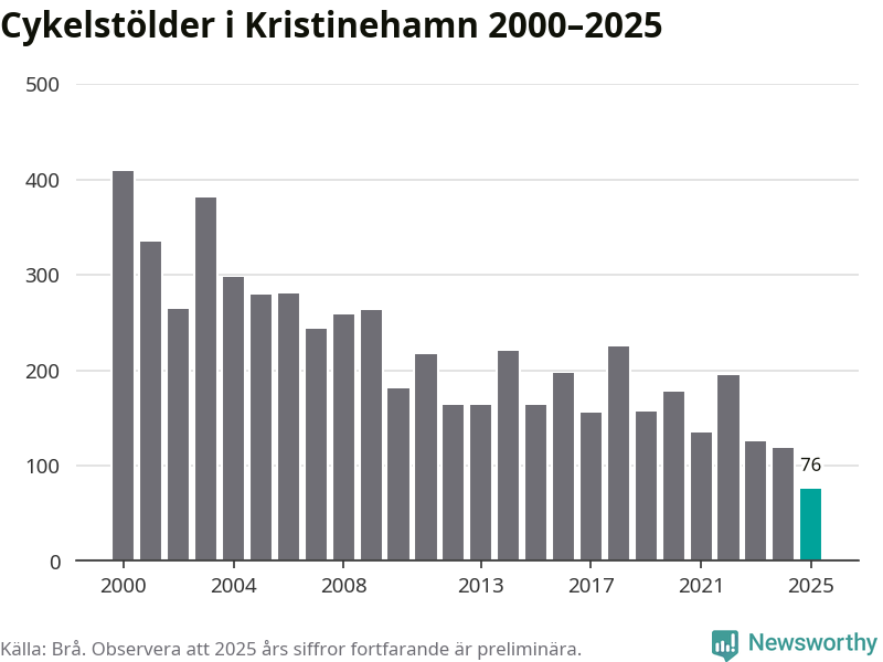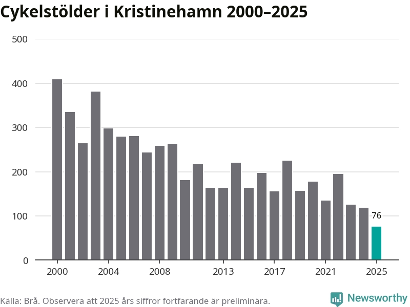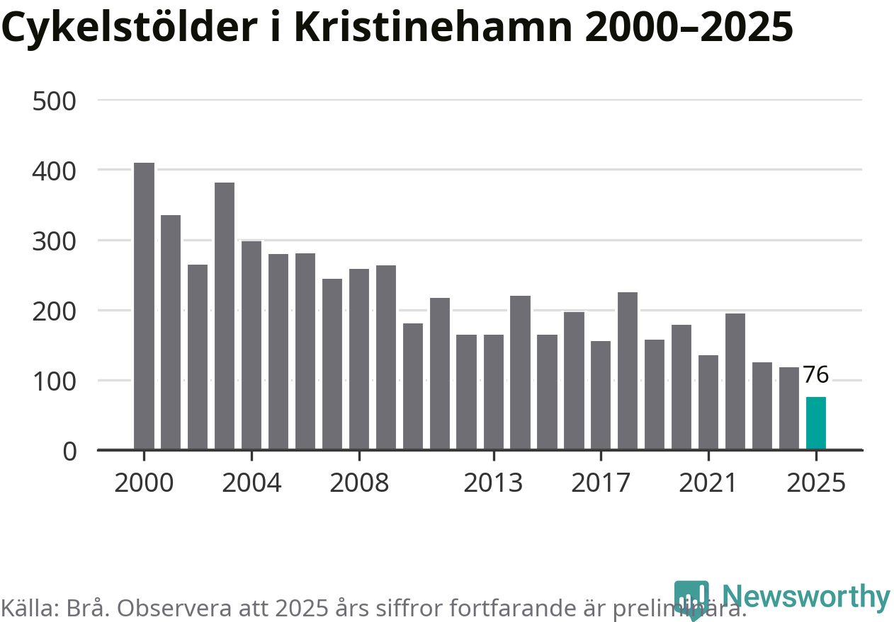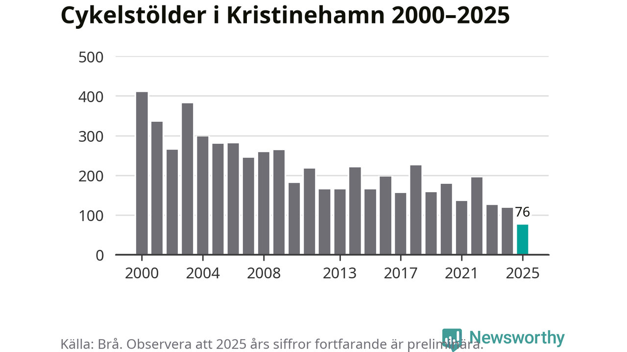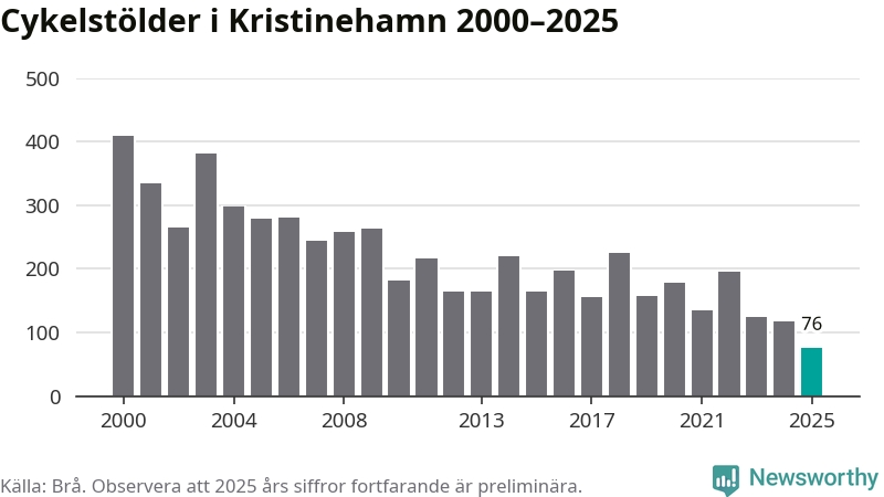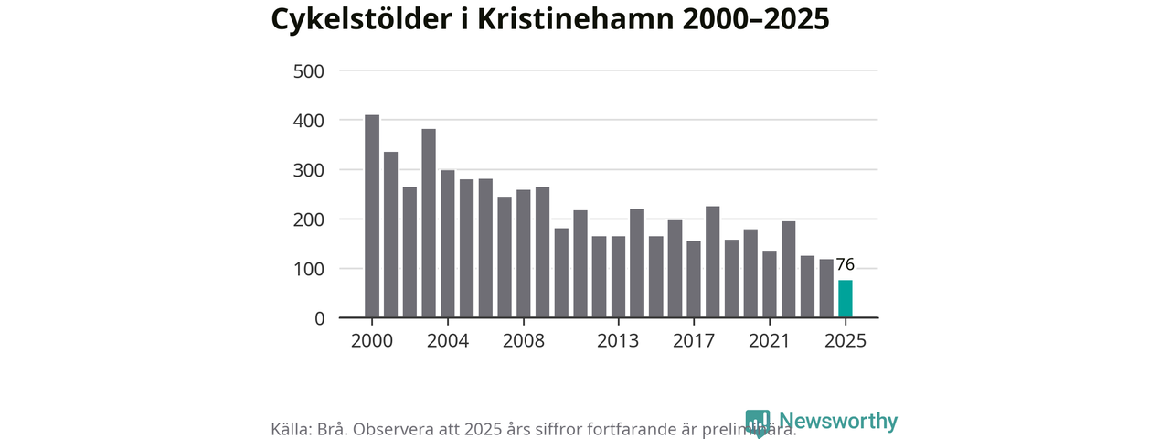 I Kristinehamns kommun noterades det lägsta antalet cykelstölder under hela 2000-talet år 2025, även om det fortfarande är preliminära siffror. Under de senaste 25 åren har det som mest anmälts 409 cykelstölder på ett år (2000).