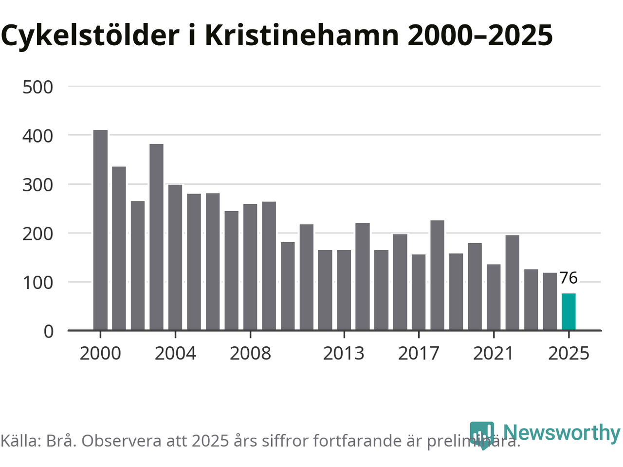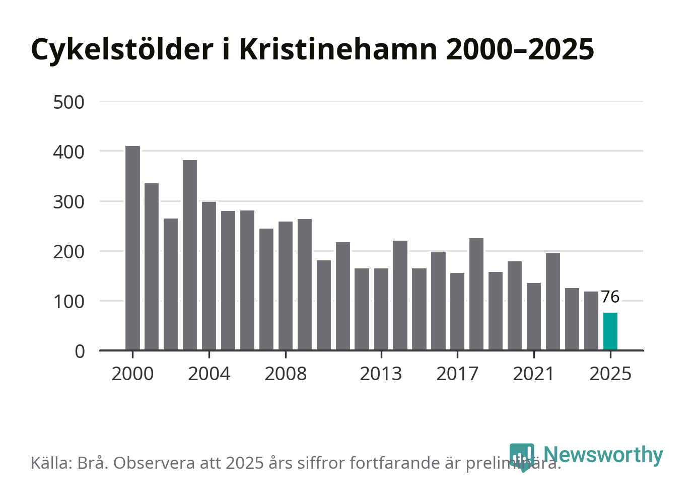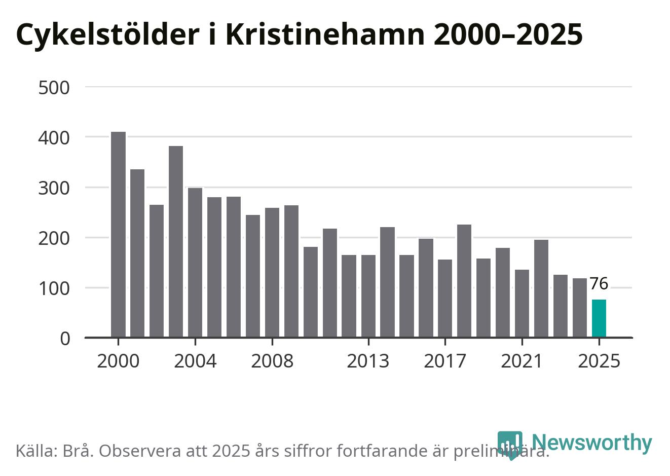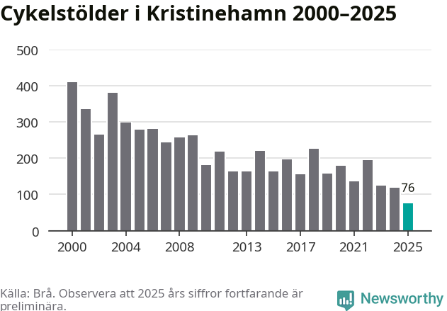 I Kristinehamns kommun noterades det lägsta antalet cykelstölder under hela 2000-talet år 2025, även om det fortfarande är preliminära siffror. Under de senaste 25 åren har det som mest anmälts 409 cykelstölder på ett år (2000).