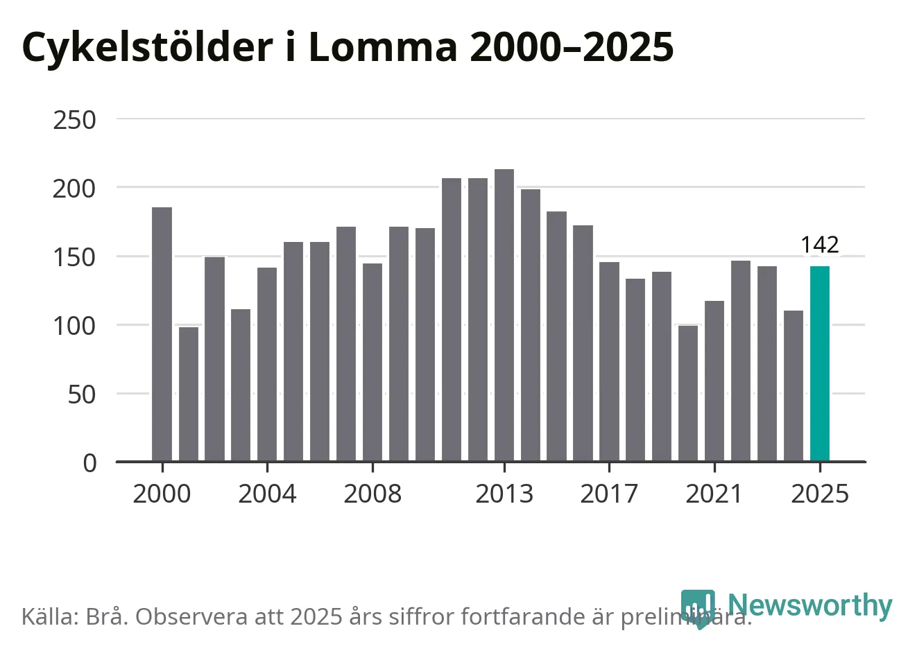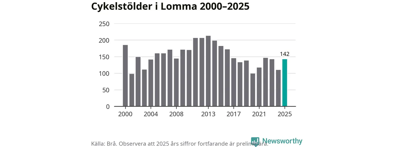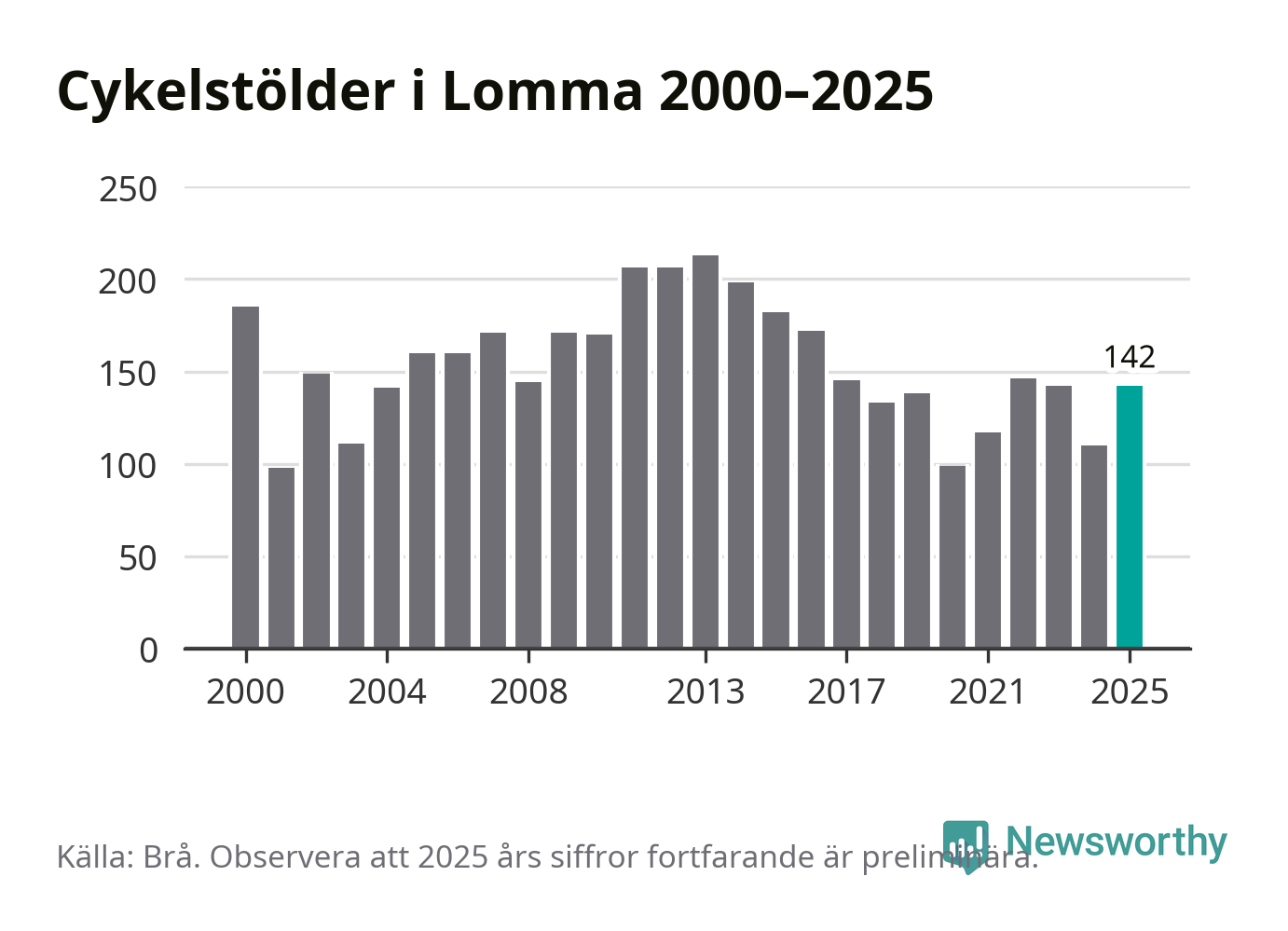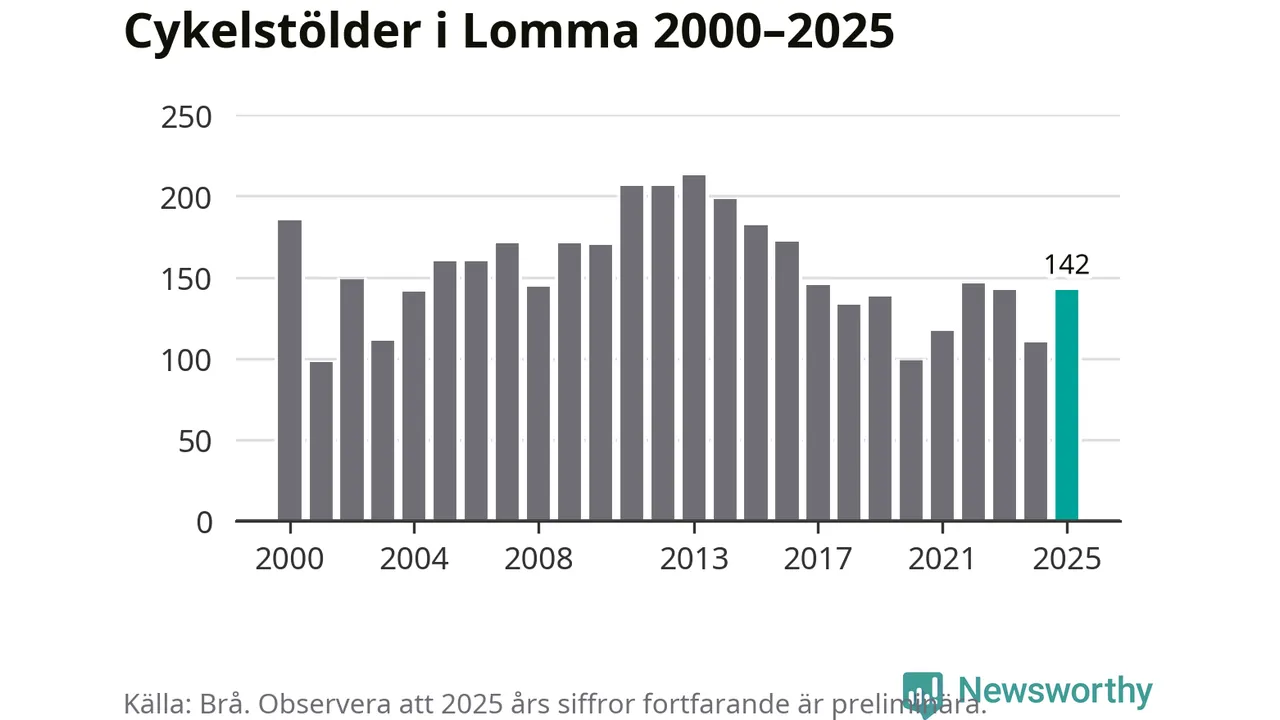 I Lomma kommun sticker antalet cykelstölder 2025 inte ut i en historisk kontext. Under de senaste 25 åren har det som mest anmälts 213 cykelstölder på ett år (2013), som minst 98 stycken (2001).