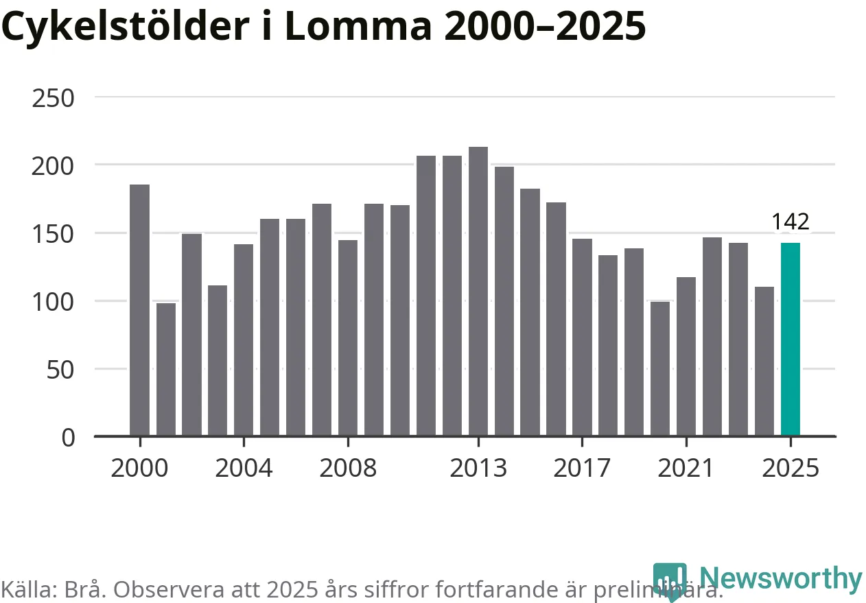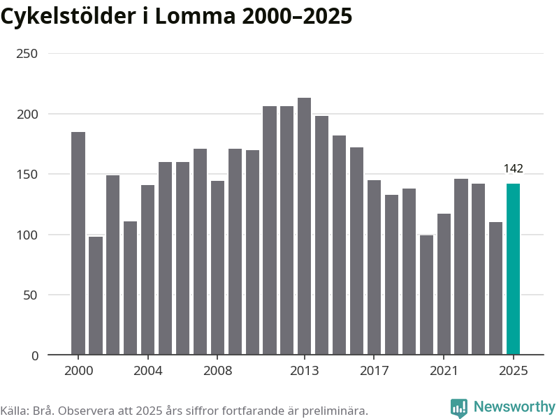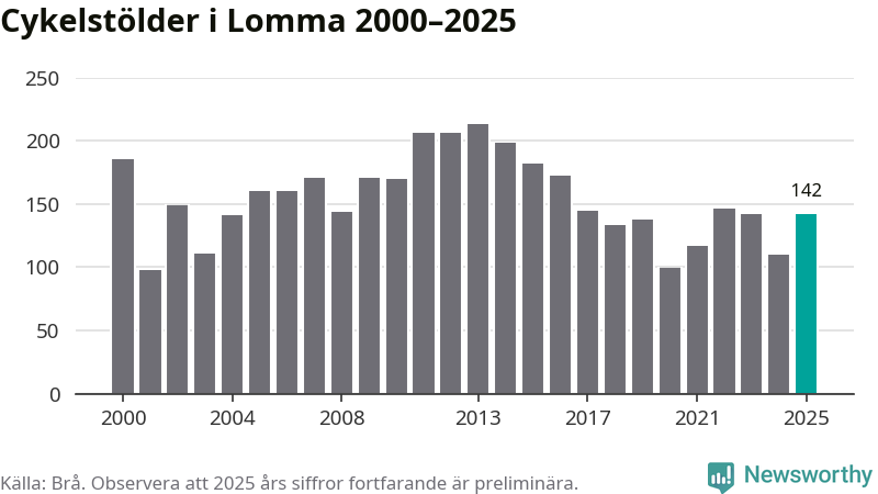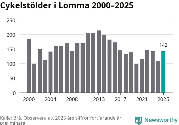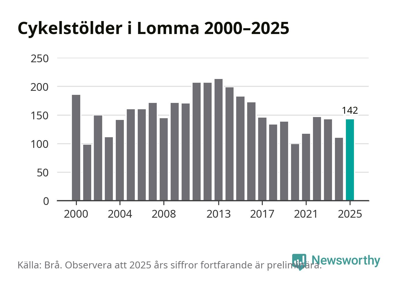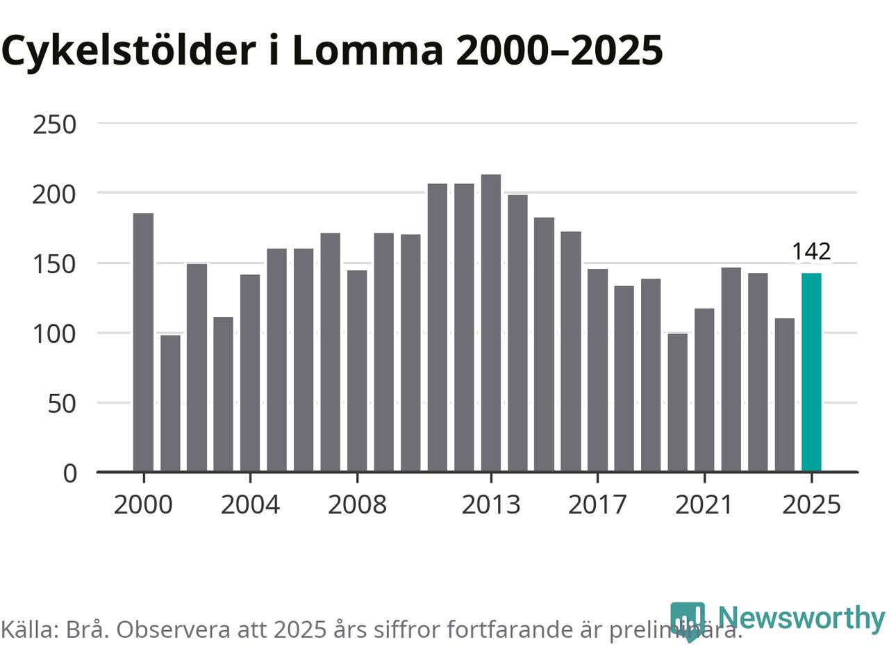 I Lomma kommun sticker antalet cykelstölder 2025 inte ut i en historisk kontext. Under de senaste 25 åren har det som mest anmälts 213 cykelstölder på ett år (2013), som minst 98 stycken (2001).