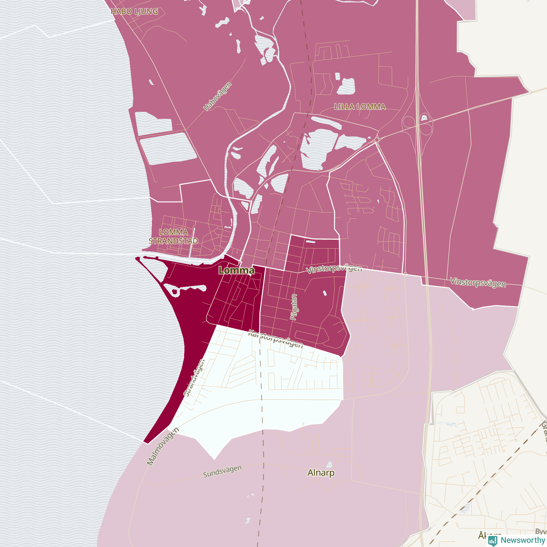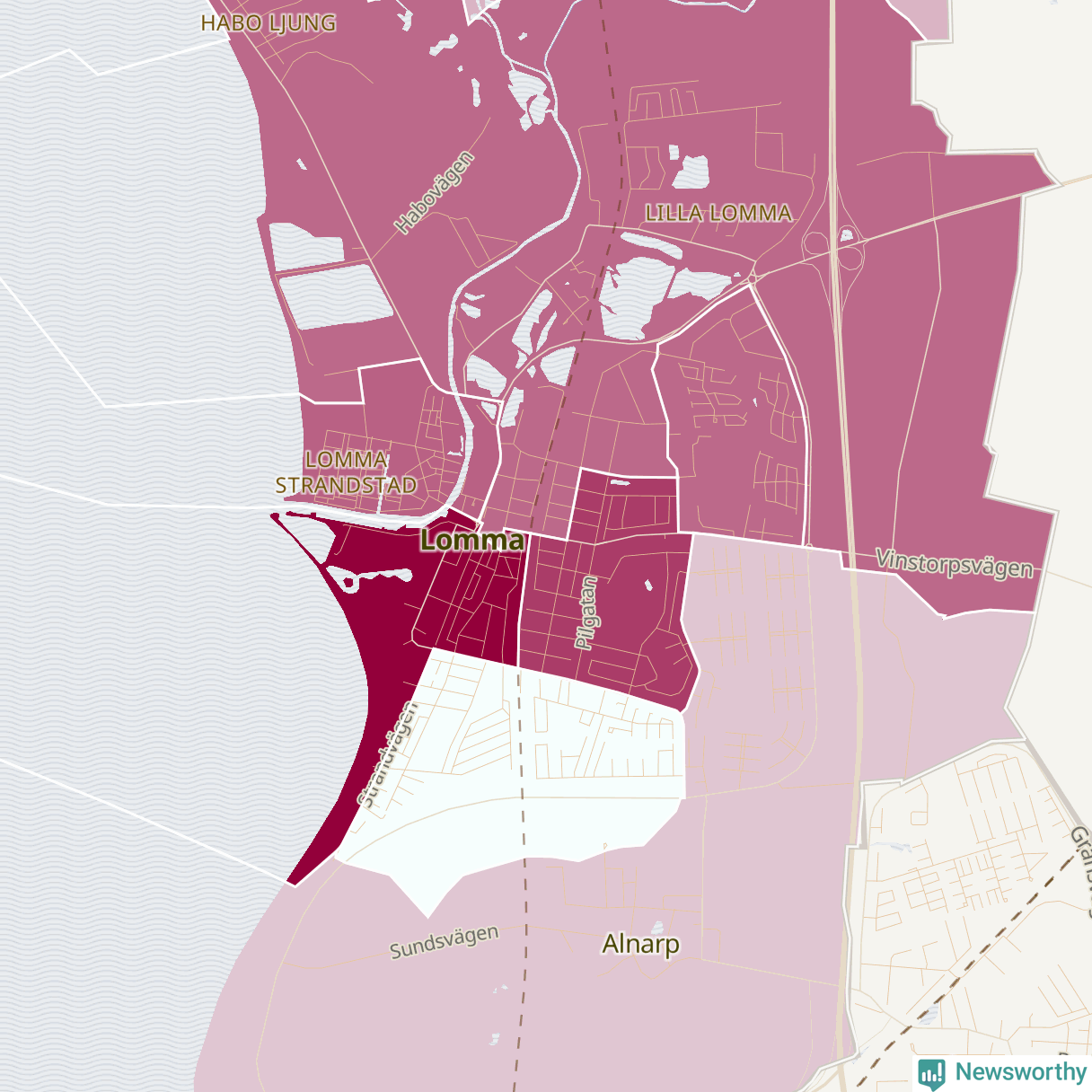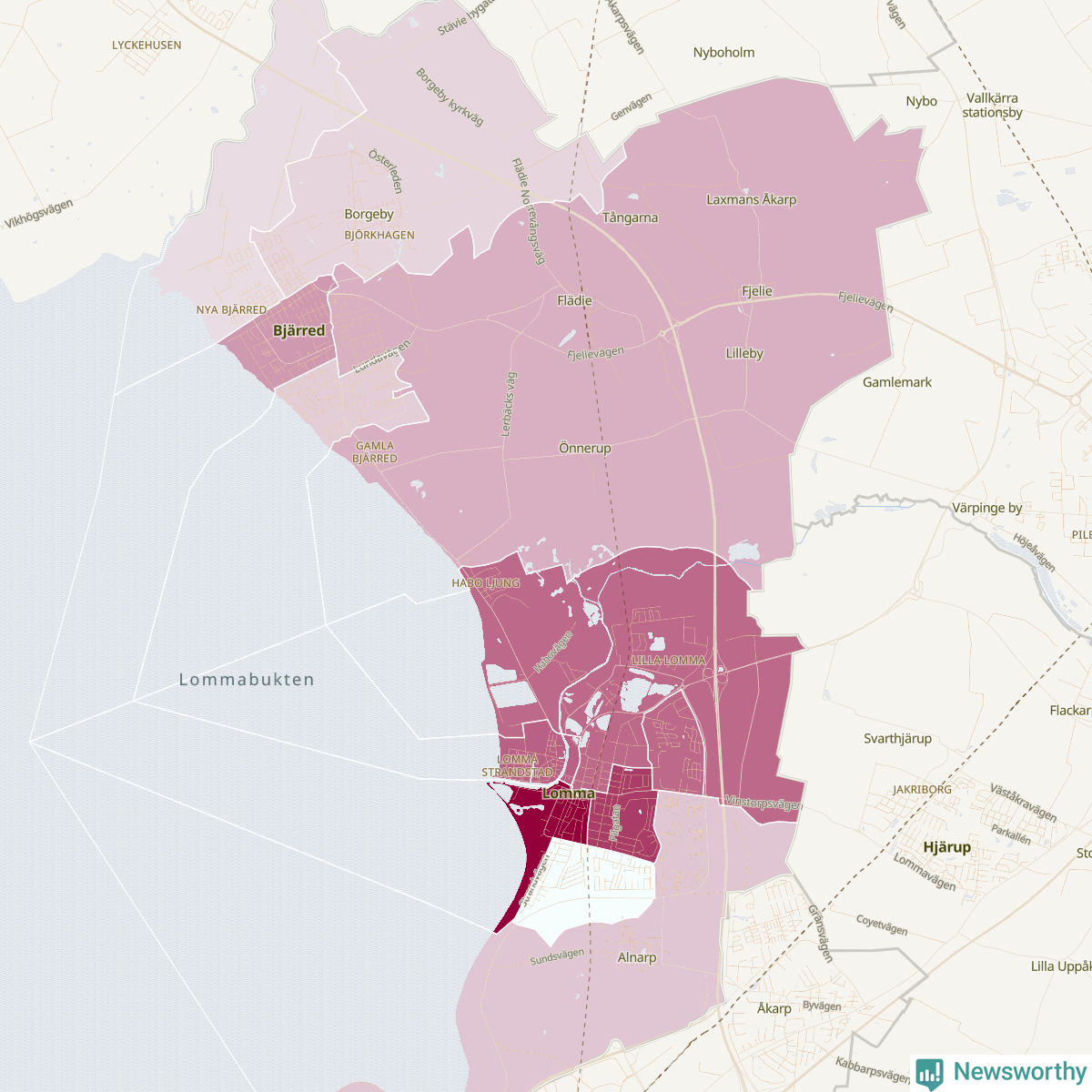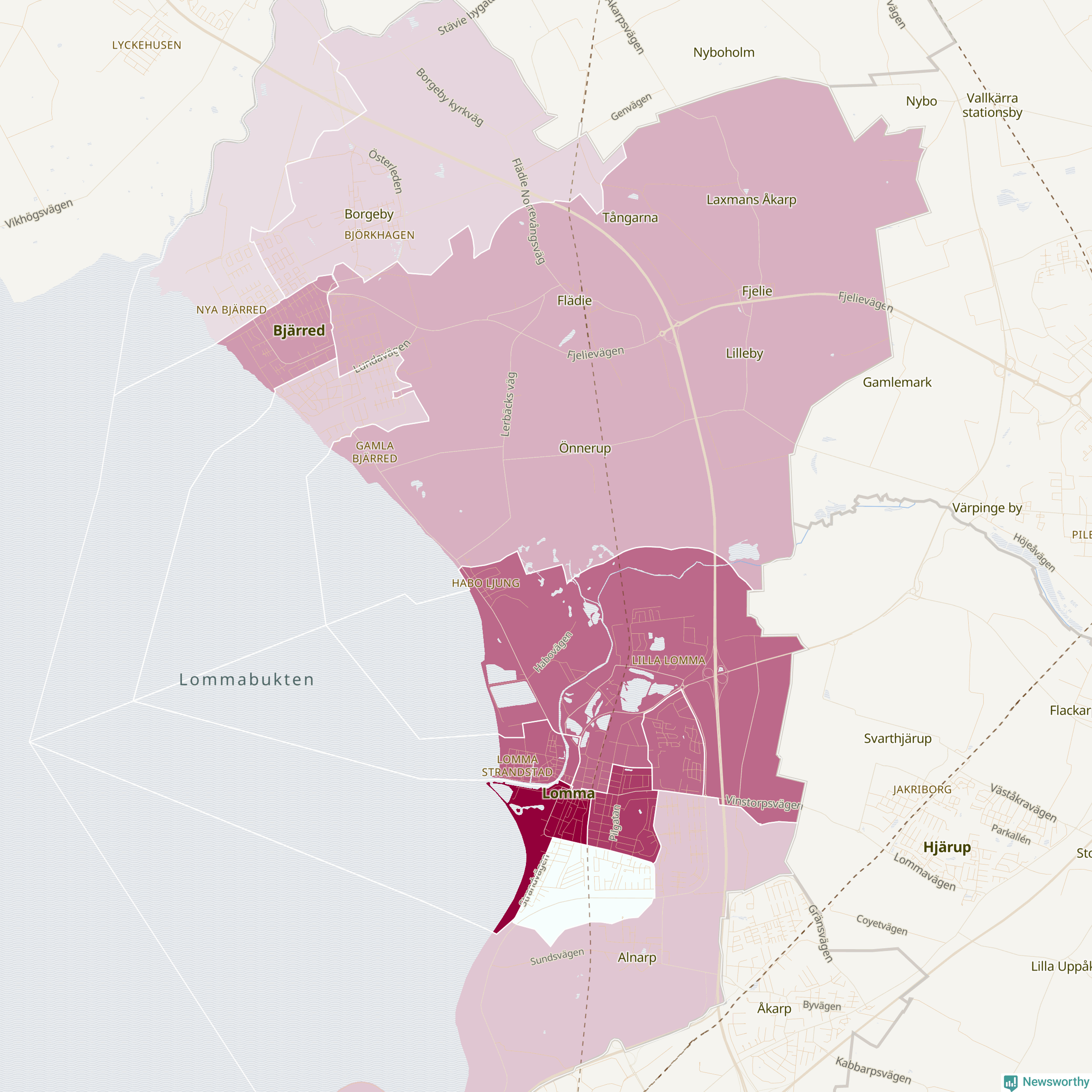 Men alla delar av Lomma är inte lika hårt drabbade. Det visar data för de senaste fem åren, som Newsworthy har begärt ut från polisen. De anmälda stölderna har kopplats till SCB:s tolv statistiska områden i kommunen. Det rör sig om mellan ett tiotal och ett åttiotal anmälda stölder per område.