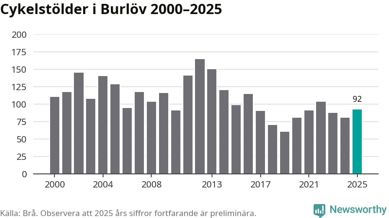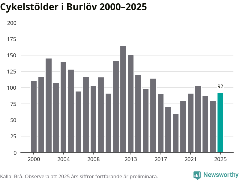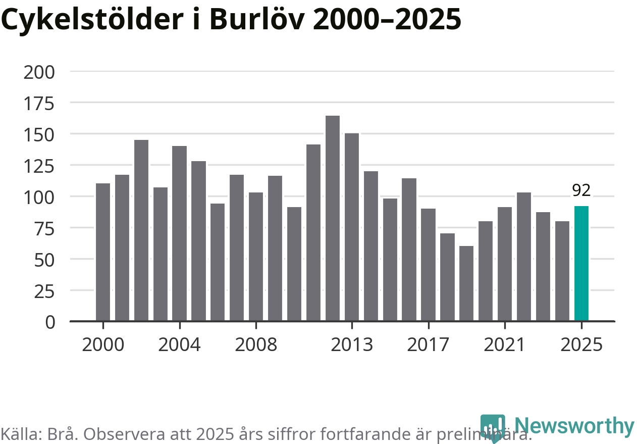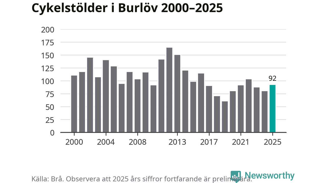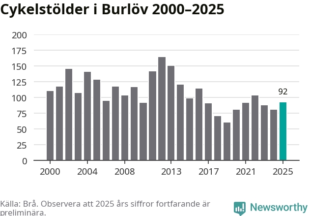 I Burlövs kommun sticker antalet cykelstölder 2025 inte ut i en historisk kontext. Under de senaste 25 åren har det som mest anmälts 164 cykelstölder på ett år (2012), som minst 60 stycken (2019).
