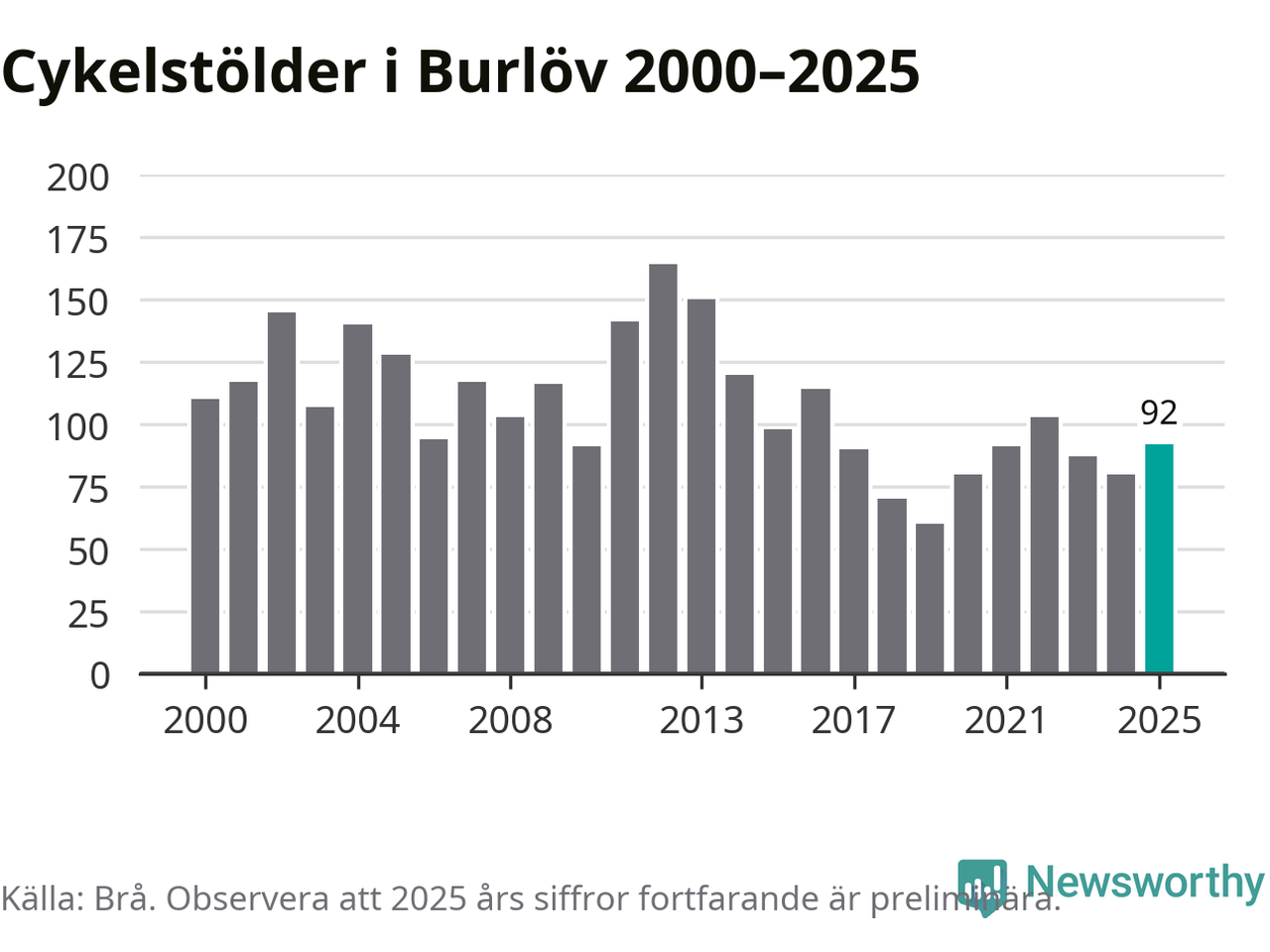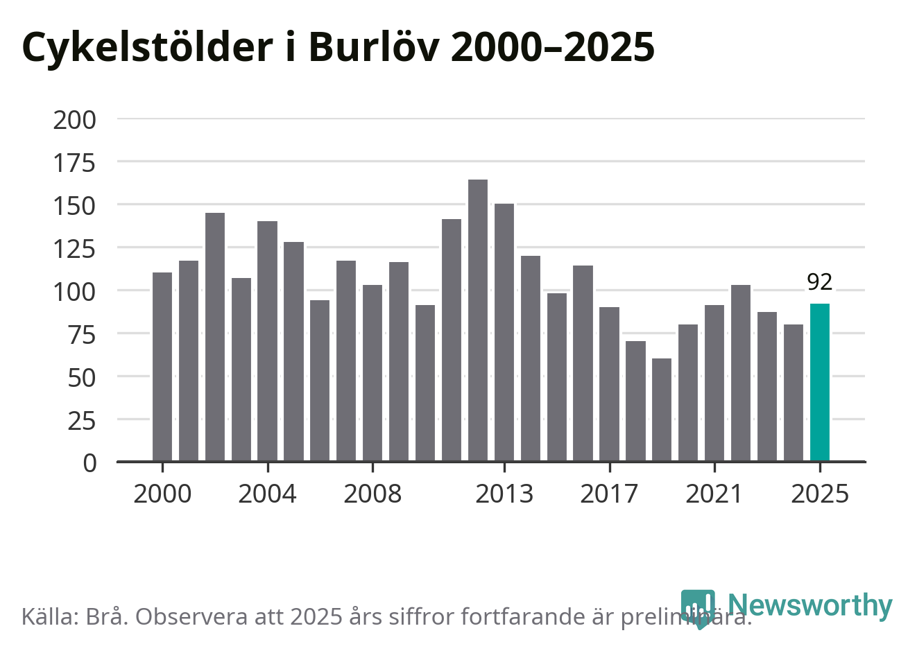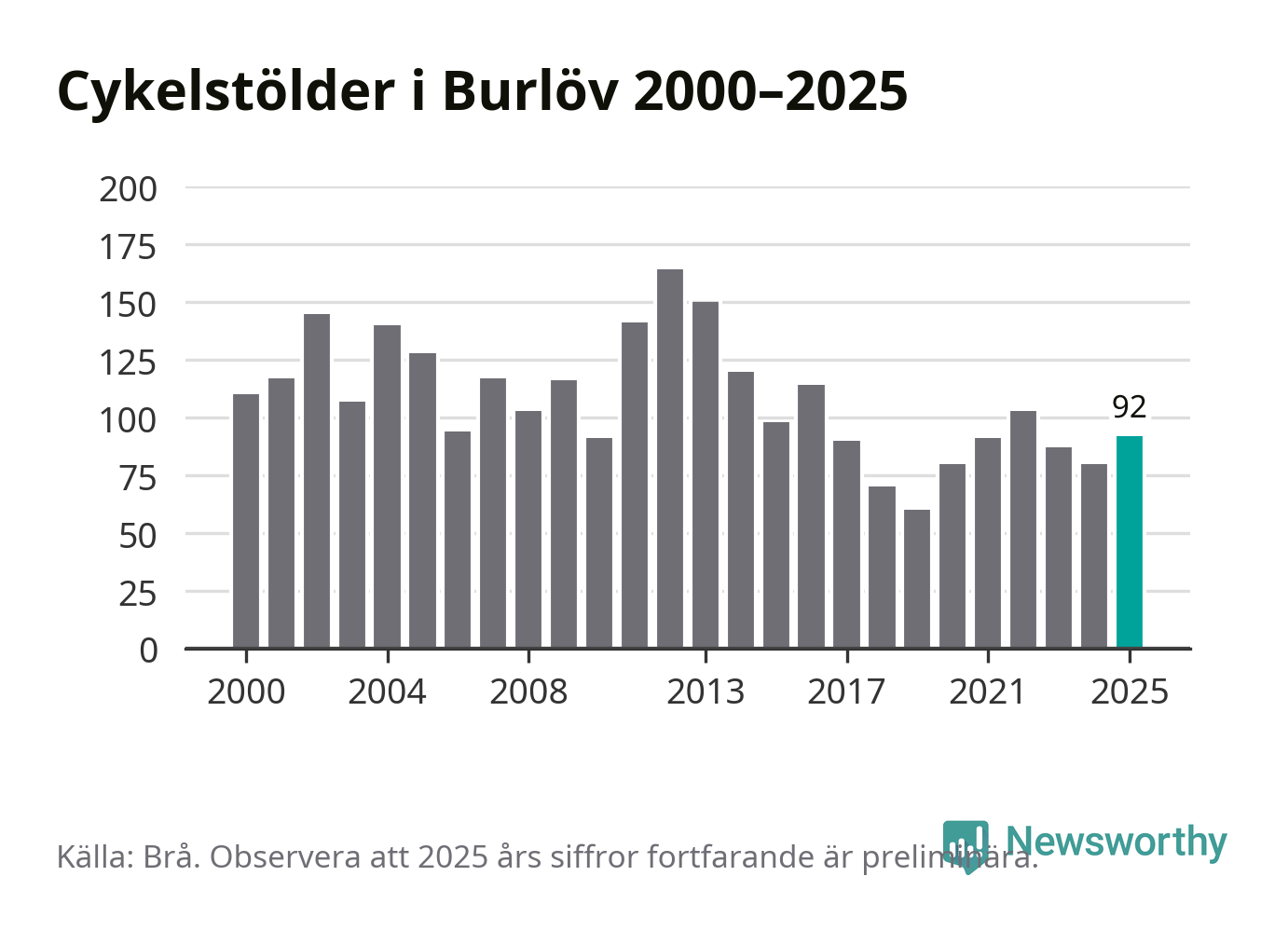 I Burlövs kommun sticker antalet cykelstölder 2025 inte ut i en historisk kontext. Under de senaste 25 åren har det som mest anmälts 164 cykelstölder på ett år (2012), som minst 60 stycken (2019).