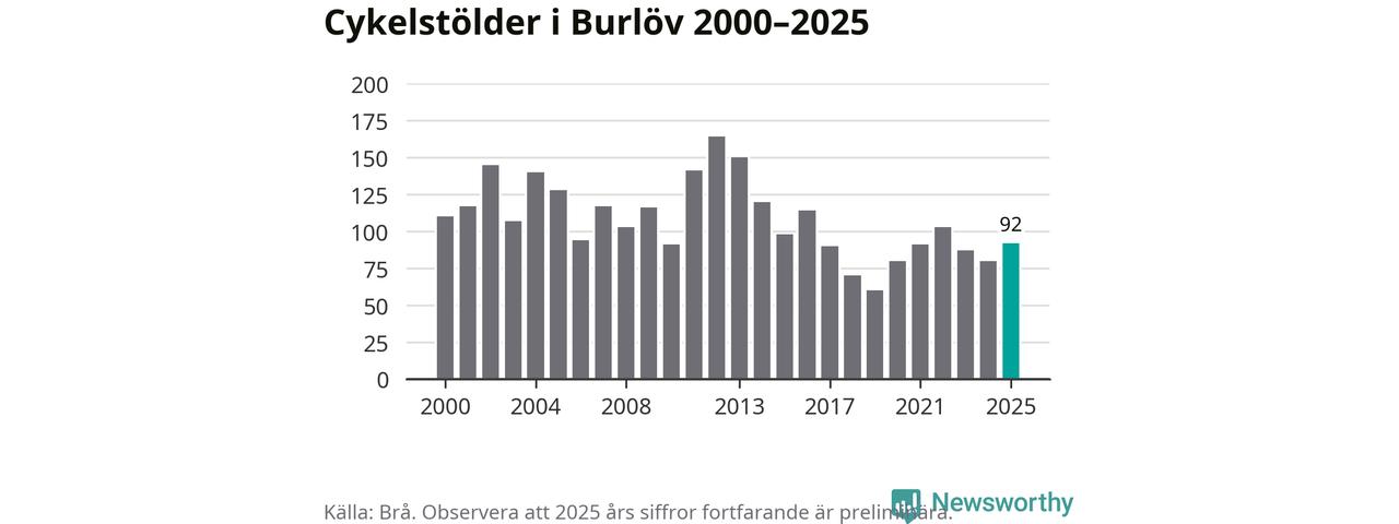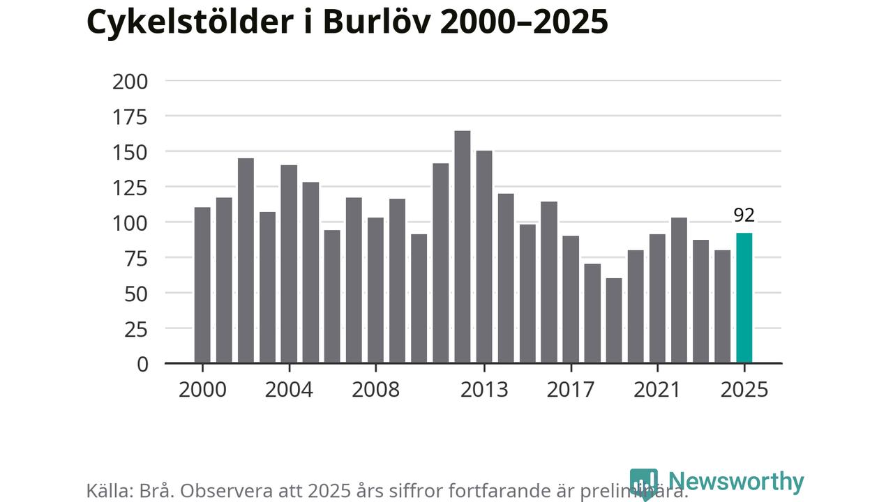 Av de 92 stöldanmälningar i Burlöv 2025 gällde 28 elcyklar, det motsvarar 30 procent. Brå särredovisar elcyklar sedan 2020 och i riket som helhet ökade anmälningarna om stulna elcyklar kraftigt de första åren, för att de senaste tre åren ha legat relativt stilla. Eftersom antalet cykelstölder totalt har minskat under samma tid har andelen elcyklar ökat. I fjol stod elcyklar för 28 procent av alla anmälda cykelstölder i landet.