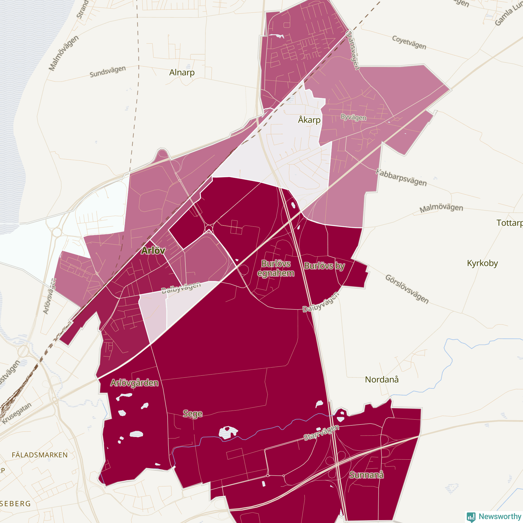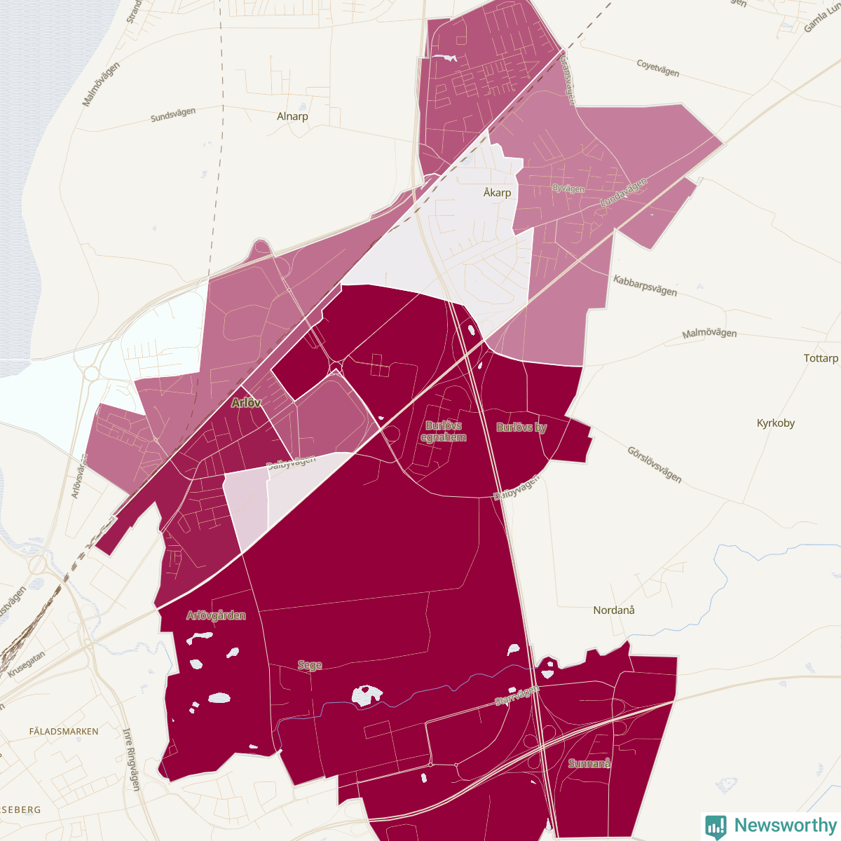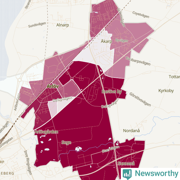 Men alla delar av Burlöv är inte lika hårt drabbade. Det visar data för de senaste fem åren, som Newsworthy har begärt ut från polisen. De anmälda stölderna har kopplats till SCB:s tio statistiska områden i kommunen. Det rör sig om mellan ett tiotal och ett sextiotal anmälda stölder per område.