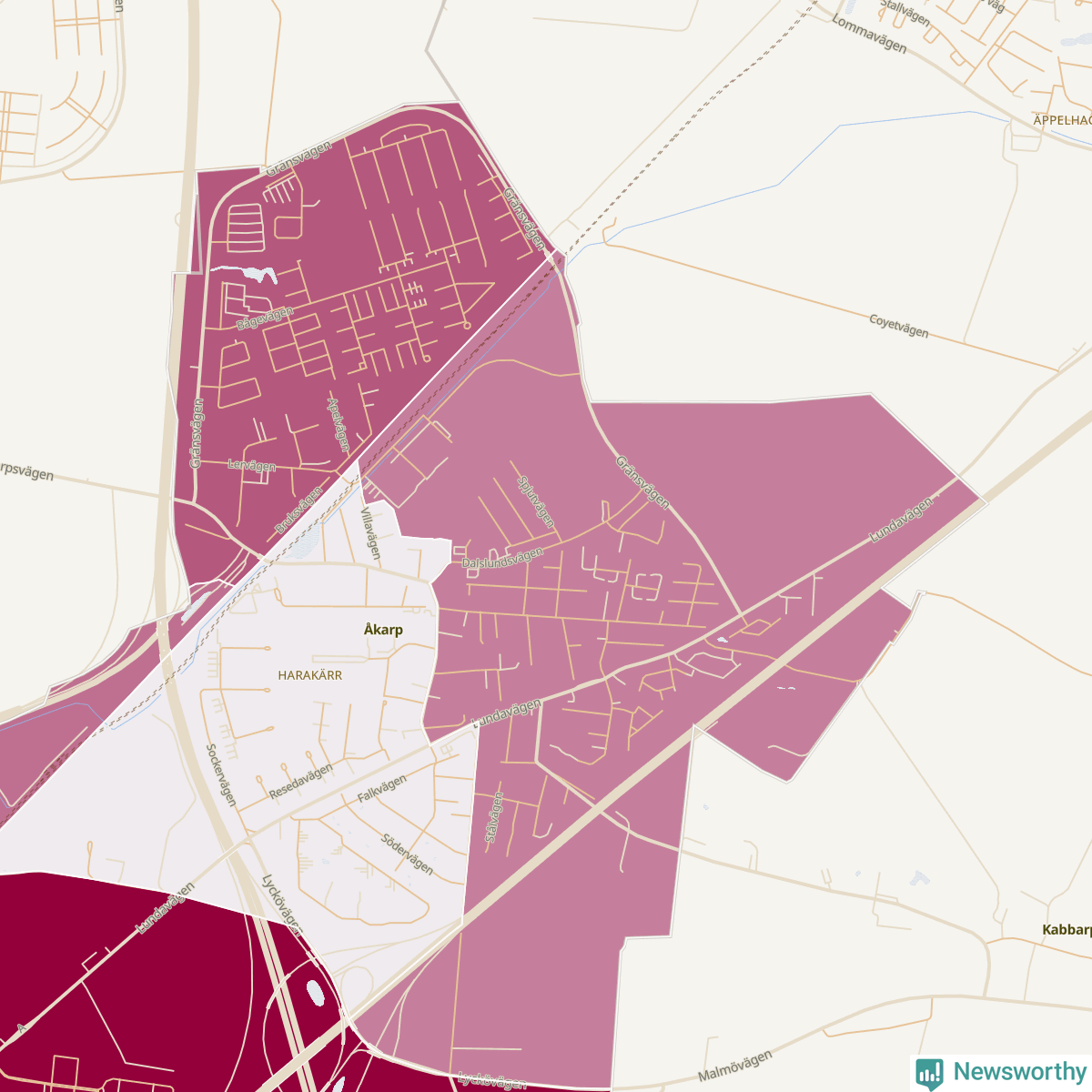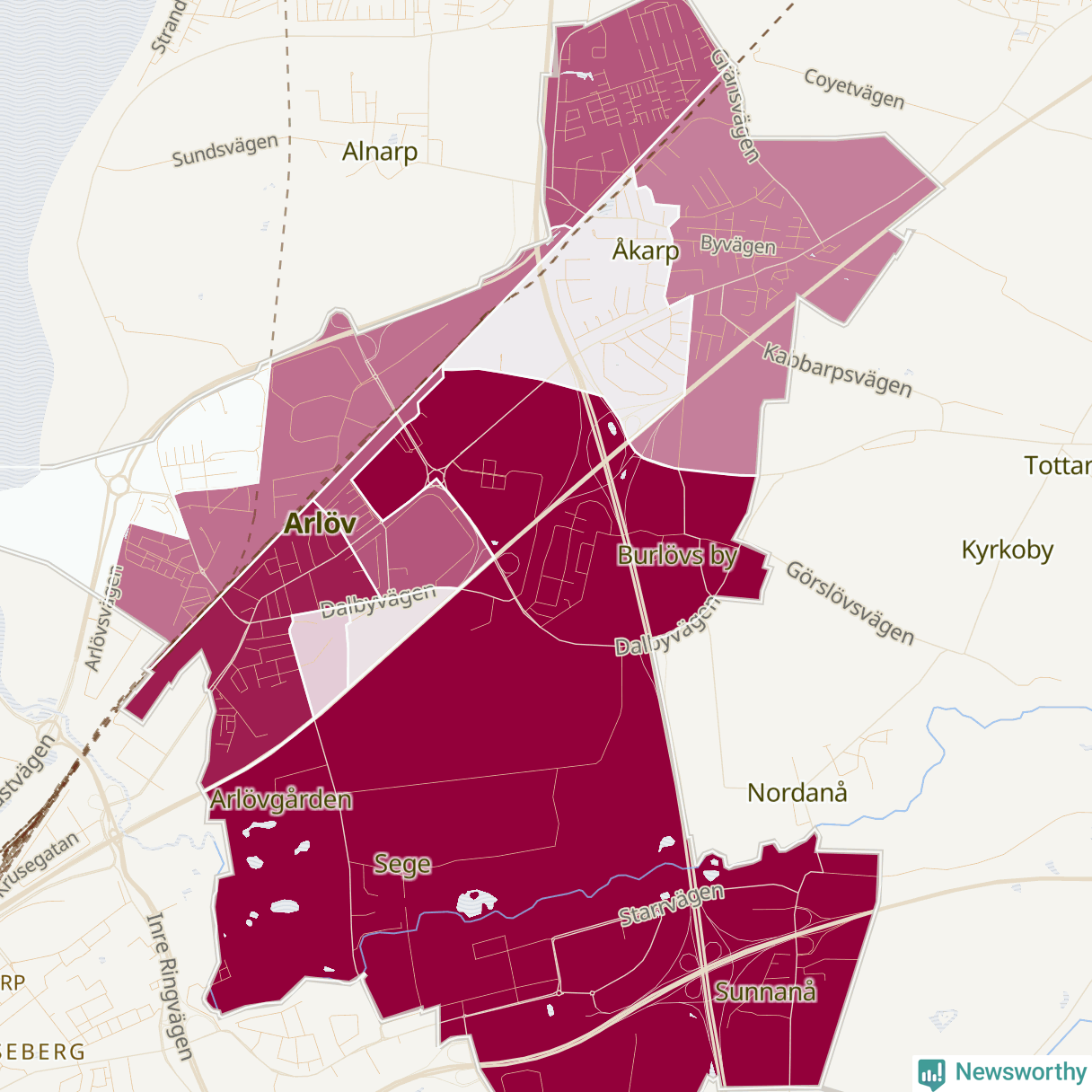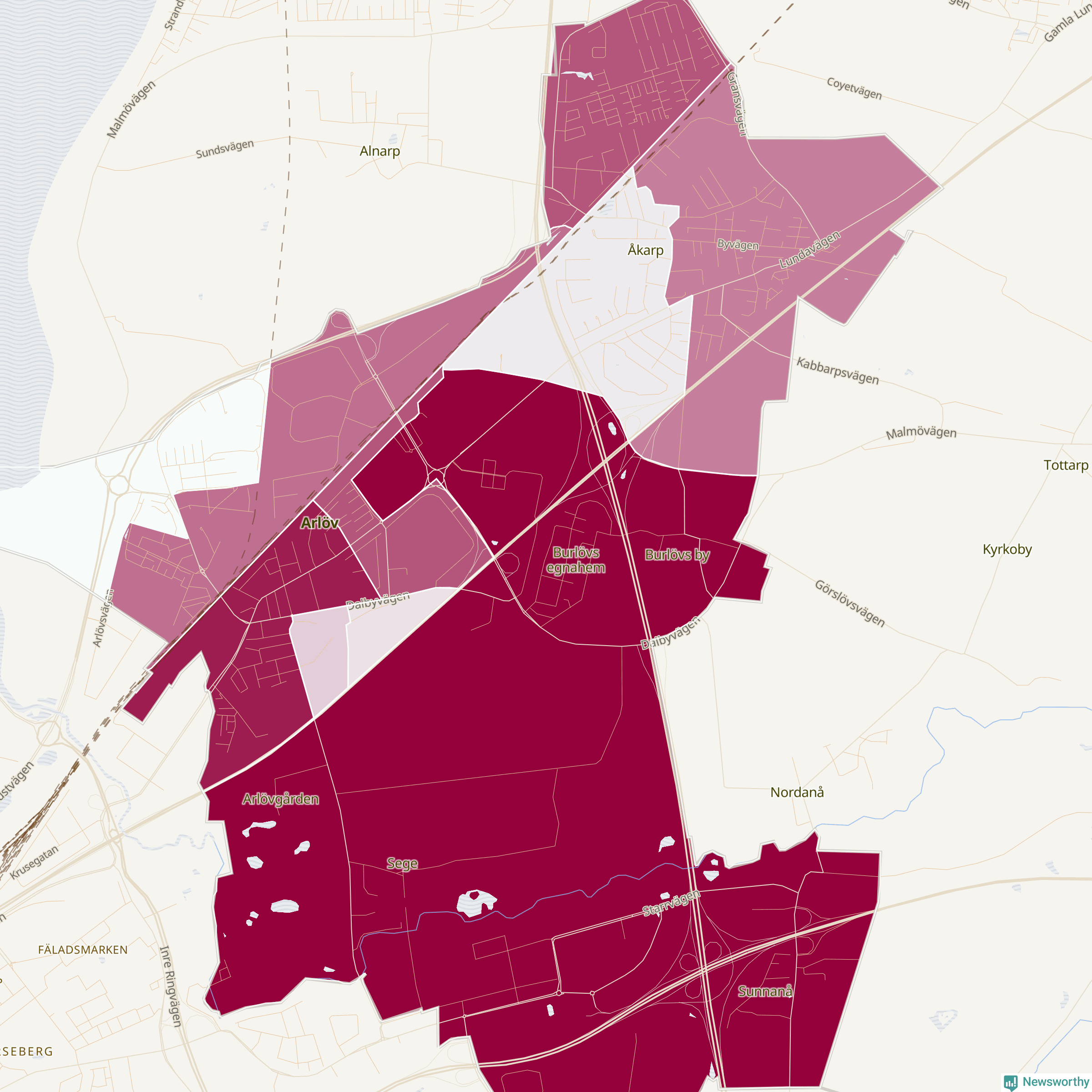 Men alla delar av Burlöv är inte lika hårt drabbade. Det visar data för de senaste fem åren, som Newsworthy har begärt ut från polisen. De anmälda stölderna har kopplats till SCB:s tio statistiska områden i kommunen. Det rör sig om mellan ett tiotal och ett sextiotal anmälda stölder per område.