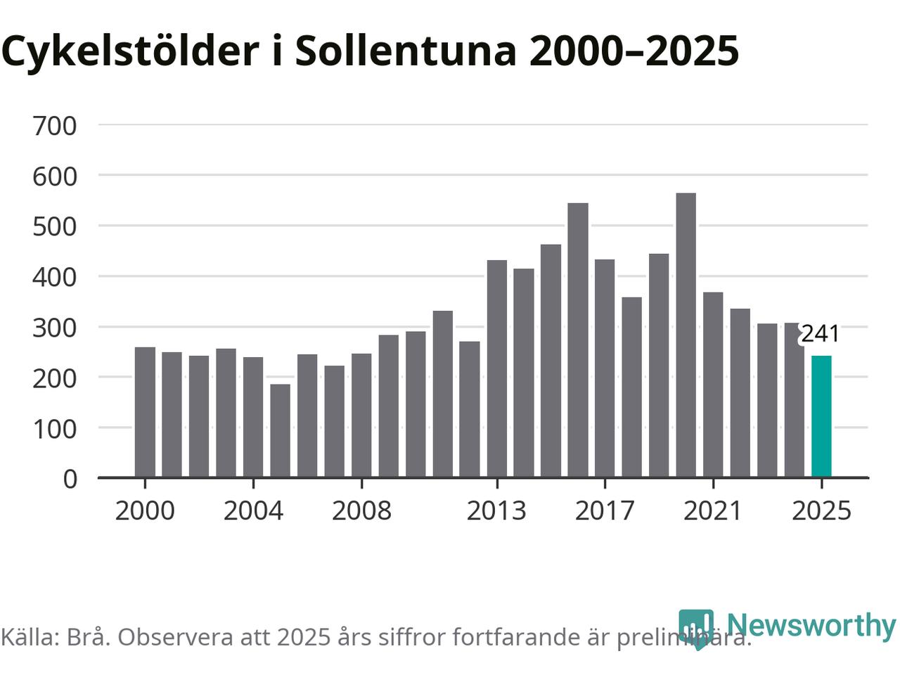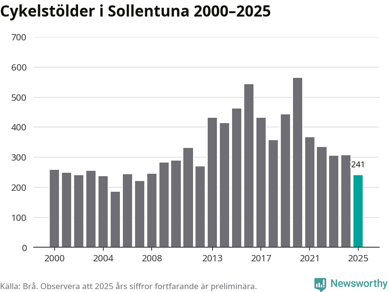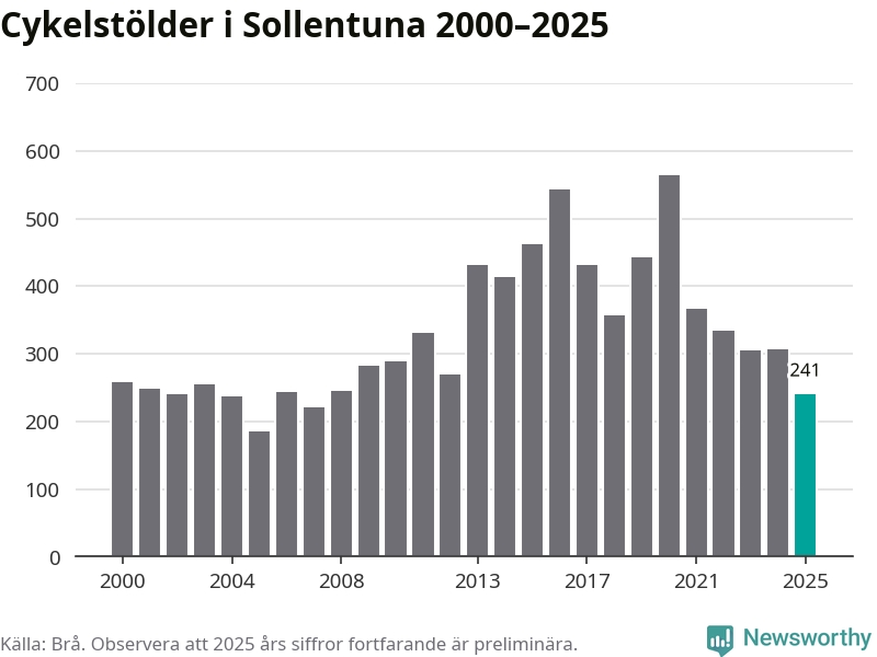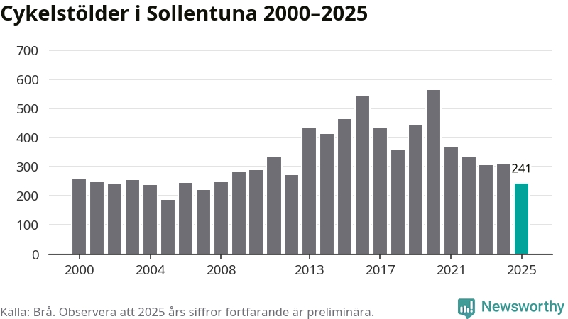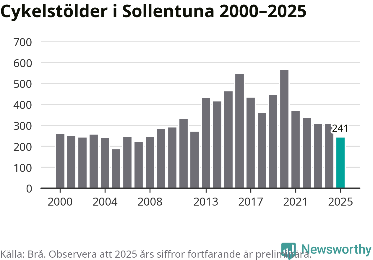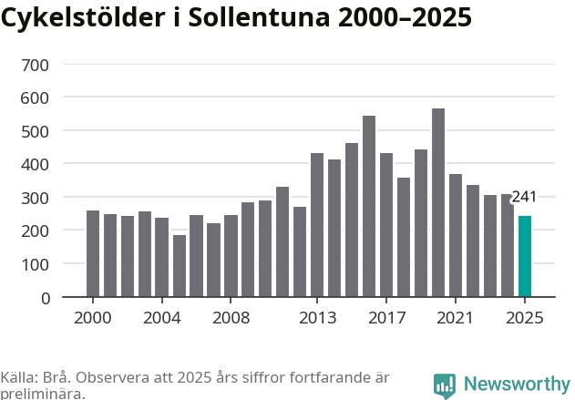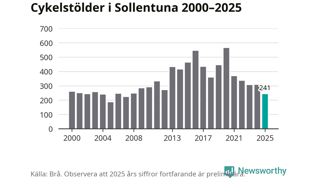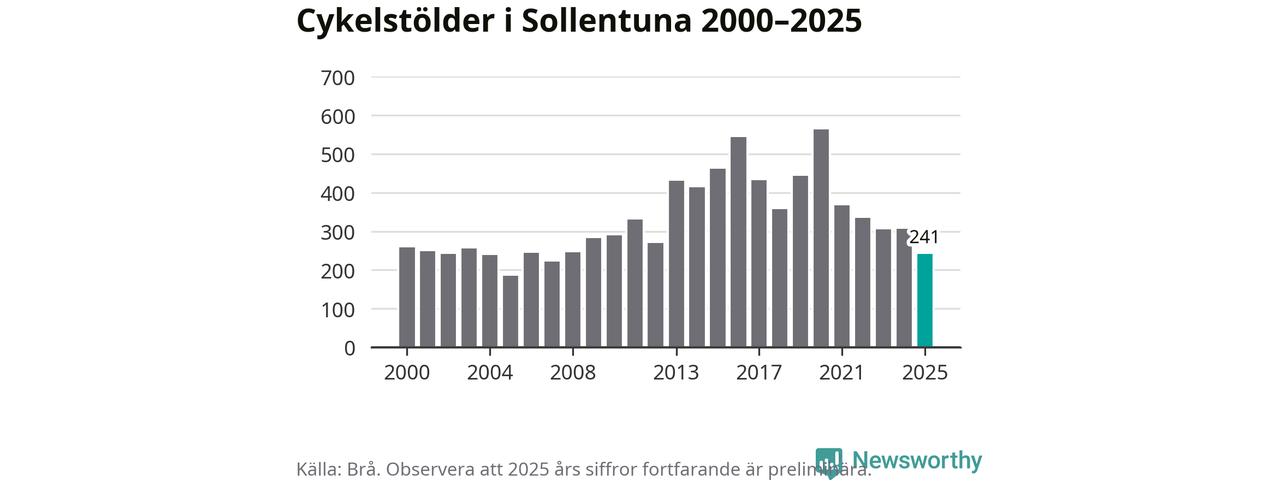 I Sollentuna kommun var antalet cykelstölder relativt få i en historisk kontext år 2025, även om det fortfarande är preliminära siffror. Under de senaste 25 åren har det som mest anmälts 564 cykelstölder på ett år (2020), som minst 185 stycken (2005).
