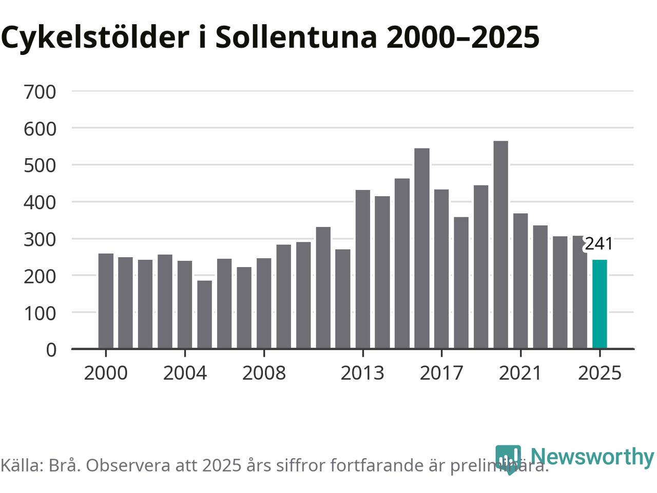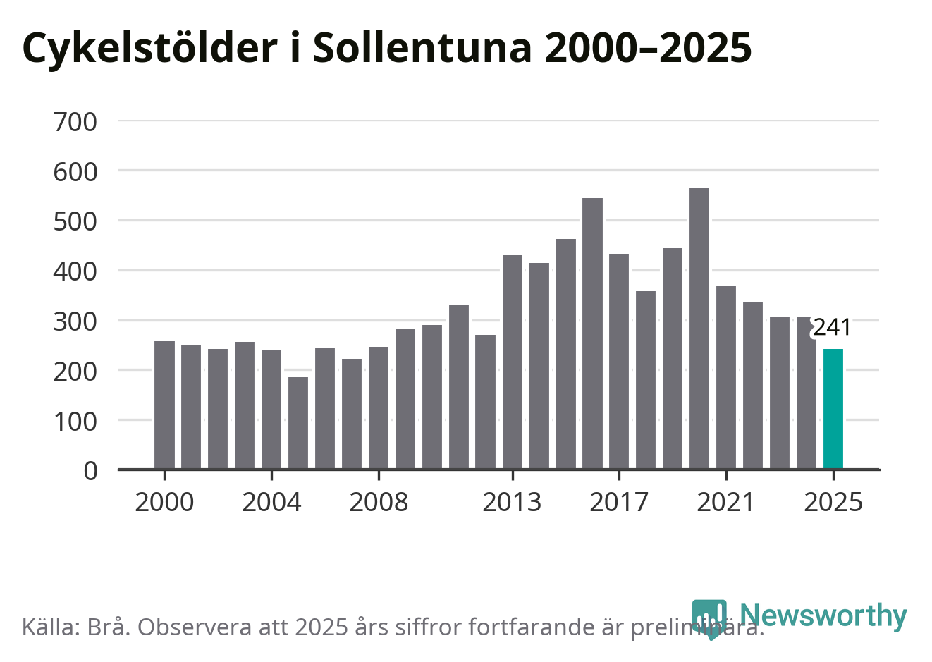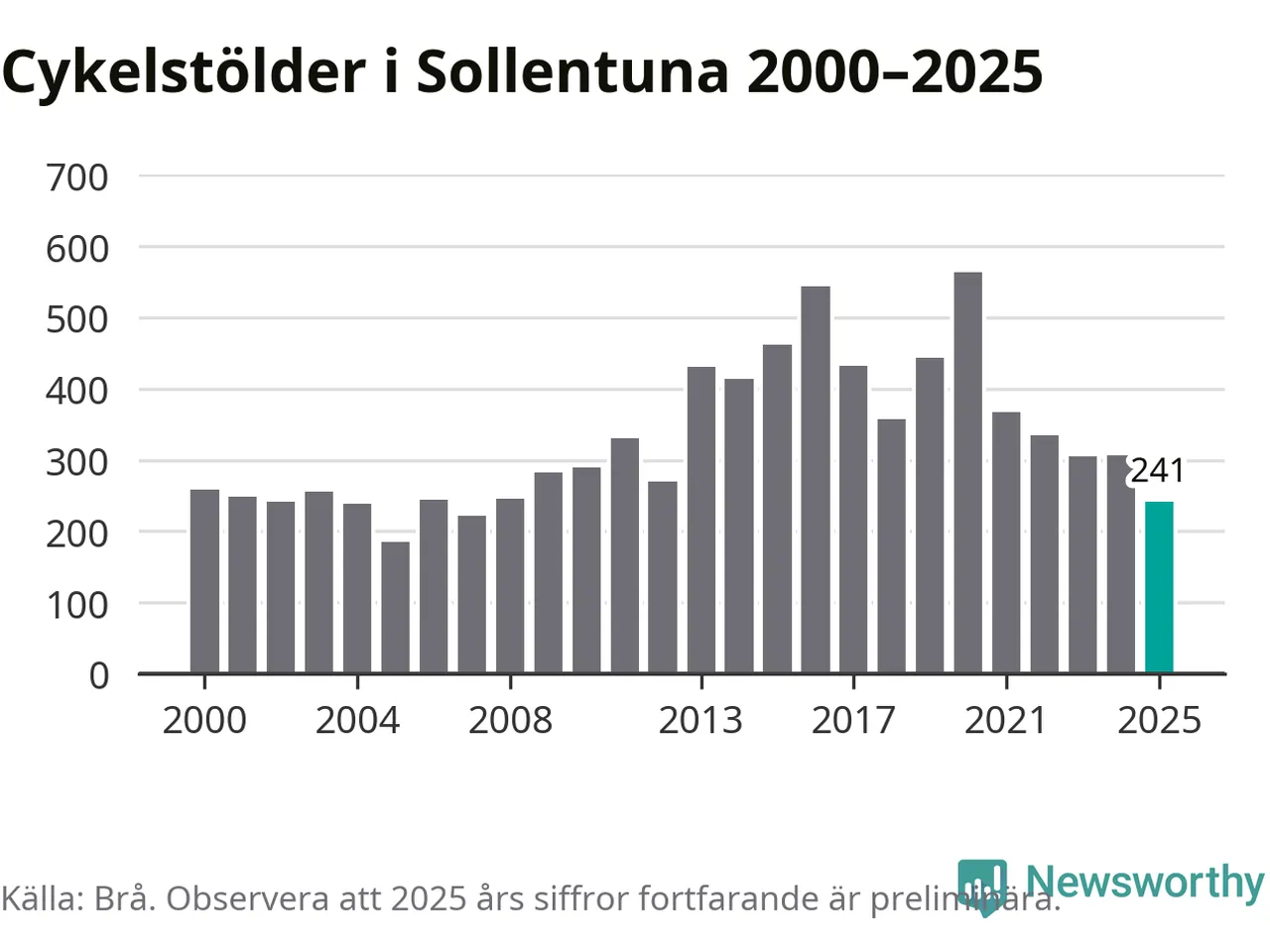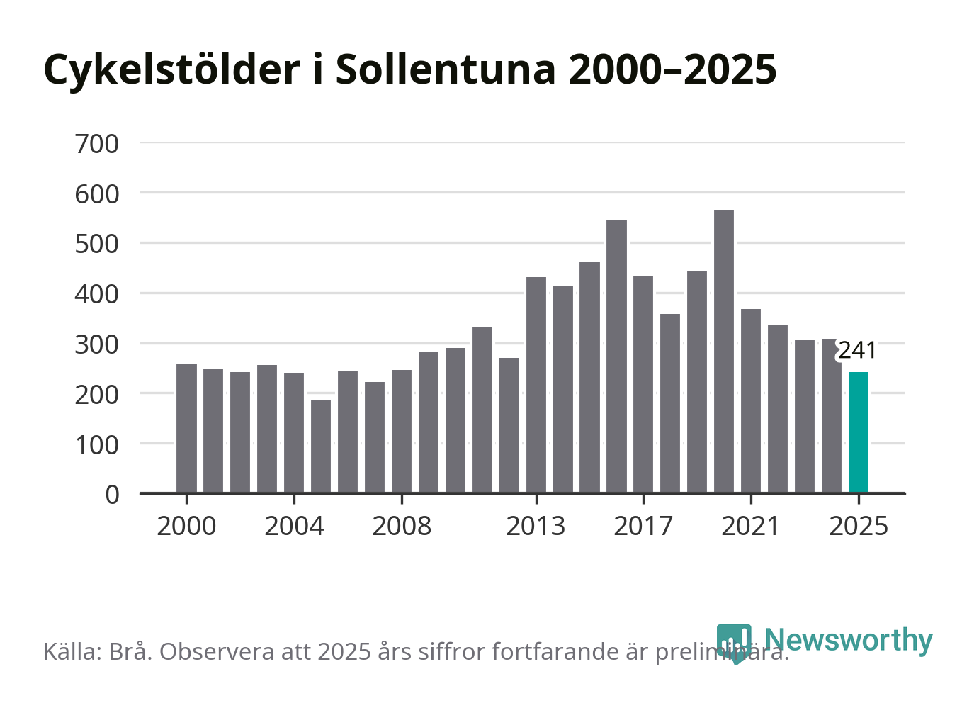 I Sollentuna kommun var antalet cykelstölder relativt få i en historisk kontext år 2025, även om det fortfarande är preliminära siffror. Under de senaste 25 åren har det som mest anmälts 564 cykelstölder på ett år (2020), som minst 185 stycken (2005).