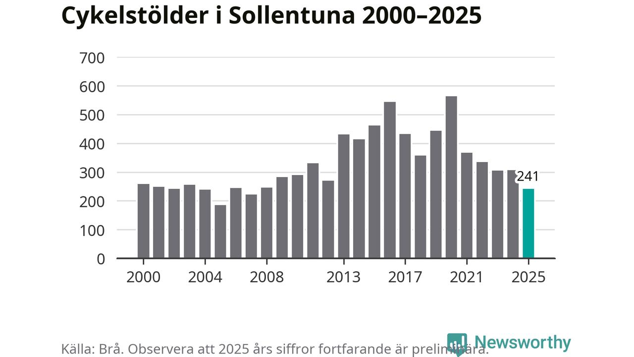 Av de 241 stöldanmälningar i Sollentuna 2025 gällde 36 elcyklar, det motsvarar 15 procent. Brå särredovisar elcyklar sedan 2020 och i riket som helhet ökade anmälningarna om stulna elcyklar kraftigt de första åren, för att de senaste tre åren ha legat relativt stilla. Eftersom antalet cykelstölder totalt har minskat under samma tid har andelen elcyklar ökat. I fjol stod elcyklar för 28 procent av alla anmälda cykelstölder i landet.