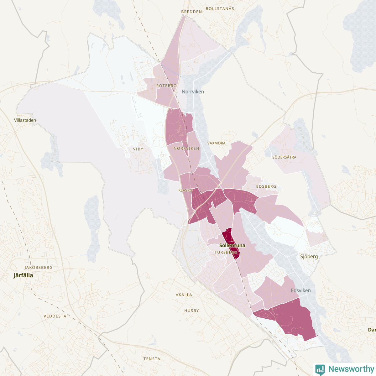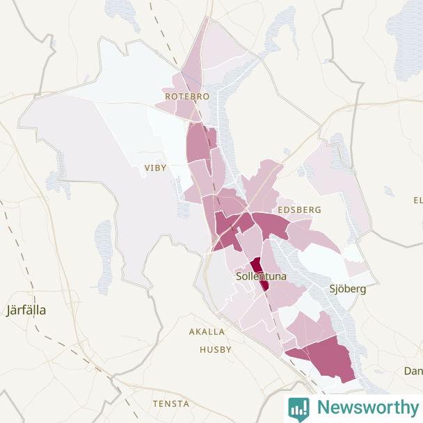 Men alla delar av Sollentuna är inte lika hårt drabbade. Det visar data för de senaste fem åren, som Newsworthy har begärt ut från polisen. De anmälda stölderna har kopplats till SCB:s 42 statistiska områden i kommunen. I ett område finns inga cykelstölder registrerade, men i de övriga rör det sig om mellan en handfull och drygt 100 anmälda stölder per område.