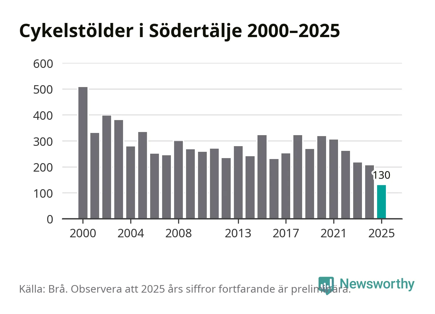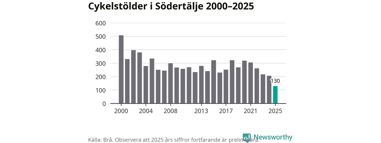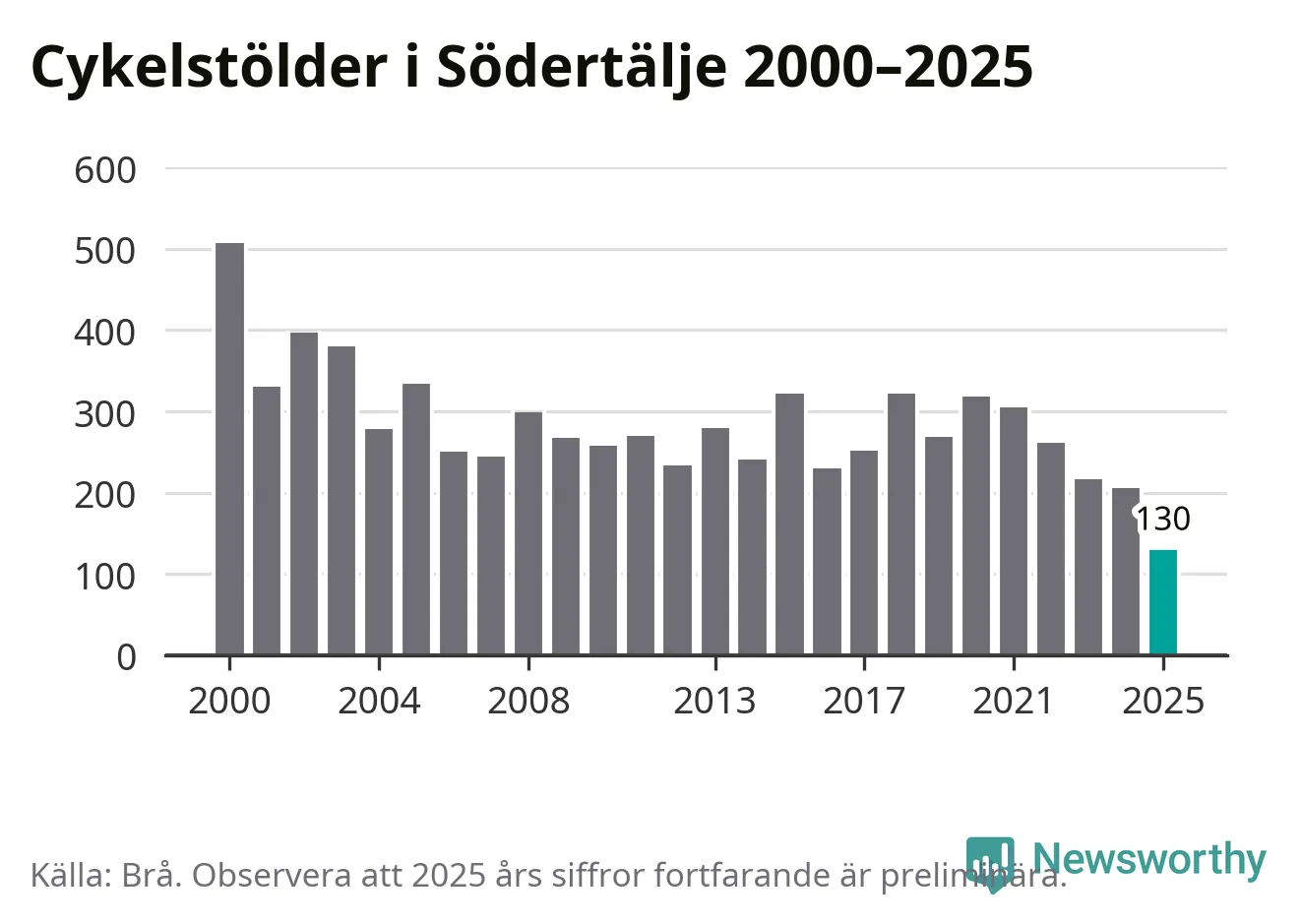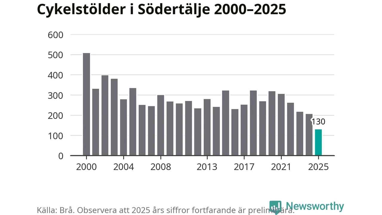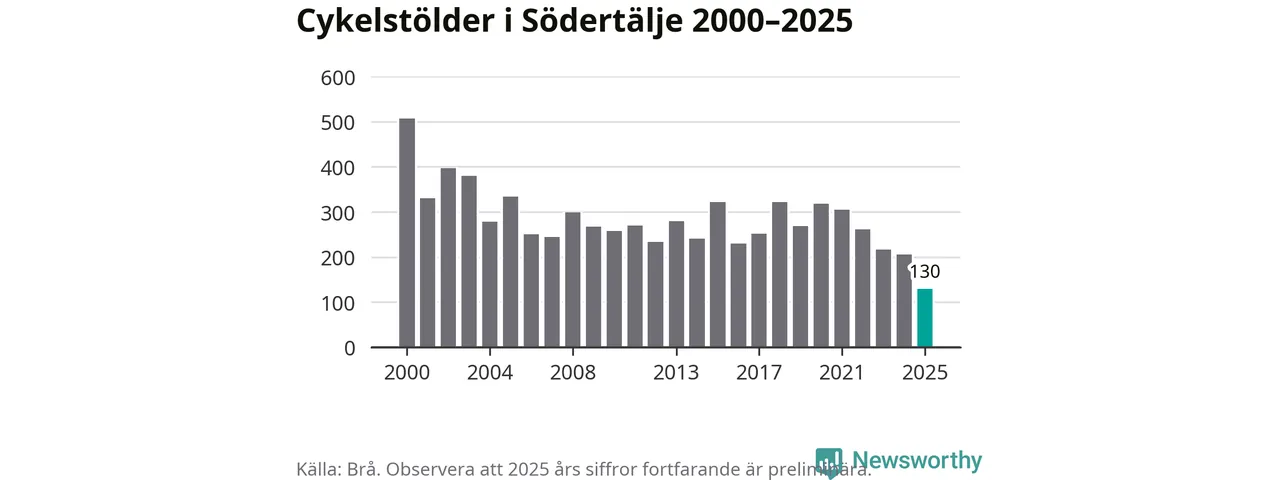 I Södertälje kommun noterades det lägsta antalet cykelstölder under hela 2000-talet år 2025, även om det fortfarande är preliminära siffror. Under de senaste 25 åren har det som mest anmälts 507 cykelstölder på ett år (2000).