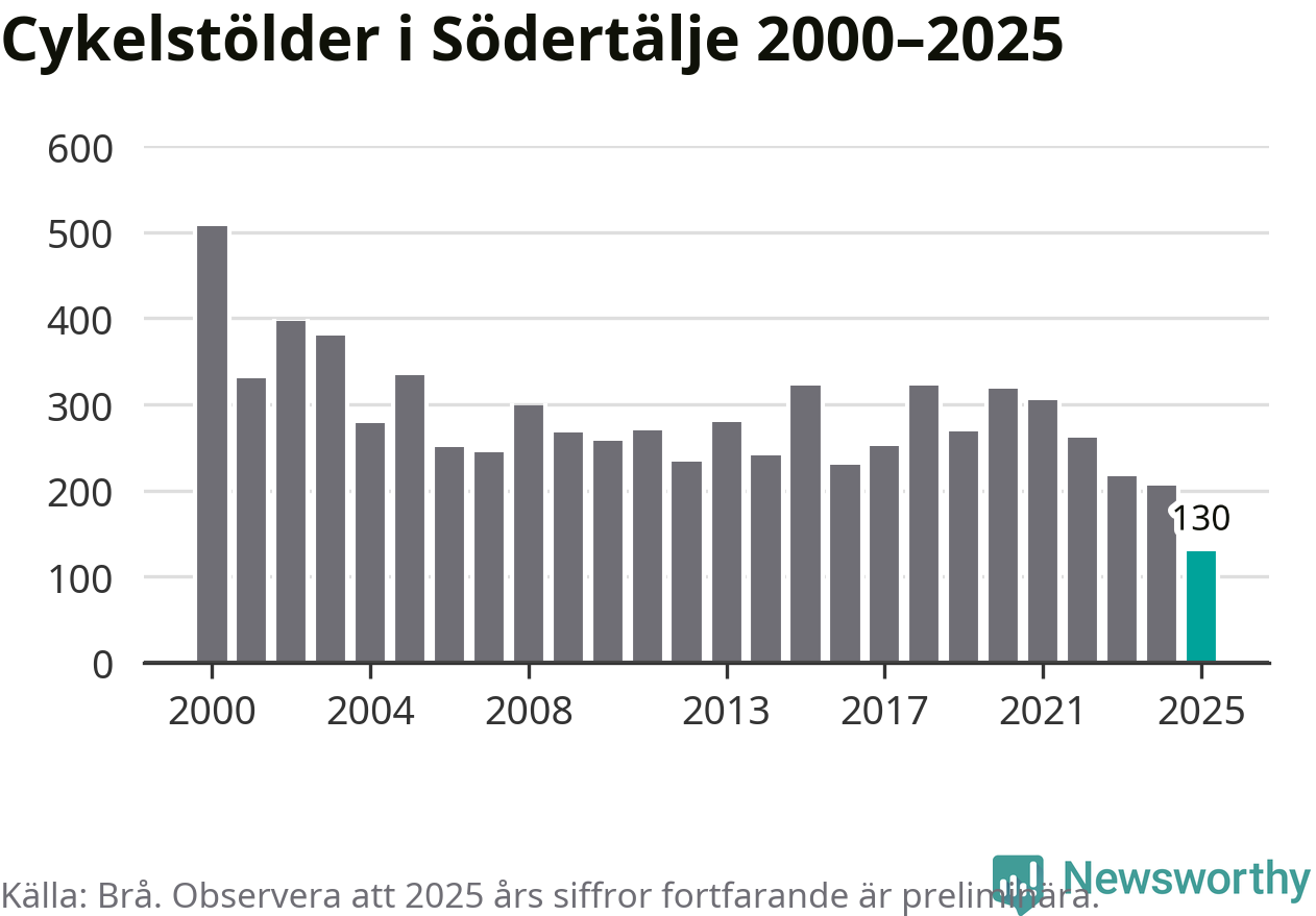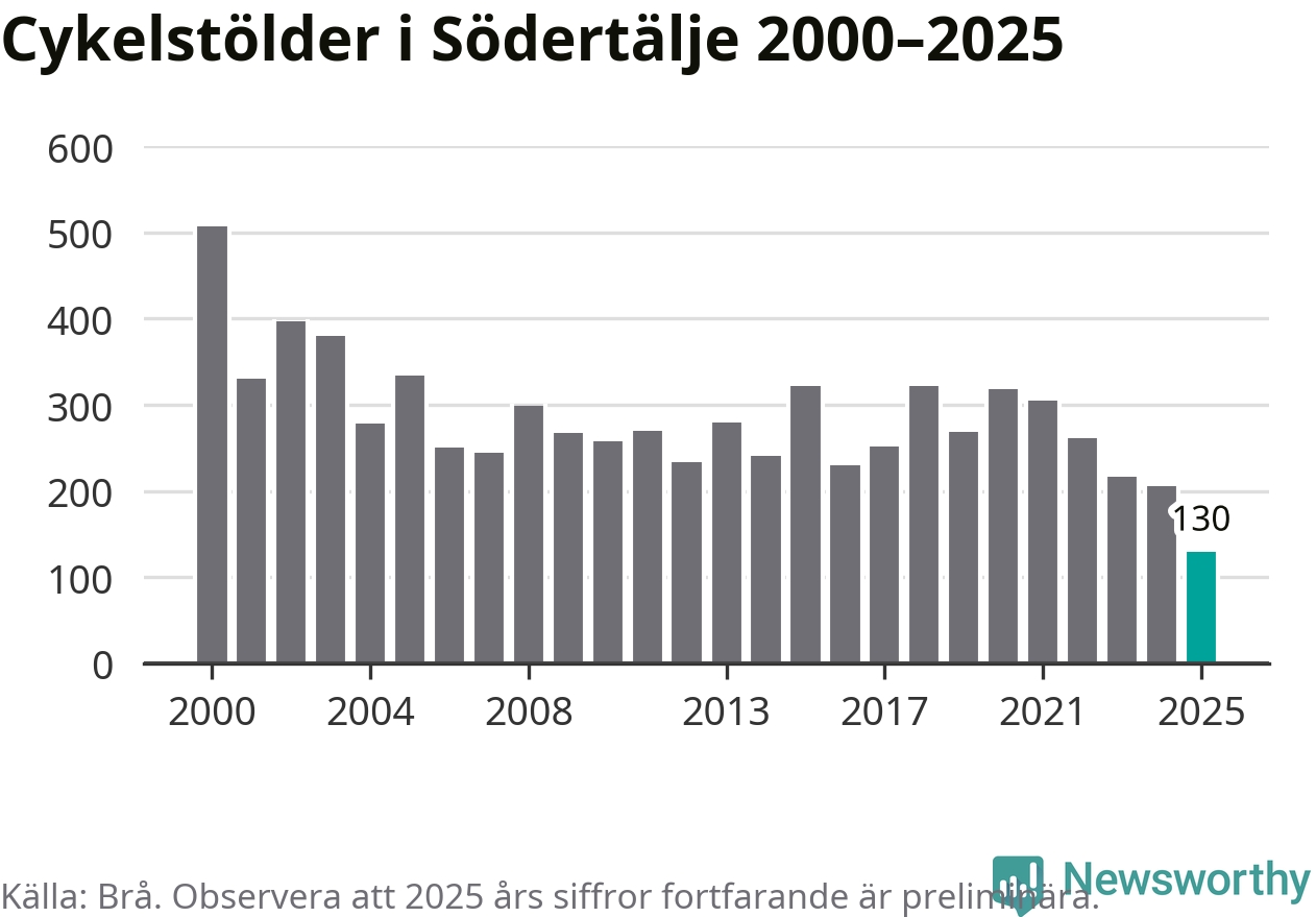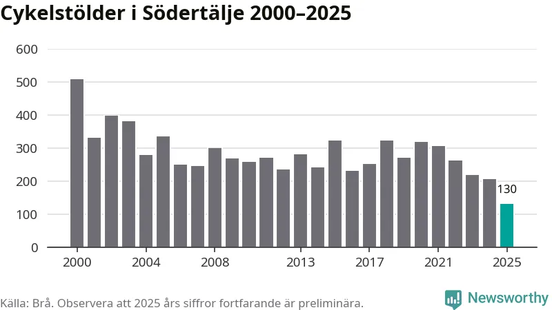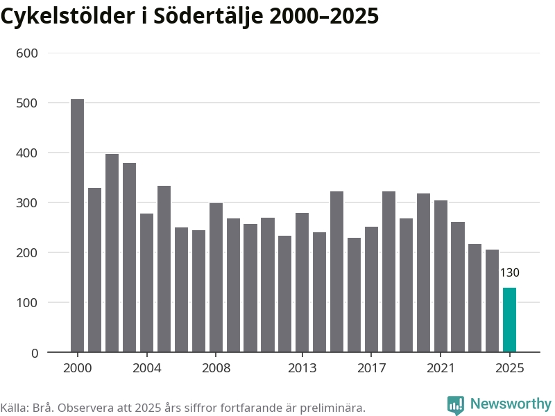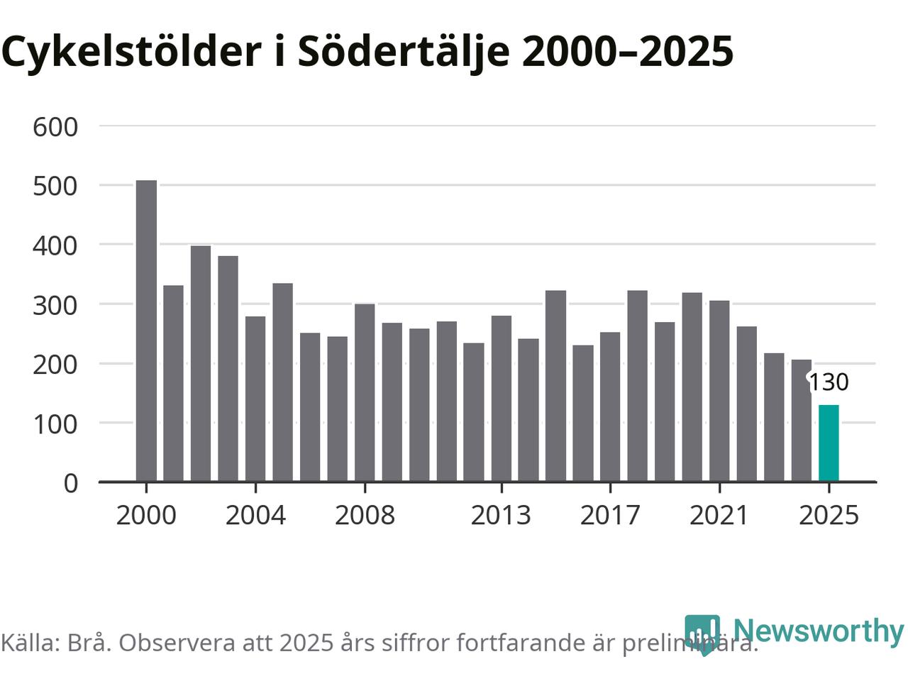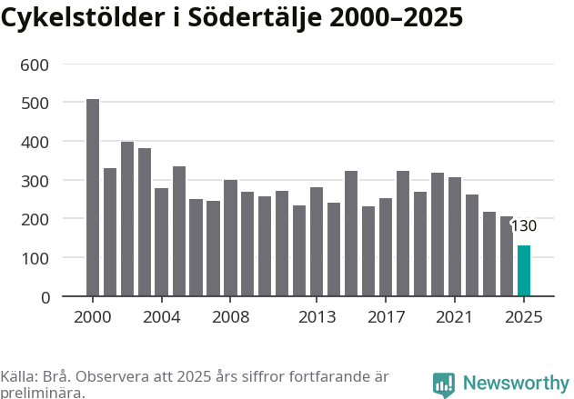 I Södertälje kommun noterades det lägsta antalet cykelstölder under hela 2000-talet år 2025, även om det fortfarande är preliminära siffror. Under de senaste 25 åren har det som mest anmälts 507 cykelstölder på ett år (2000).