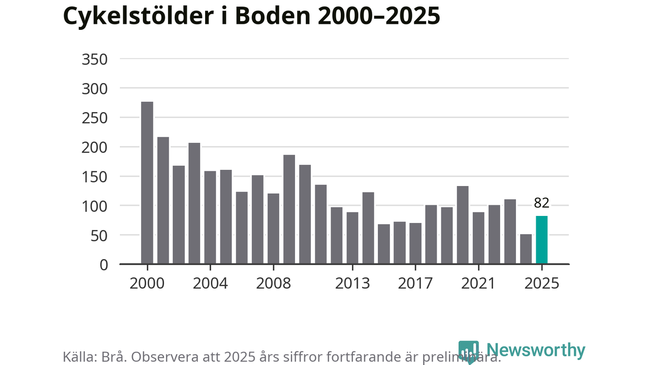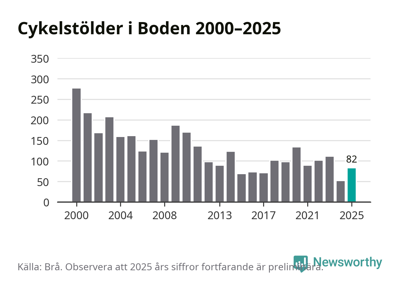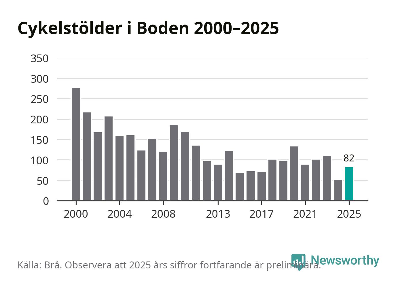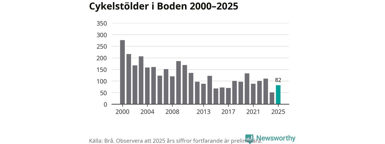 I Bodens kommun var antalet cykelstölder relativt få i en historisk kontext år 2025, även om det fortfarande är preliminära siffror. Under de senaste 25 åren har det som mest anmälts 276 cykelstölder på ett år (2000), som minst 51 stycken (2024).