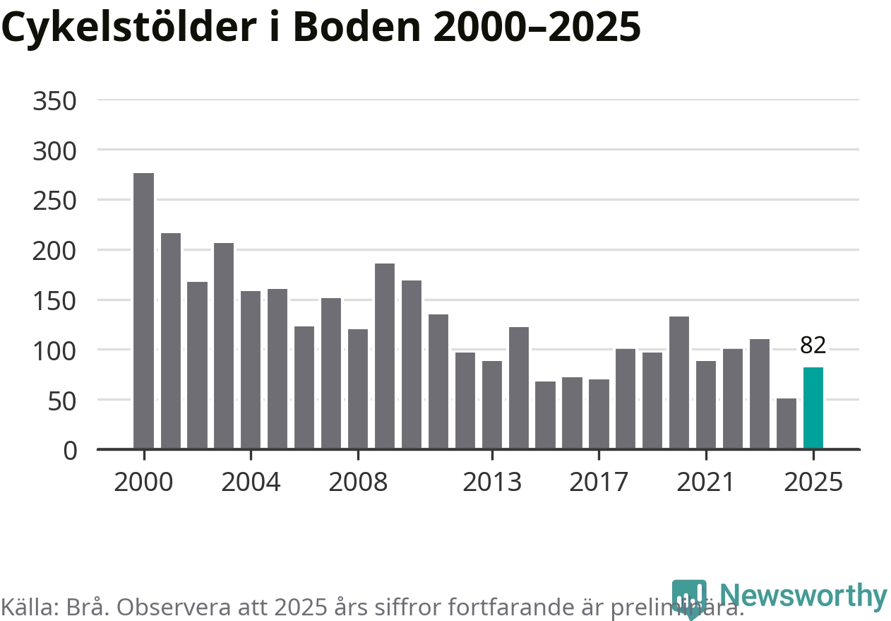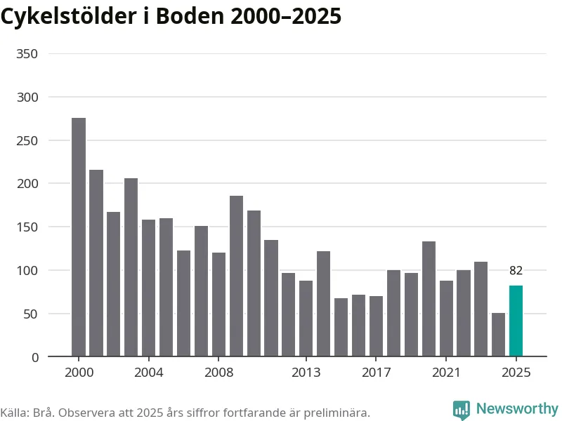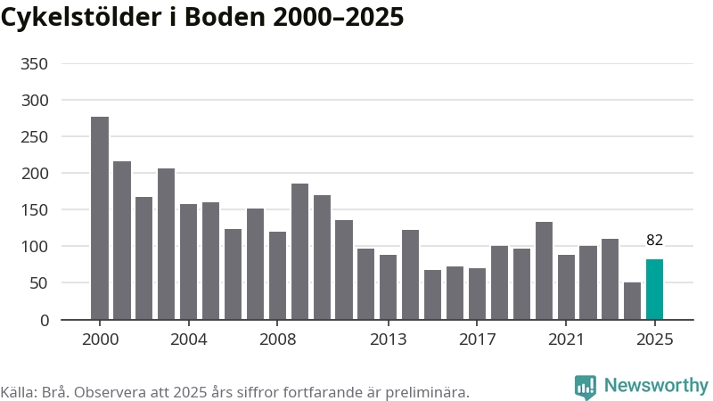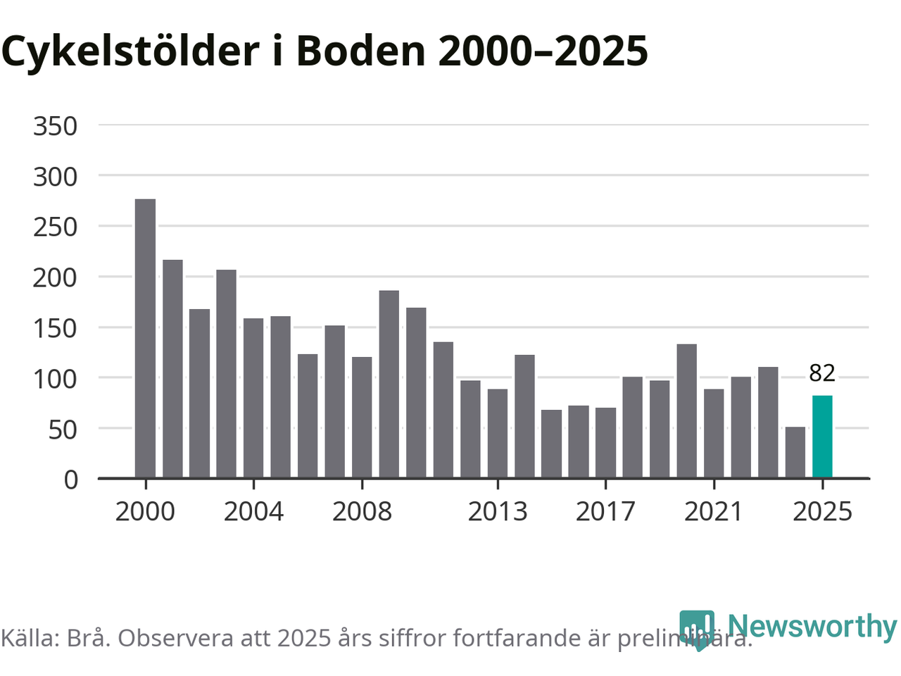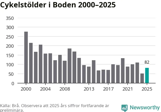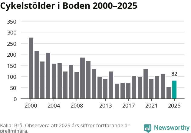 I Bodens kommun var antalet cykelstölder relativt få i en historisk kontext år 2025, även om det fortfarande är preliminära siffror. Under de senaste 25 åren har det som mest anmälts 276 cykelstölder på ett år (2000), som minst 51 stycken (2024).