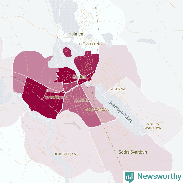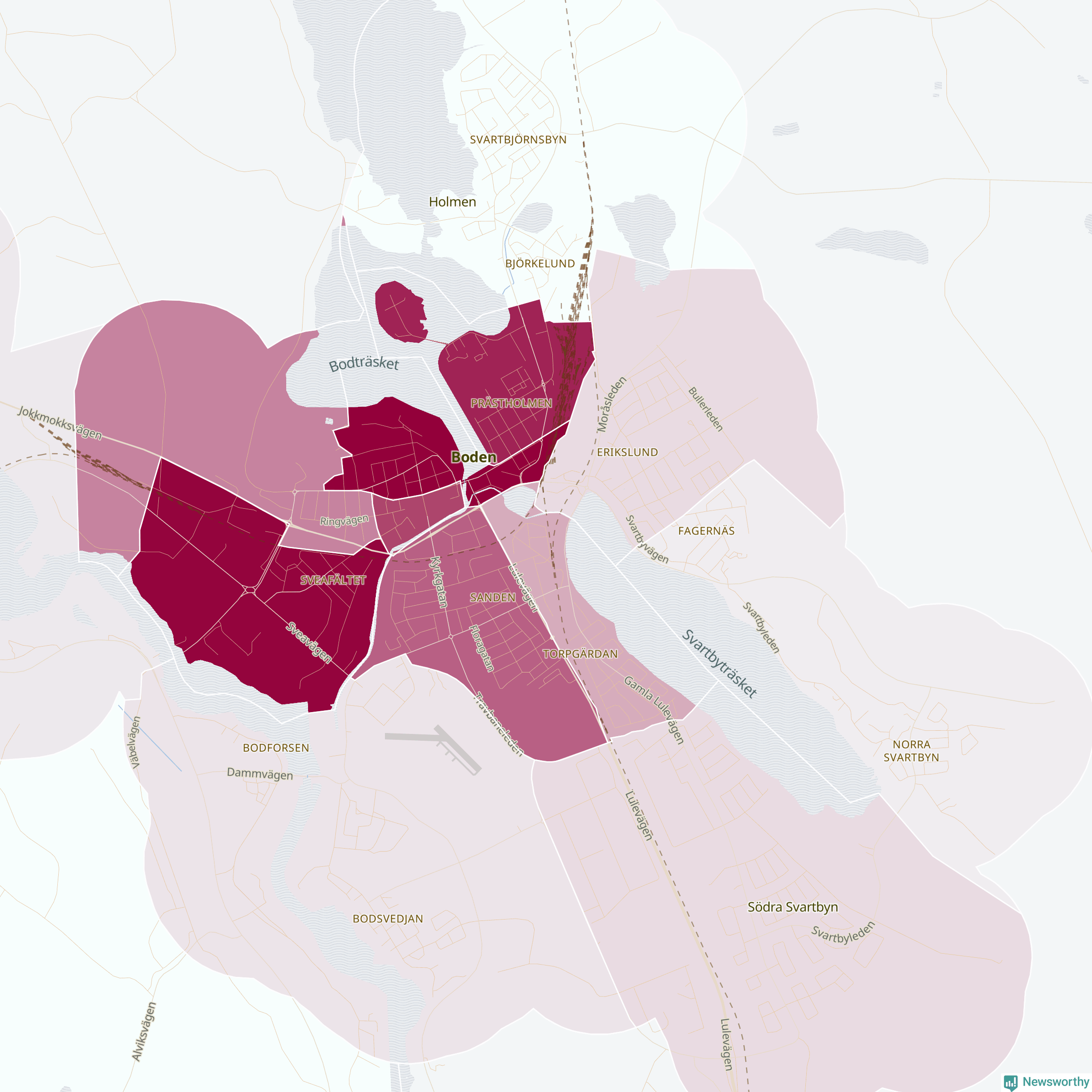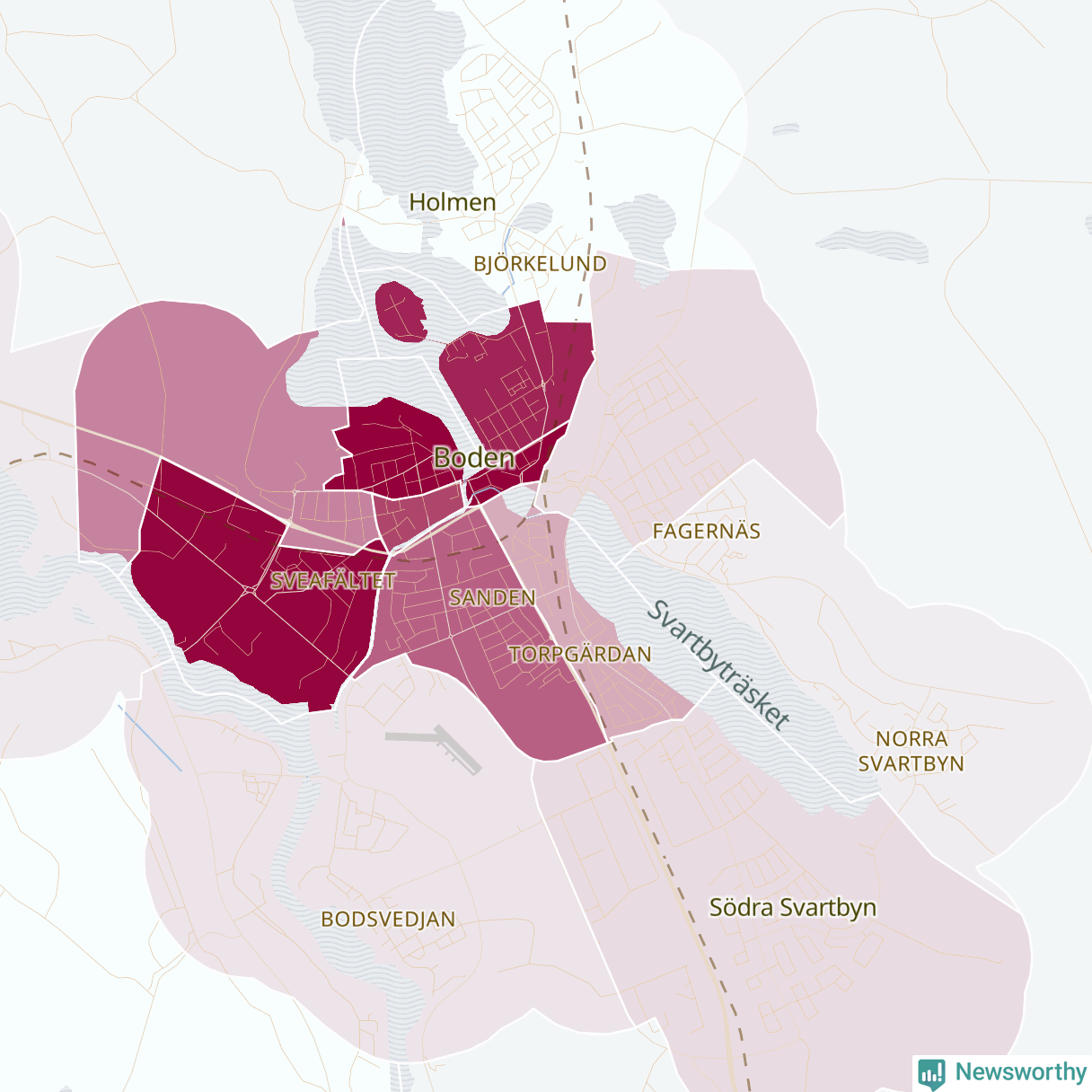 Men alla delar av Boden är inte lika hårt drabbade. Det visar data för de senaste fem åren, som Newsworthy har begärt ut från polisen. De anmälda stölderna har kopplats till SCB:s 18 statistiska områden i kommunen. I två områden finns inga cykelstölder registrerade, men i de övriga rör det sig om mellan en handfull och ett sextiotal anmälda stölder per område.