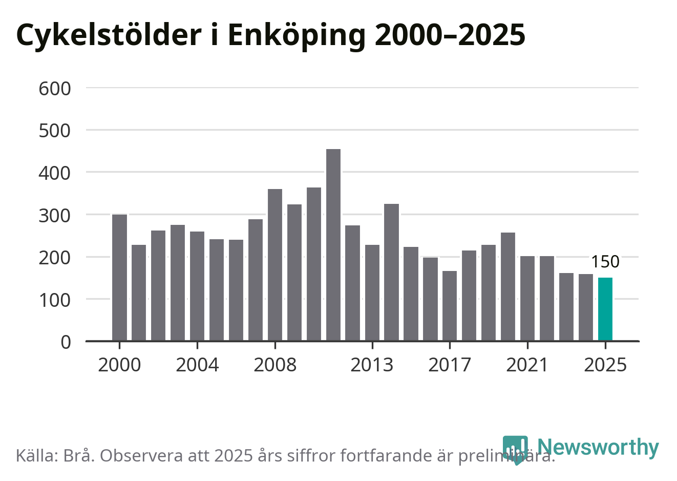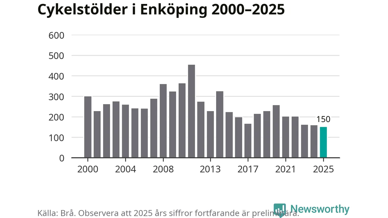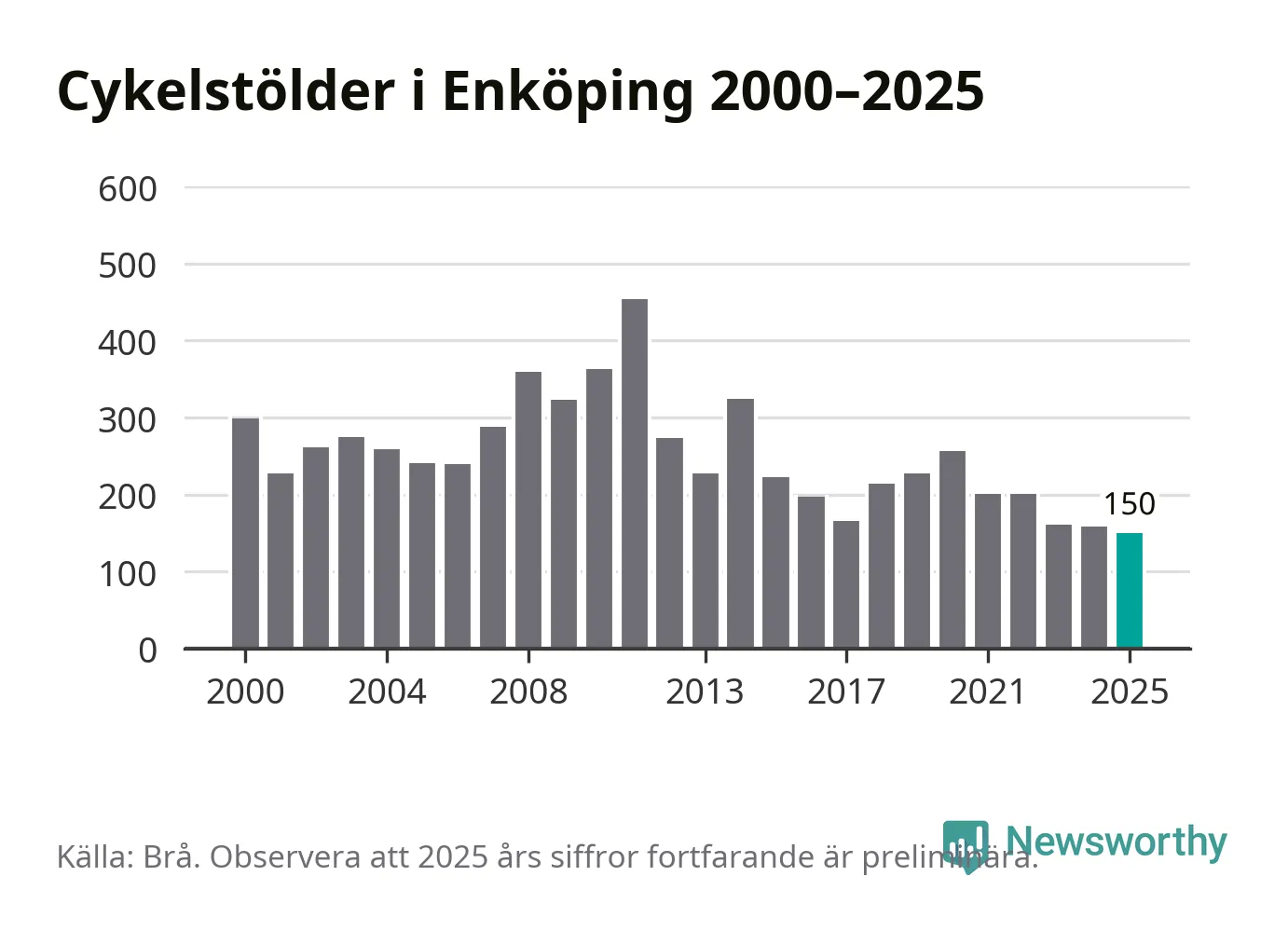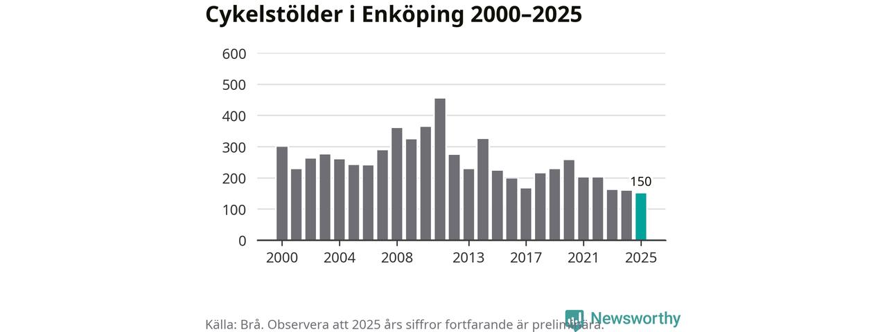 I Enköpings kommun noterades det lägsta antalet cykelstölder under hela 2000-talet år 2025, även om det fortfarande är preliminära siffror. Under de senaste 25 åren har det som mest anmälts 454 cykelstölder på ett år (2011).