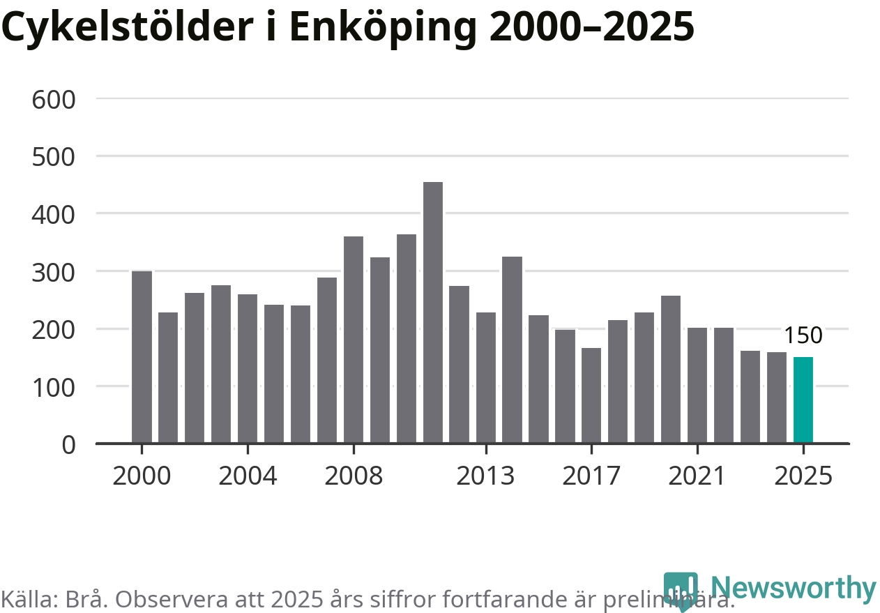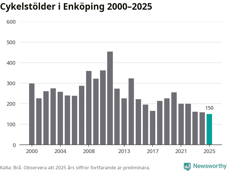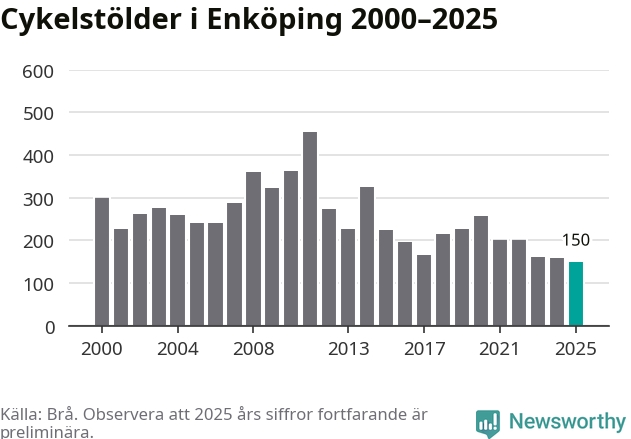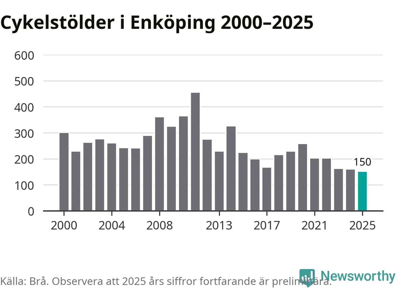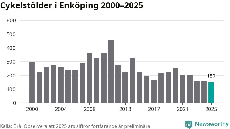 I Enköpings kommun noterades det lägsta antalet cykelstölder under hela 2000-talet år 2025, även om det fortfarande är preliminära siffror. Under de senaste 25 åren har det som mest anmälts 454 cykelstölder på ett år (2011).