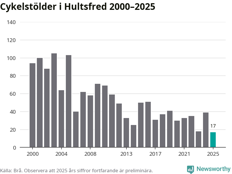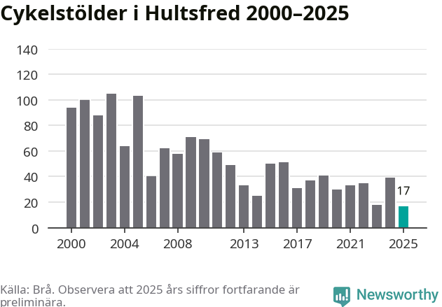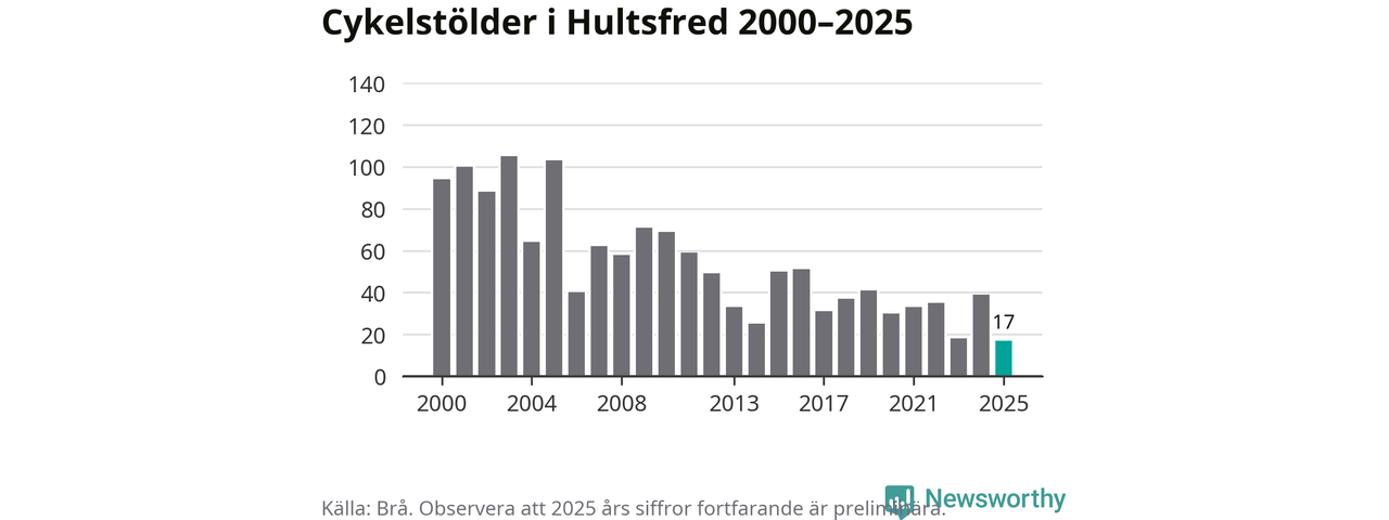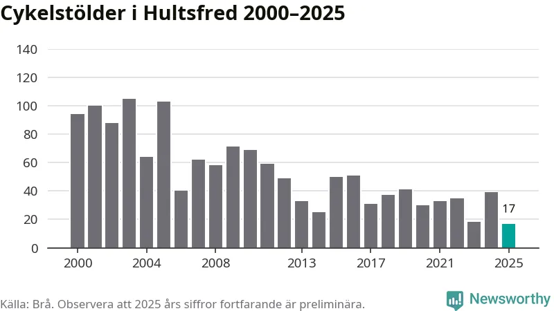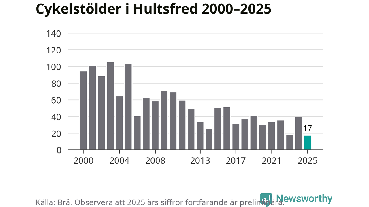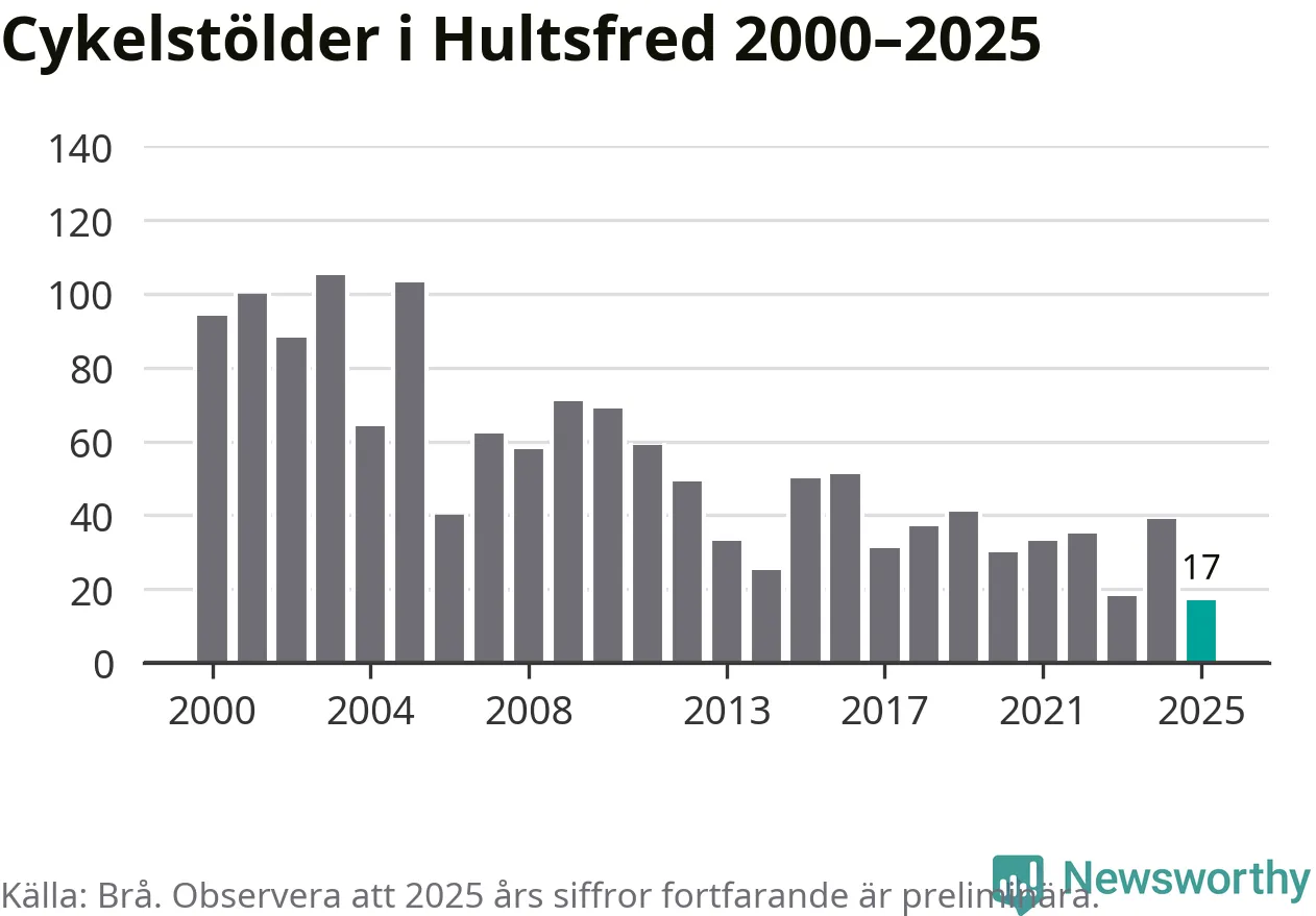 I Hultsfreds kommun noterades det lägsta antalet cykelstölder under hela 2000-talet år 2025, även om det fortfarande är preliminära siffror. Under de senaste 25 åren har det som mest anmälts 105 cykelstölder på ett år (2003).