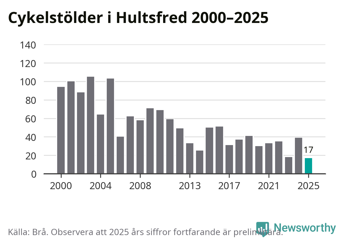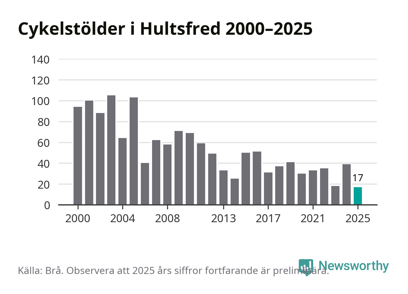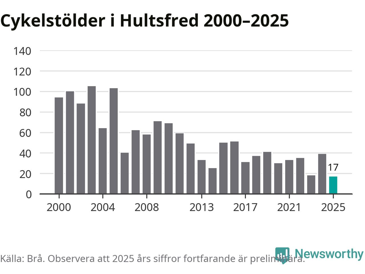 I Hultsfreds kommun noterades det lägsta antalet cykelstölder under hela 2000-talet år 2025, även om det fortfarande är preliminära siffror. Under de senaste 25 åren har det som mest anmälts 105 cykelstölder på ett år (2003).