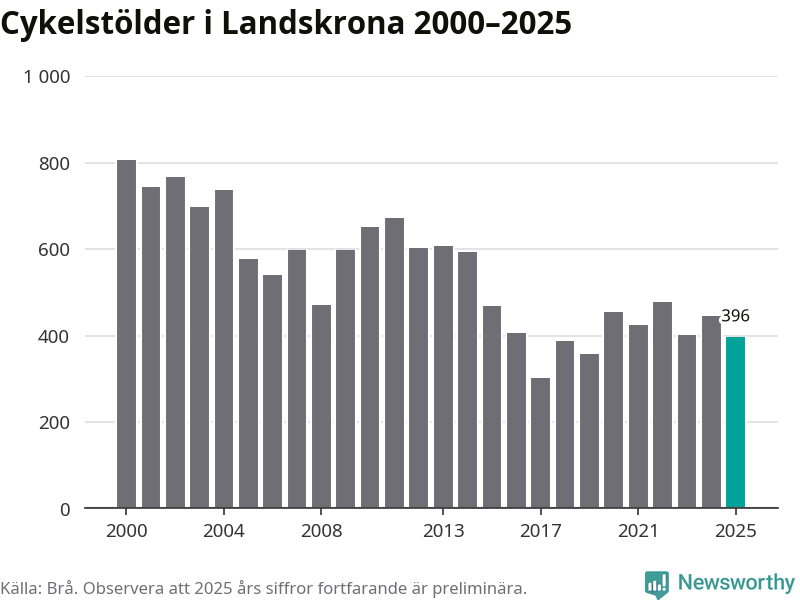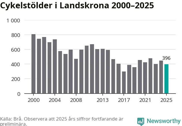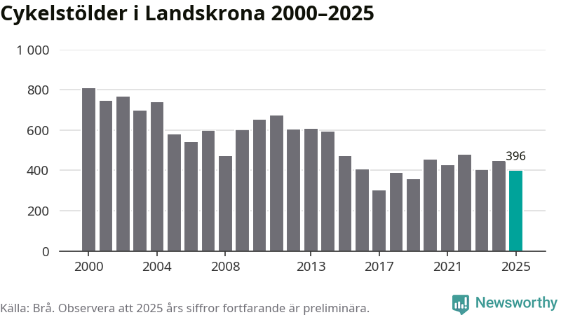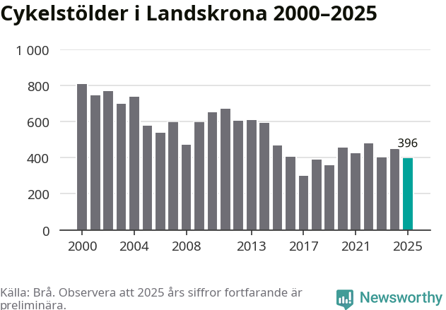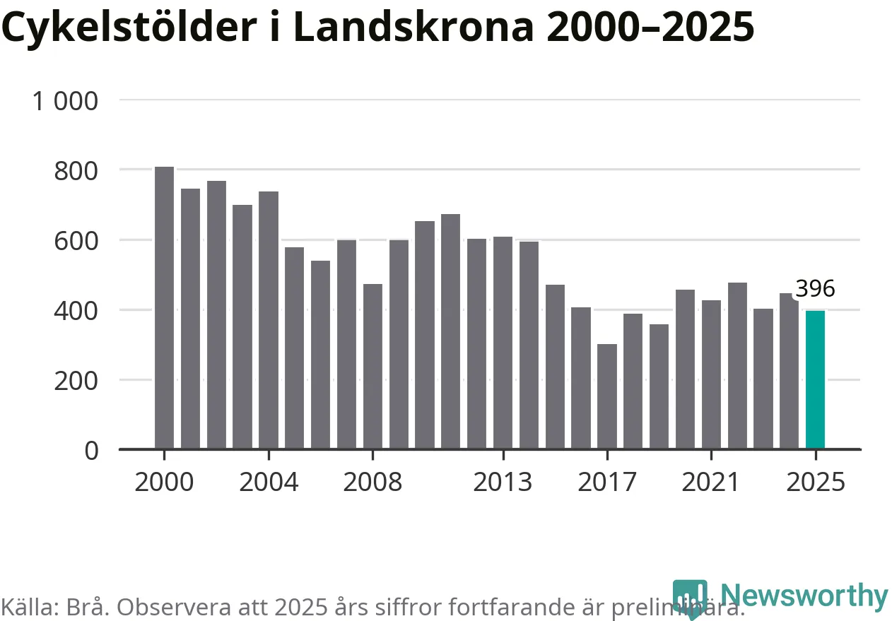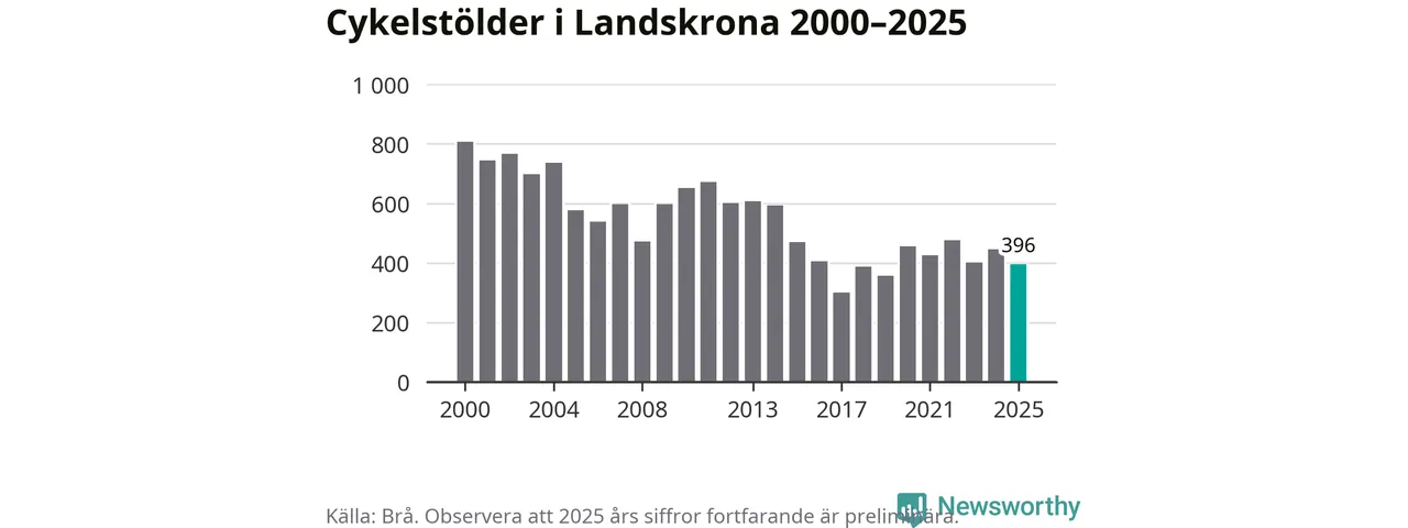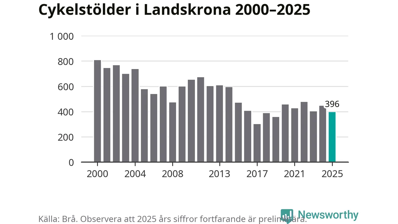 I Landskrona kommun var antalet cykelstölder relativt få i en historisk kontext år 2025, även om det fortfarande är preliminära siffror. Under de senaste 25 åren har det som mest anmälts 806 cykelstölder på ett år (2000), som minst 301 stycken (2017).