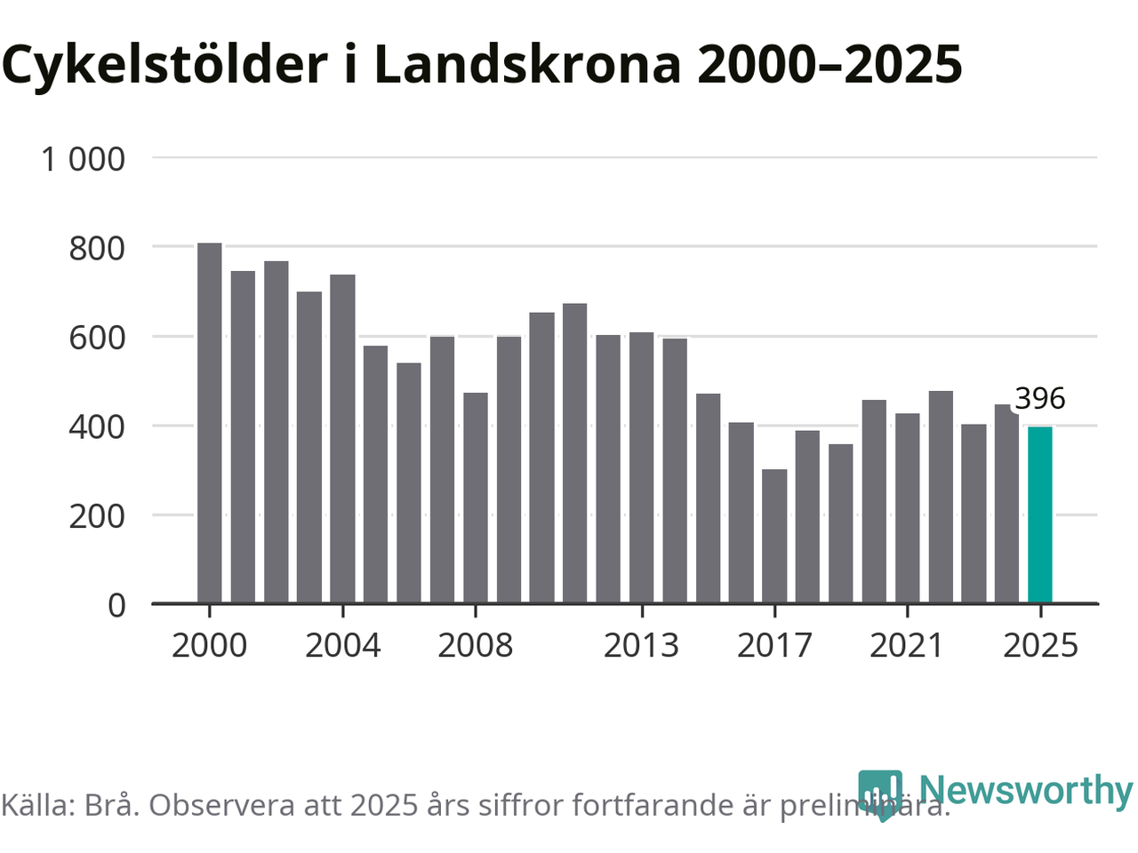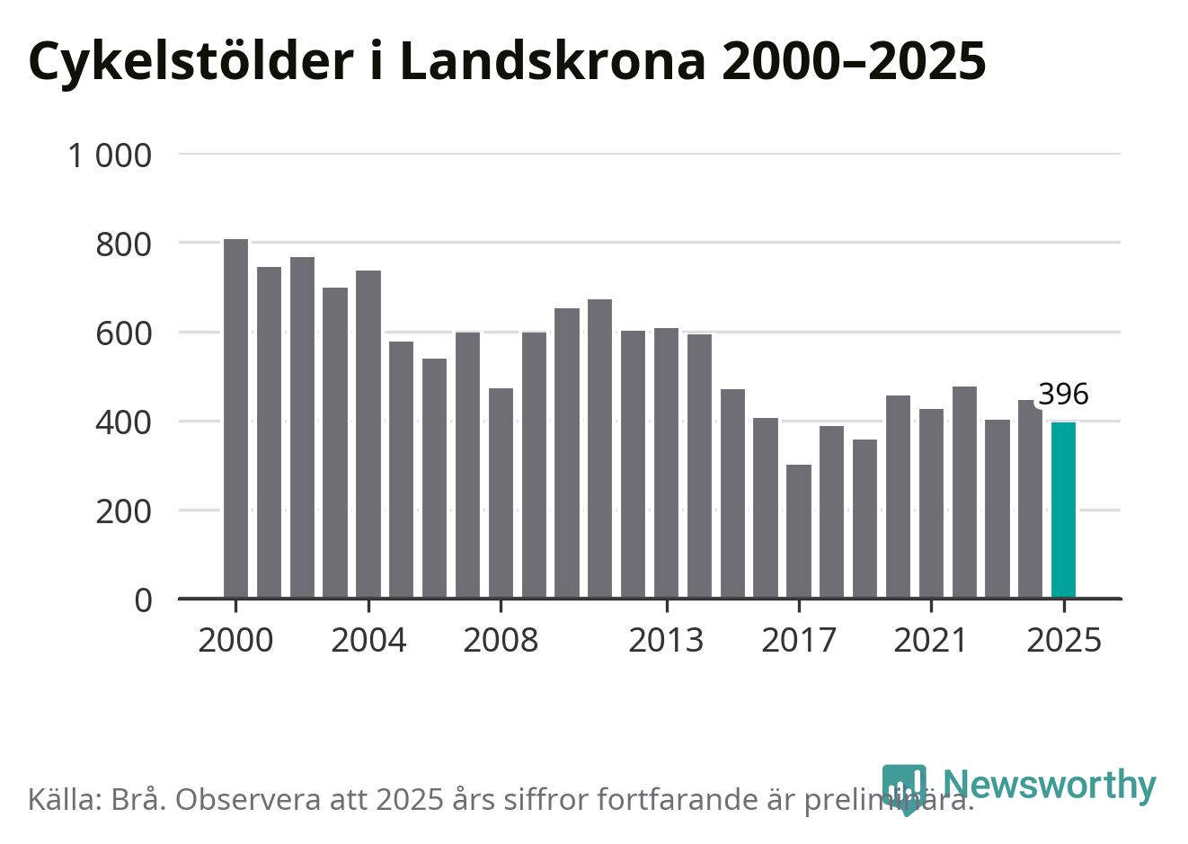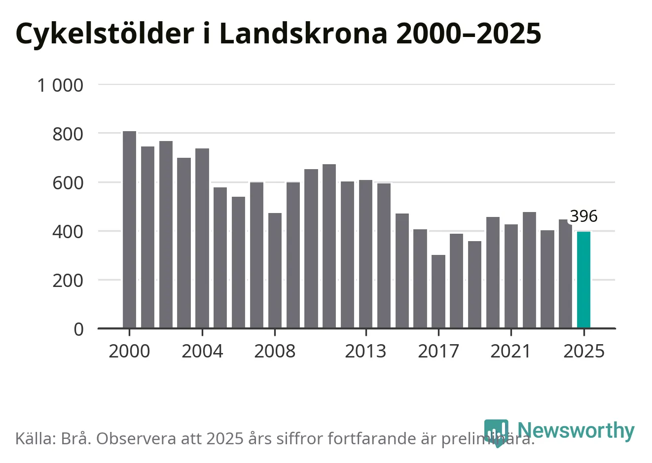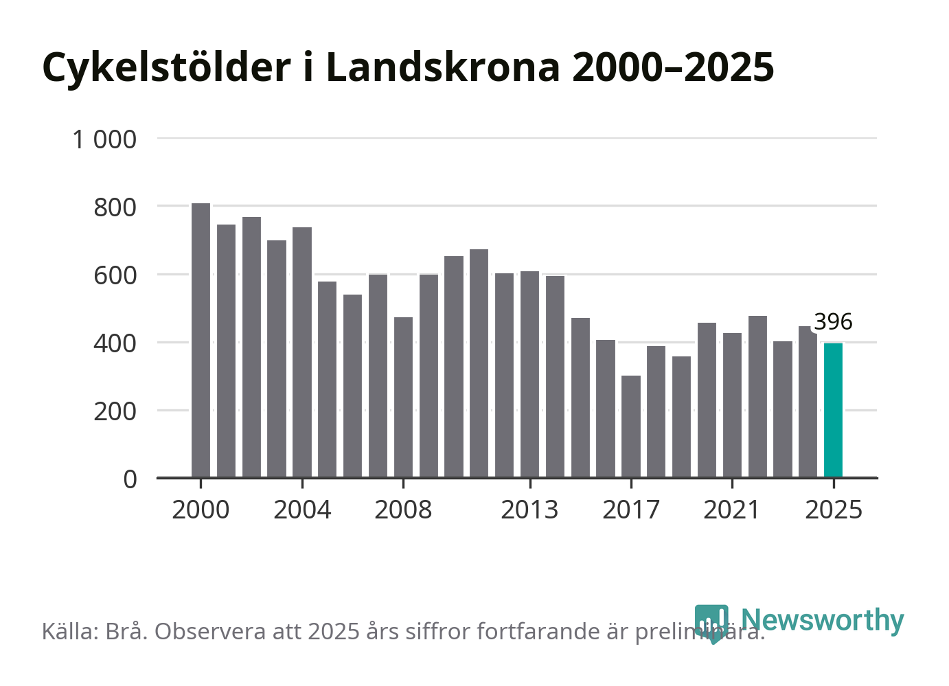 I Landskrona kommun var antalet cykelstölder relativt få i en historisk kontext år 2025, även om det fortfarande är preliminära siffror. Under de senaste 25 åren har det som mest anmälts 806 cykelstölder på ett år (2000), som minst 301 stycken (2017).