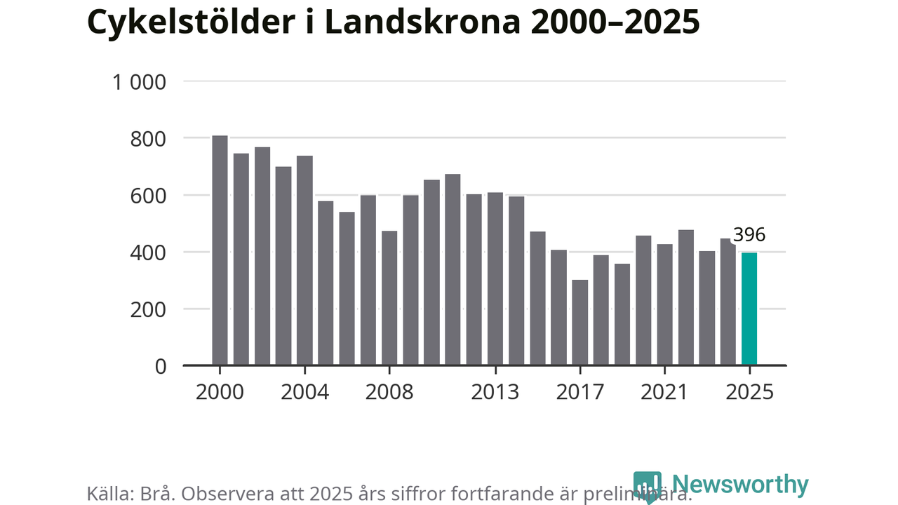 Av de 396 stöldanmälningar i Landskrona 2025 gällde 150 elcyklar, det motsvarar 38 procent. Brå särredovisar elcyklar sedan 2020 och i riket som helhet ökade anmälningarna om stulna elcyklar kraftigt de första åren, för att de senaste tre åren ha legat relativt stilla. Eftersom antalet cykelstölder totalt har minskat under samma tid har andelen elcyklar ökat. I fjol stod elcyklar för 28 procent av alla anmälda cykelstölder i landet.